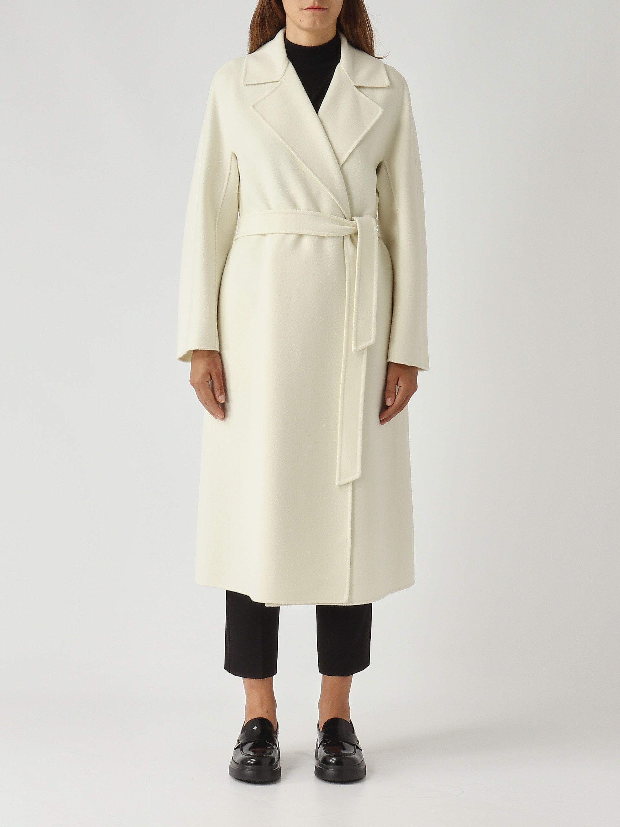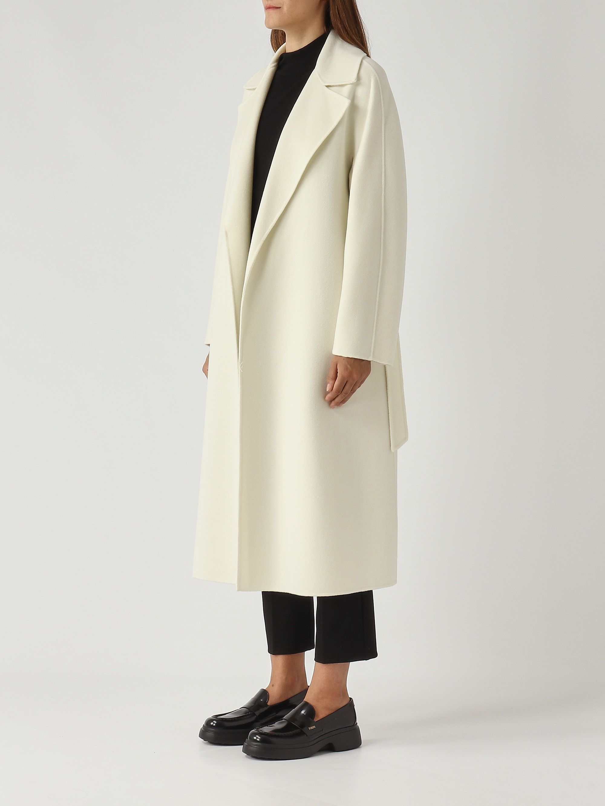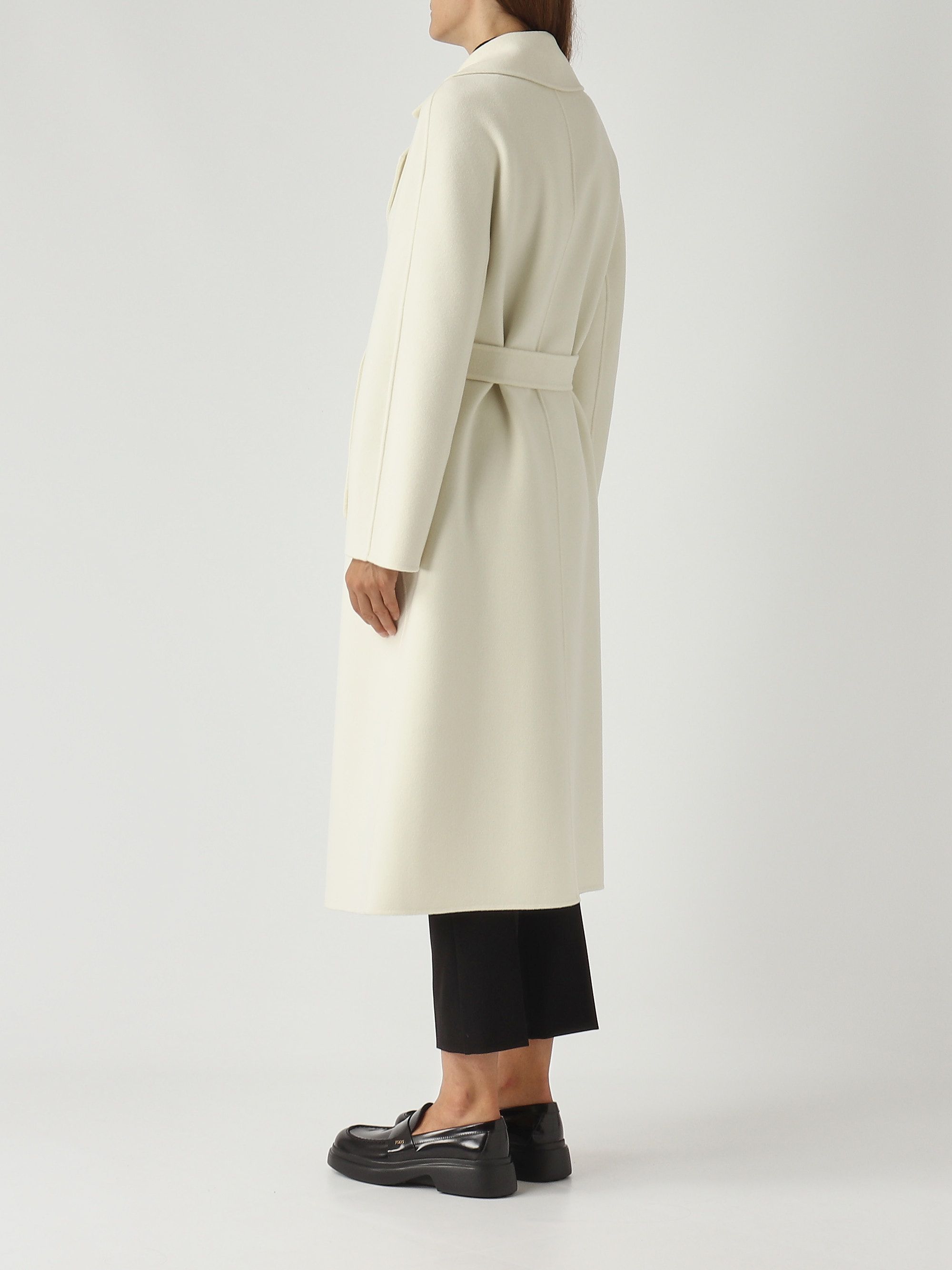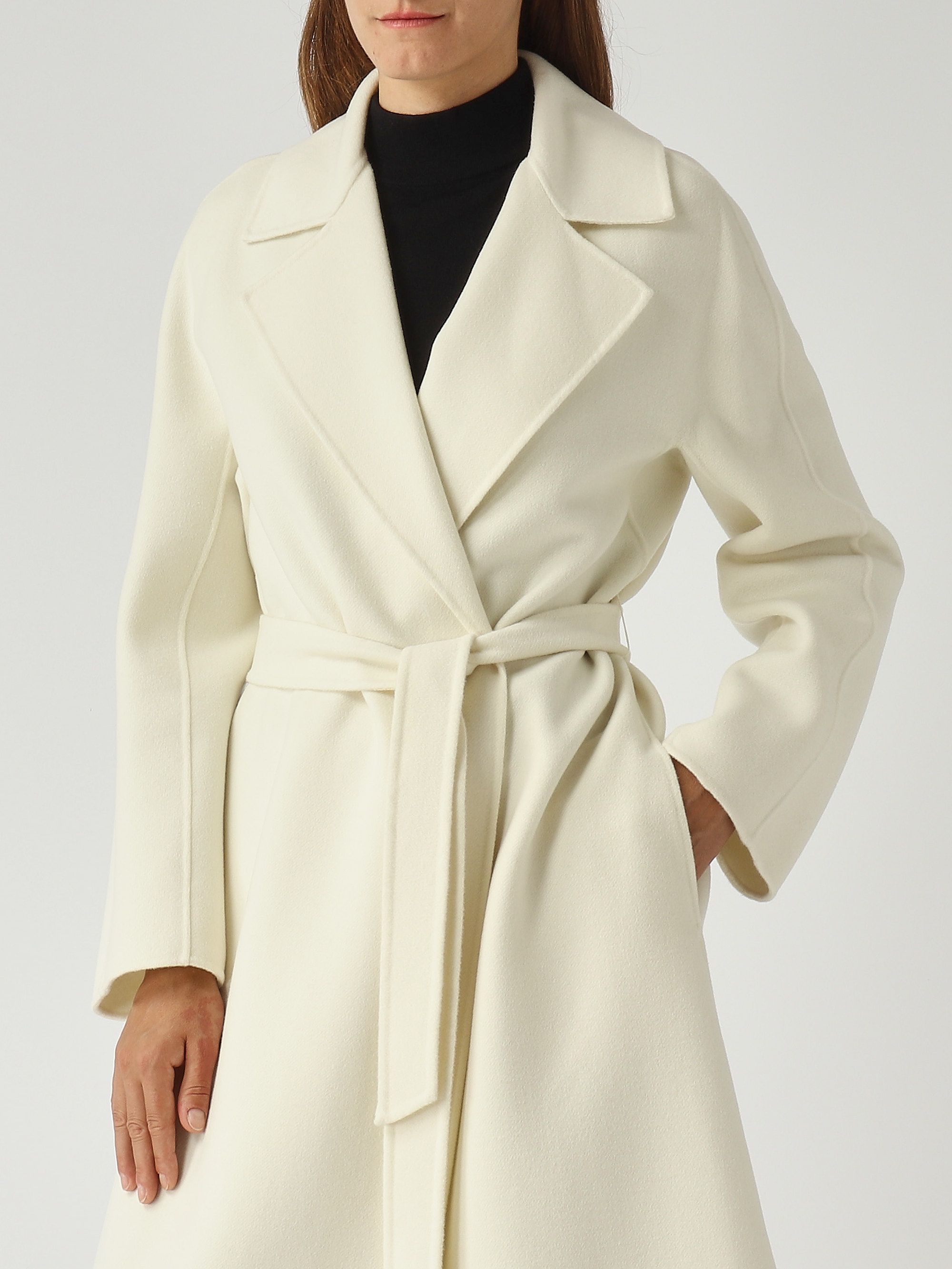 Dieser Midimantel hat eine Wickeloptik, um die Silhouette zu betonen. Er wurde aus einem doppelten Faltenwurf aus Wolle, Kaschmir und Seide gefertigt, von Hand genäht und verfügt über einen Reverskragen, lange Kimonoärmel, einen passenden Gürtelverschluss und Schlitztaschen an der Hüfte.