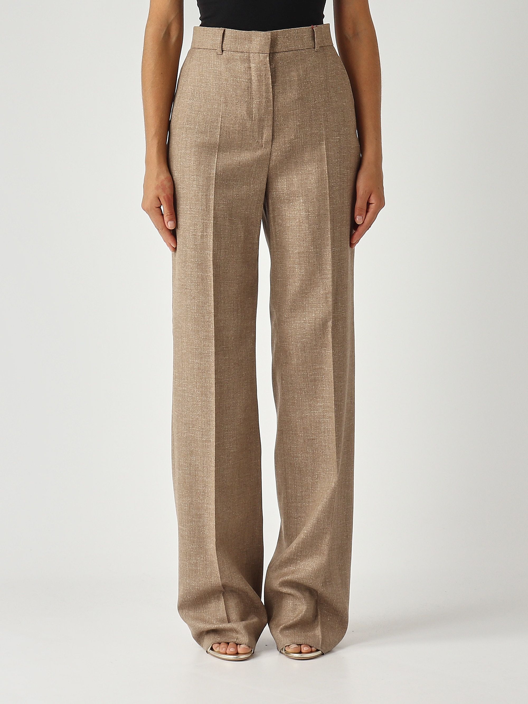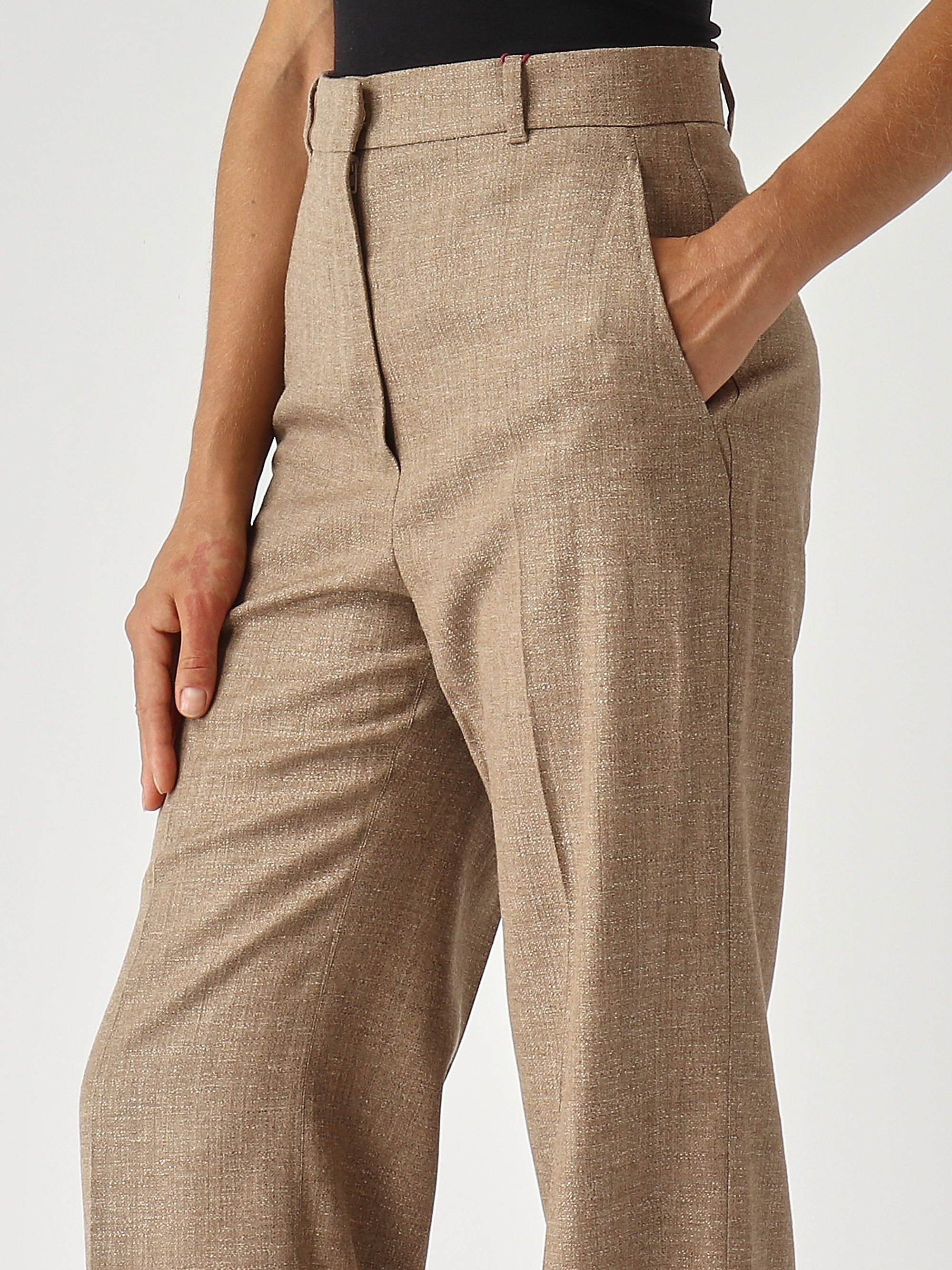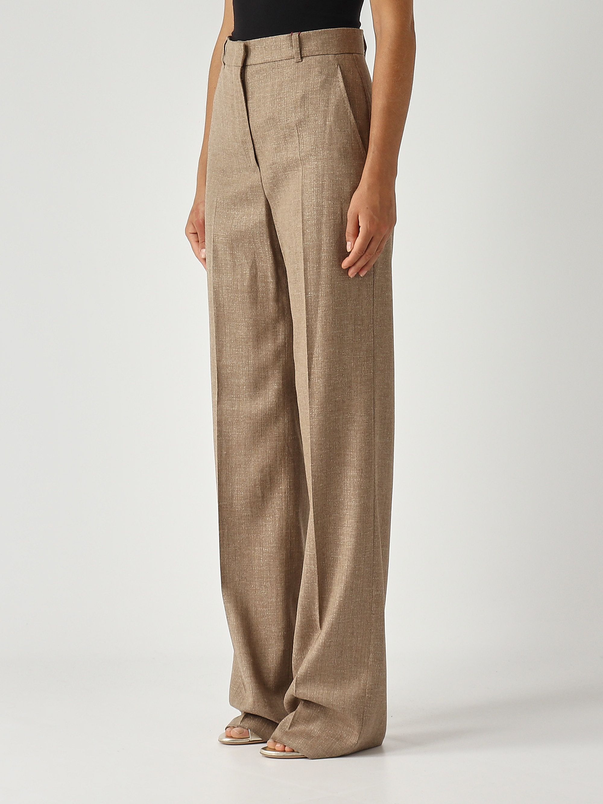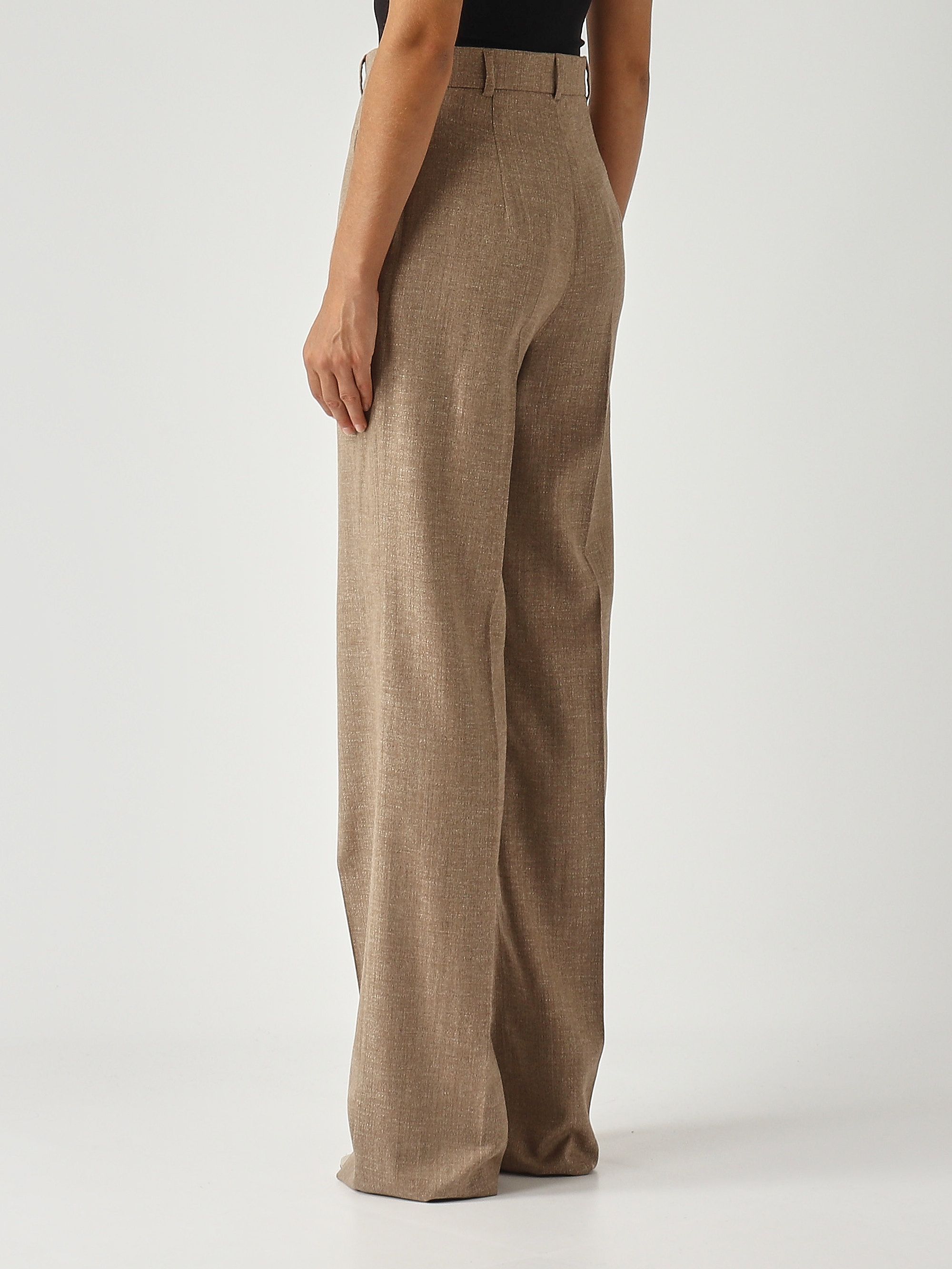 Diese Hose mit geradem Bein und hoher Taille zeichnet sich durch ihren eleganten Charme aus. Sie ist aus einer Woll-Leinen-Mischung in Batavia gefertigt, einer Art von Textilbindung, die dem Kleidungsstück eine leichte diagonale Streifung verleiht. Sie verfügt über einen hochgezogenen Bund, einen Reißverschluss mit Patte und Haken, Schrägbandtaschen an der Hüfte, eine Bügelfalte am vorderen und hinteren Bein sowie Gürtelschlaufen.