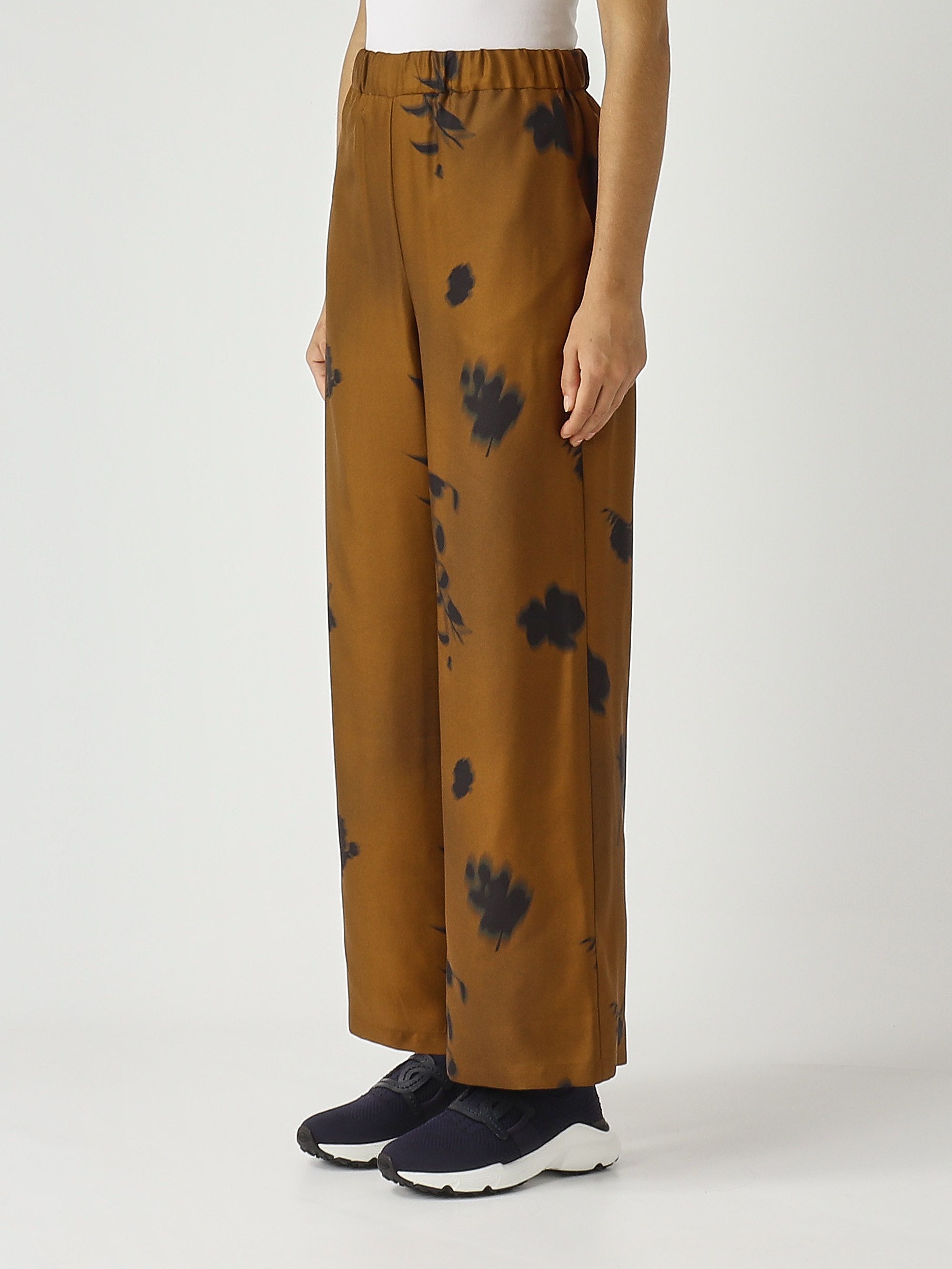 Entdecken Sie Weiblichkeit und Eleganz mit der Helga MM Max Mara Hose aus weicher Seide, sie hat einen praktischen elastischen Bund, amerikanische Taschen und ein kontrastierendes Blumenmuster.