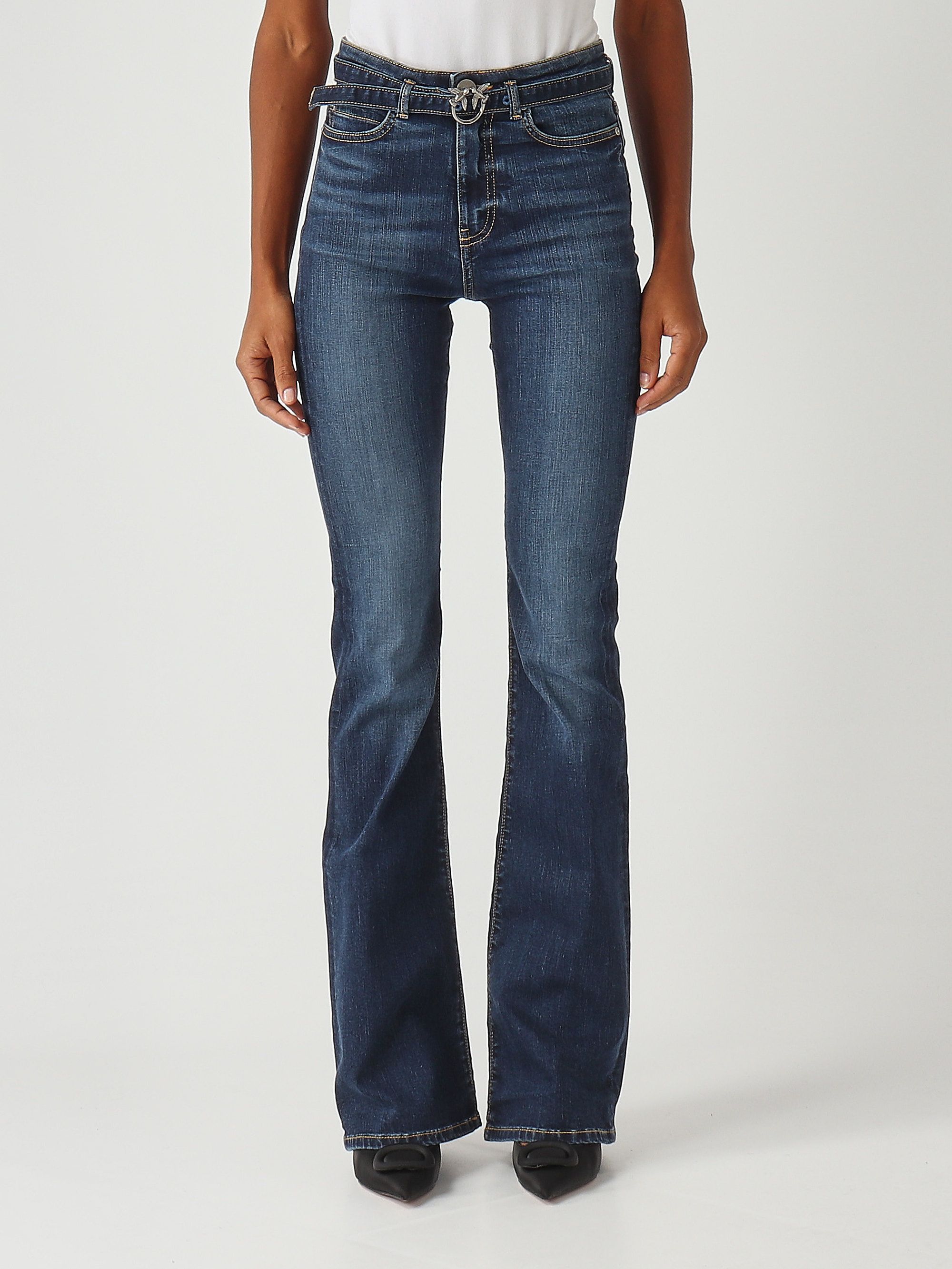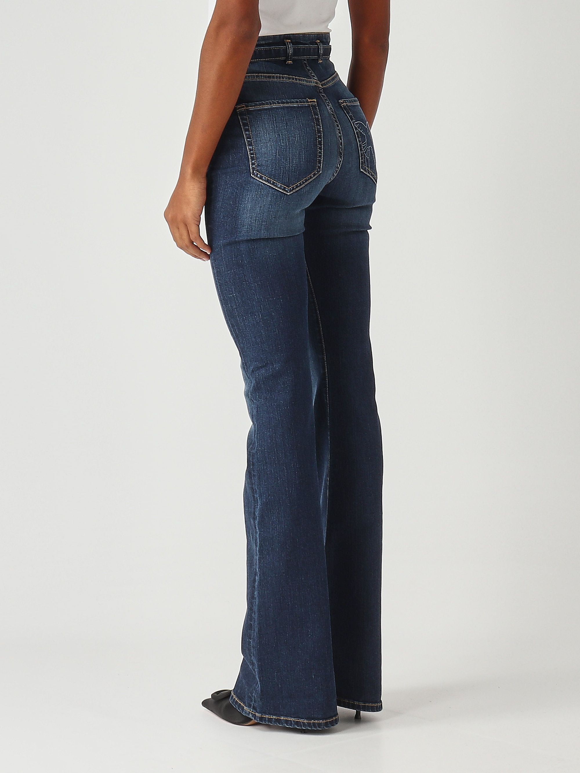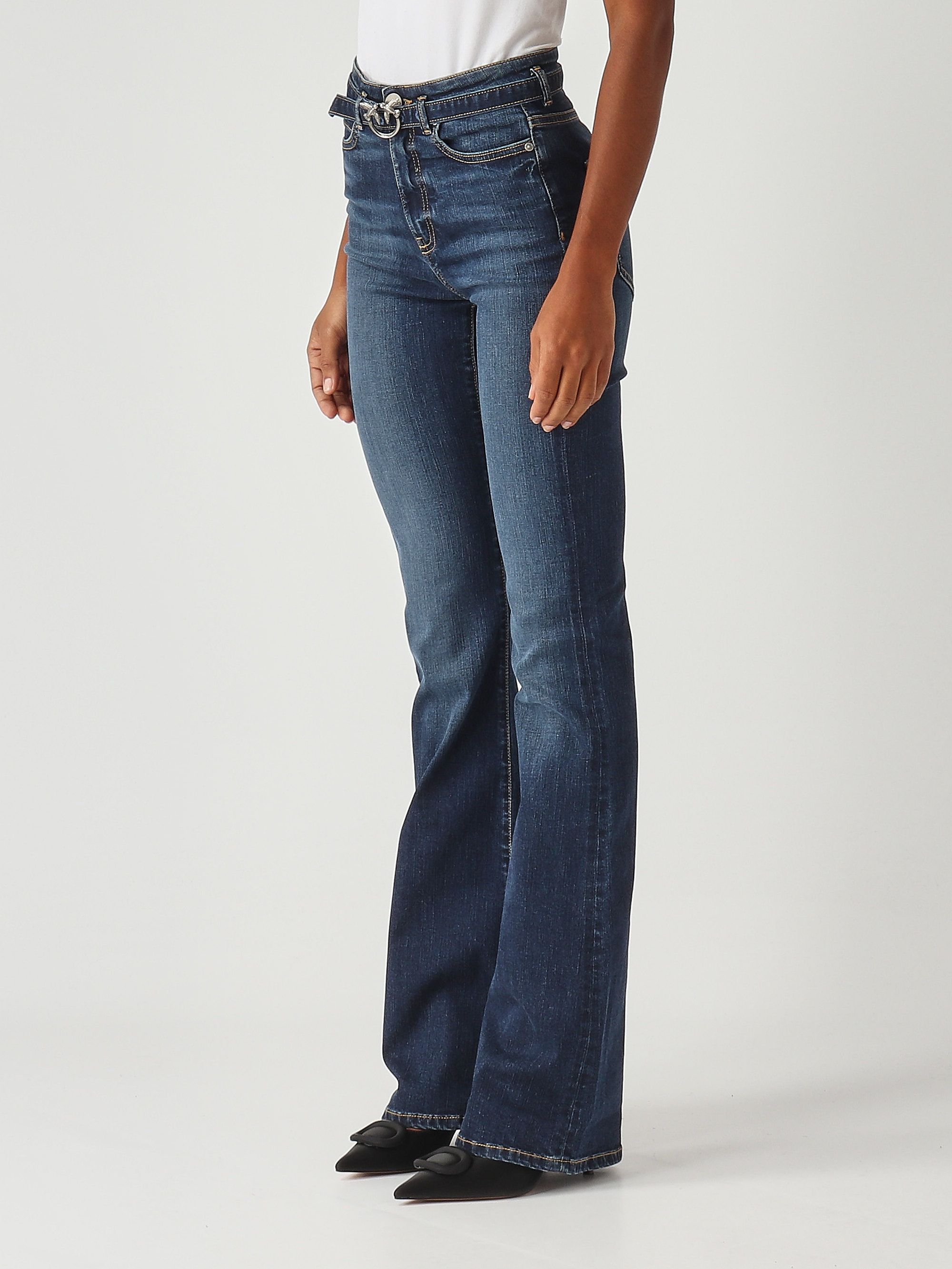 Die Besonderheit dieser Jeans liegt im Stoff: Es handelt sich um einen high-recovery-Denim, der sich nicht leicht verformt und seine ursprüngliche Form über die Zeit beibehält. Die Jeans zeichnen sich auch durch ihr flared fit Design aus, mit einer Passform, die bis zum Knie eng ist und sich unten ausweitet.