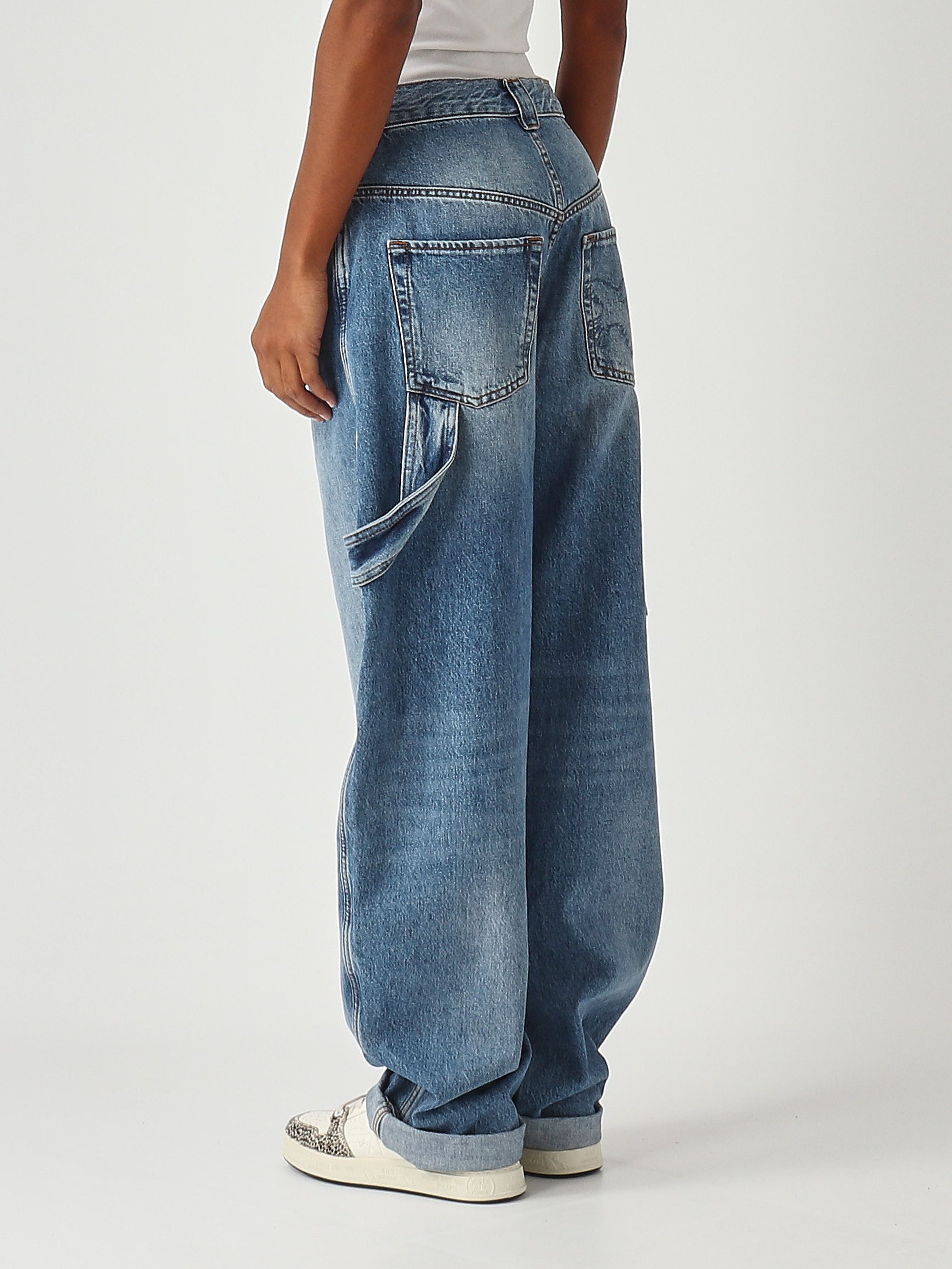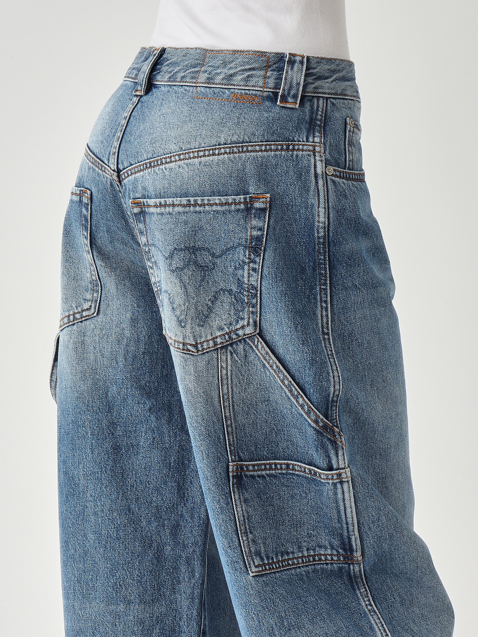 Füge deiner Kollektion ein Paar Workwear-Stil Jeans hinzu. Pinko bietet eine Ballon-Passform-Version mit Ballon-Bein, weich und abgerundet vom Oberschenkel bis zum Knöchel und enger am unteren Ende, wo ein umgeschlagener Saum sitzt. Der Stoff wurde mit speziellen Techniken behandelt, um einen Vintage-Look zu erzielen. Das Design ist zudem durch einen passenden Streifen, der an das linke Bein genäht ist, individualisiert.