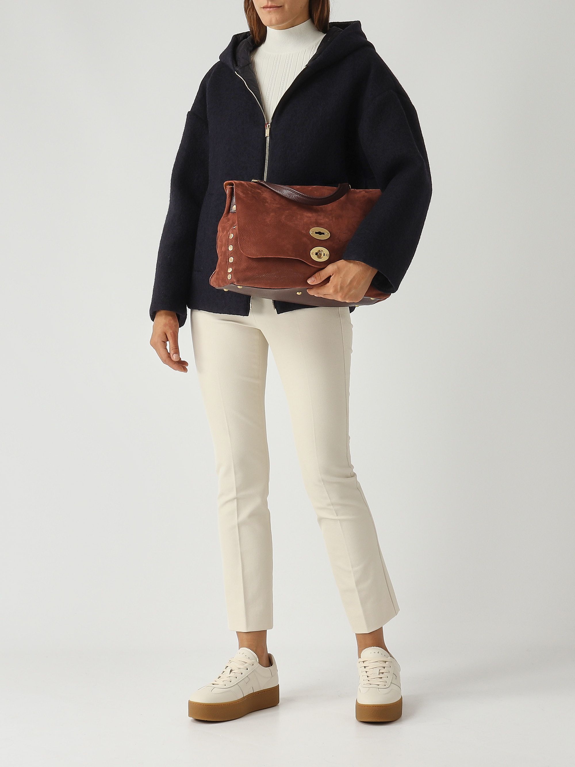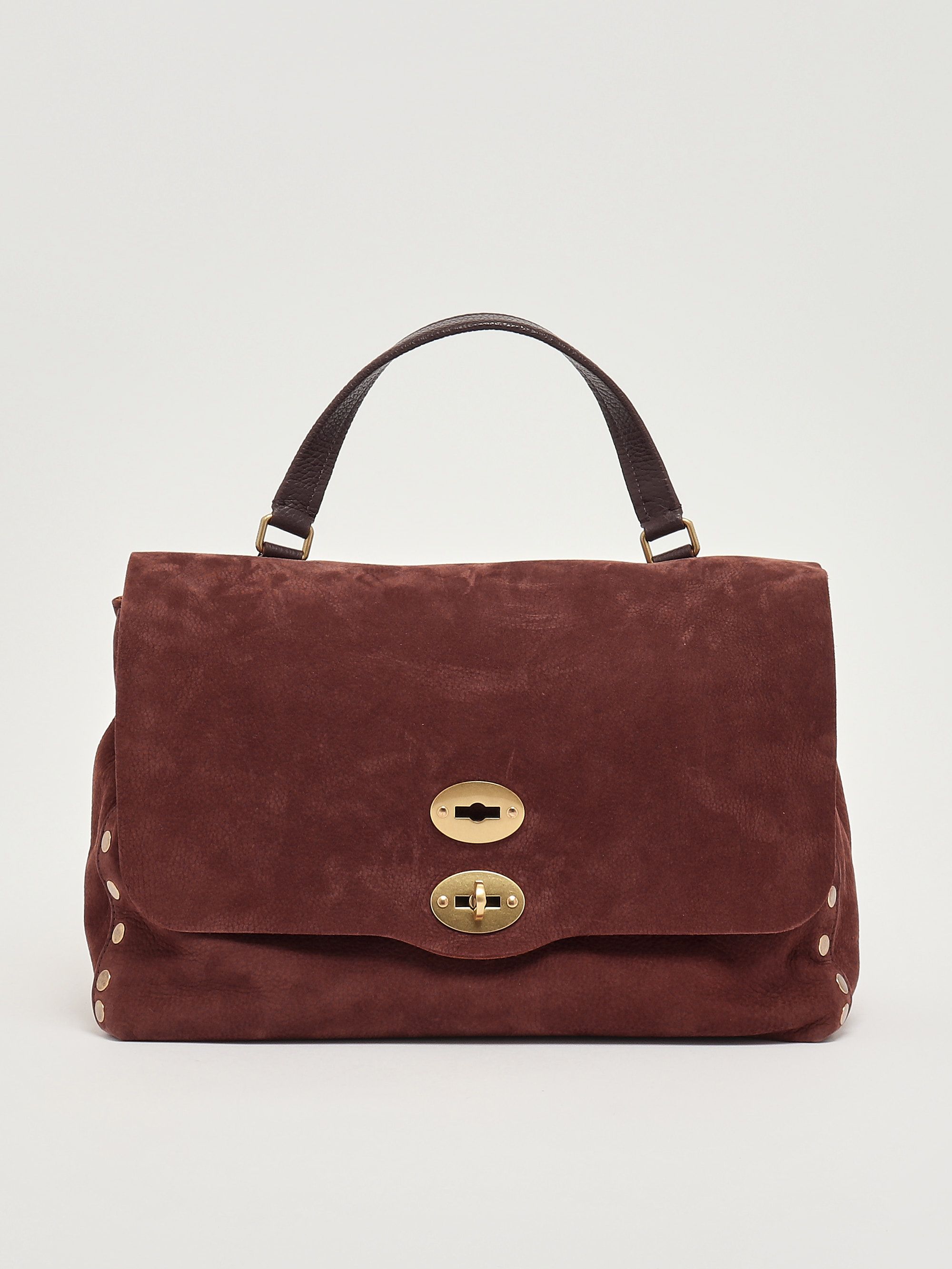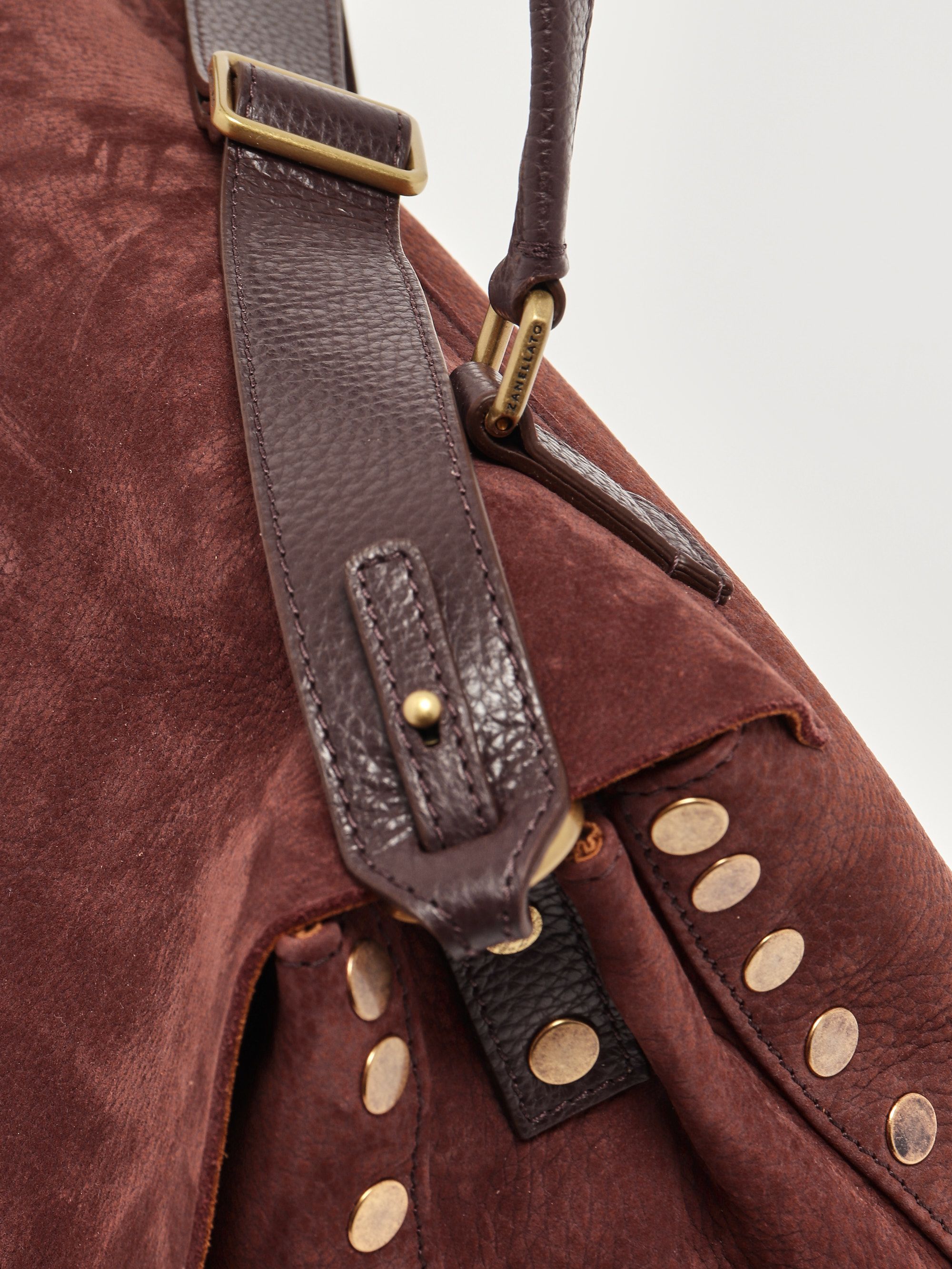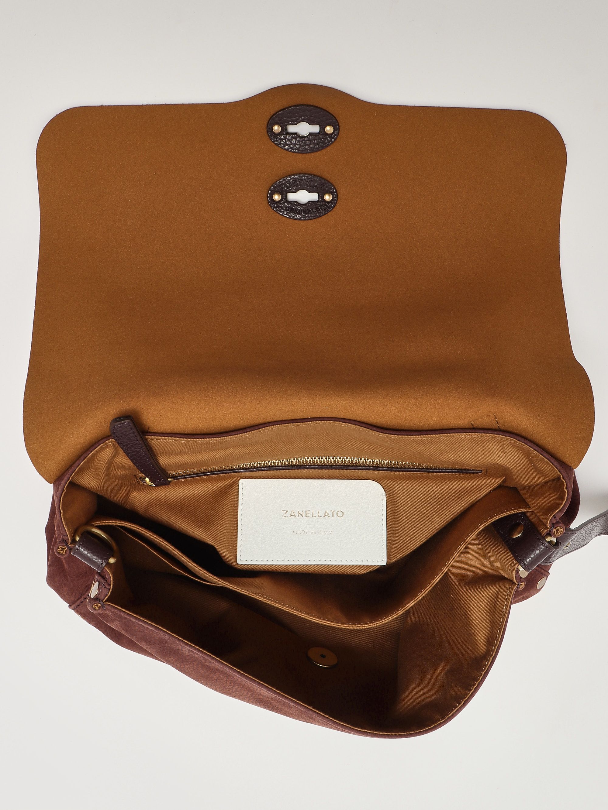 In jeder Zanellato-Tasche steckt Handwerkskunst mit kleinen, aber feinen Details. Das ikonische Modell Postina mit seiner rechteckigen oder leicht trapezförmigen Form ist aus einem einzigartigen und unverwechselbaren Leder gefertigt, das sich weich anfühlt. Die aus Wildleder und gehämmertem Leder gefertigte Postina Jones M verfügt über Nieten an den Profilen, einen Überschlag und einen Hakenverschluss, einen oberen Griff, einen abnehmbaren Schulterriemen, ein doppeltes Innenfach und ein praktisches Innenfach mit Reißverschluss.