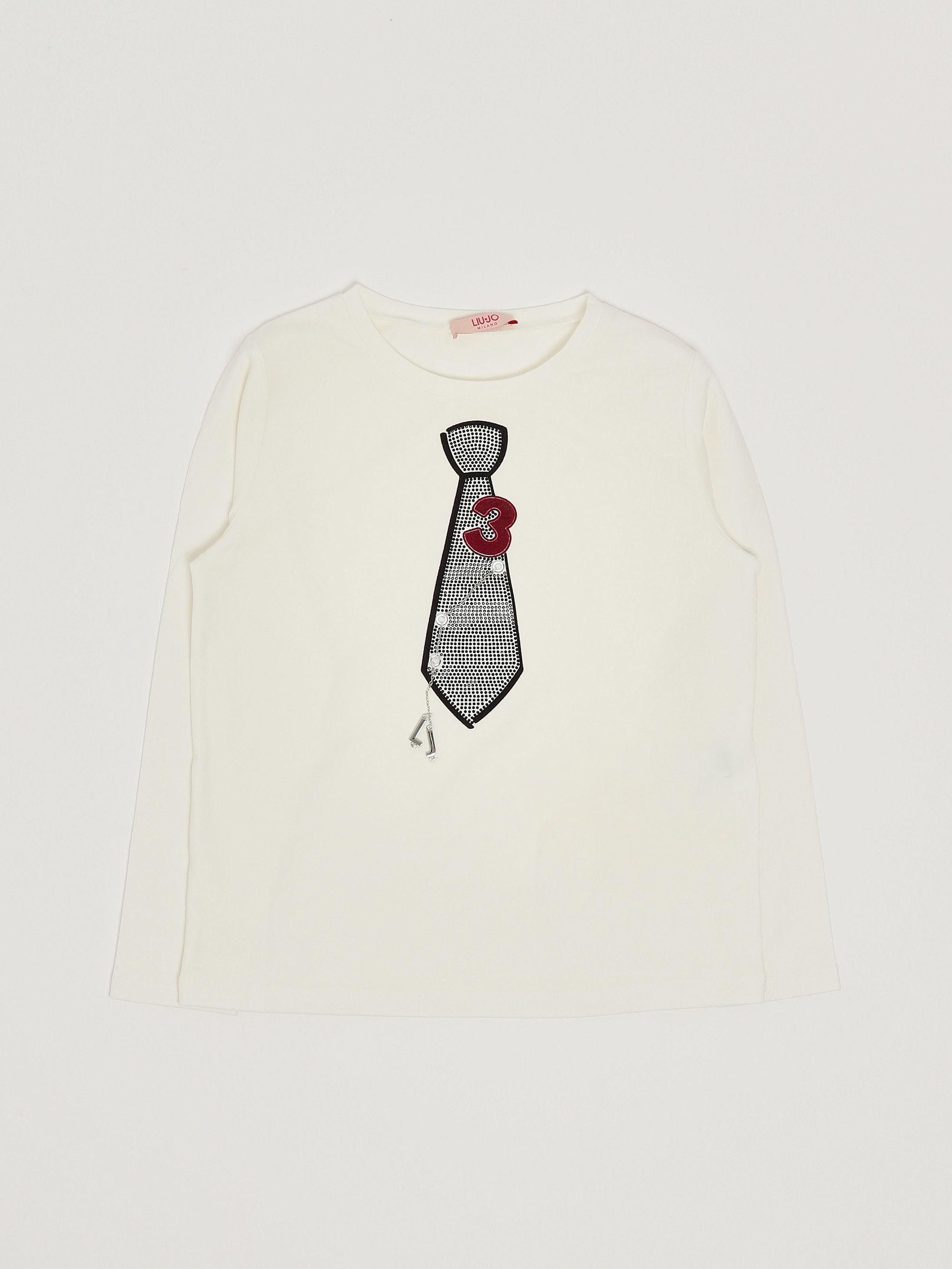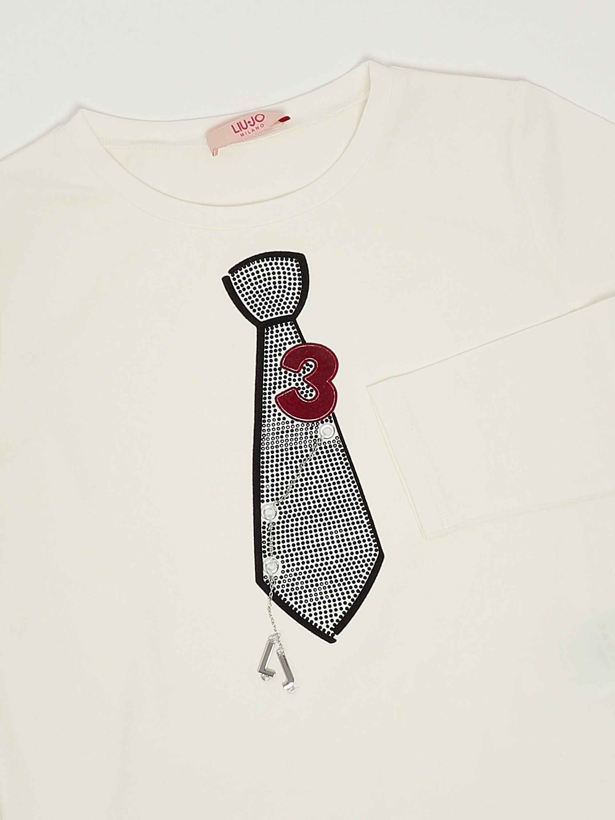 Dieses langärmelige T-Shirt mit Rundhalsausschnitt ist aus Stretch-Baumwolle gefertigt und hat einen Krawattenaufdruck mit Strasssteinen und einen Logoanhänger.