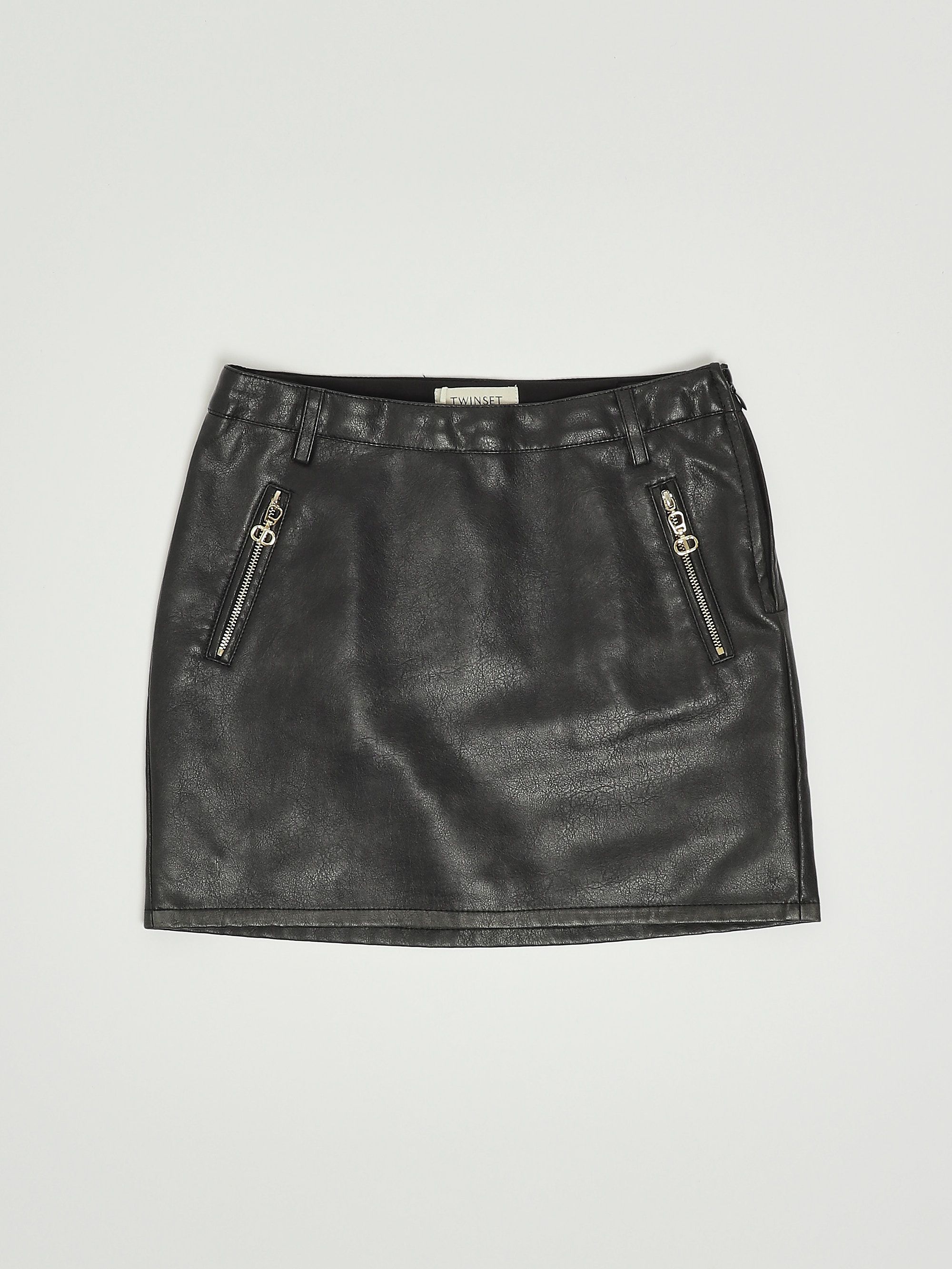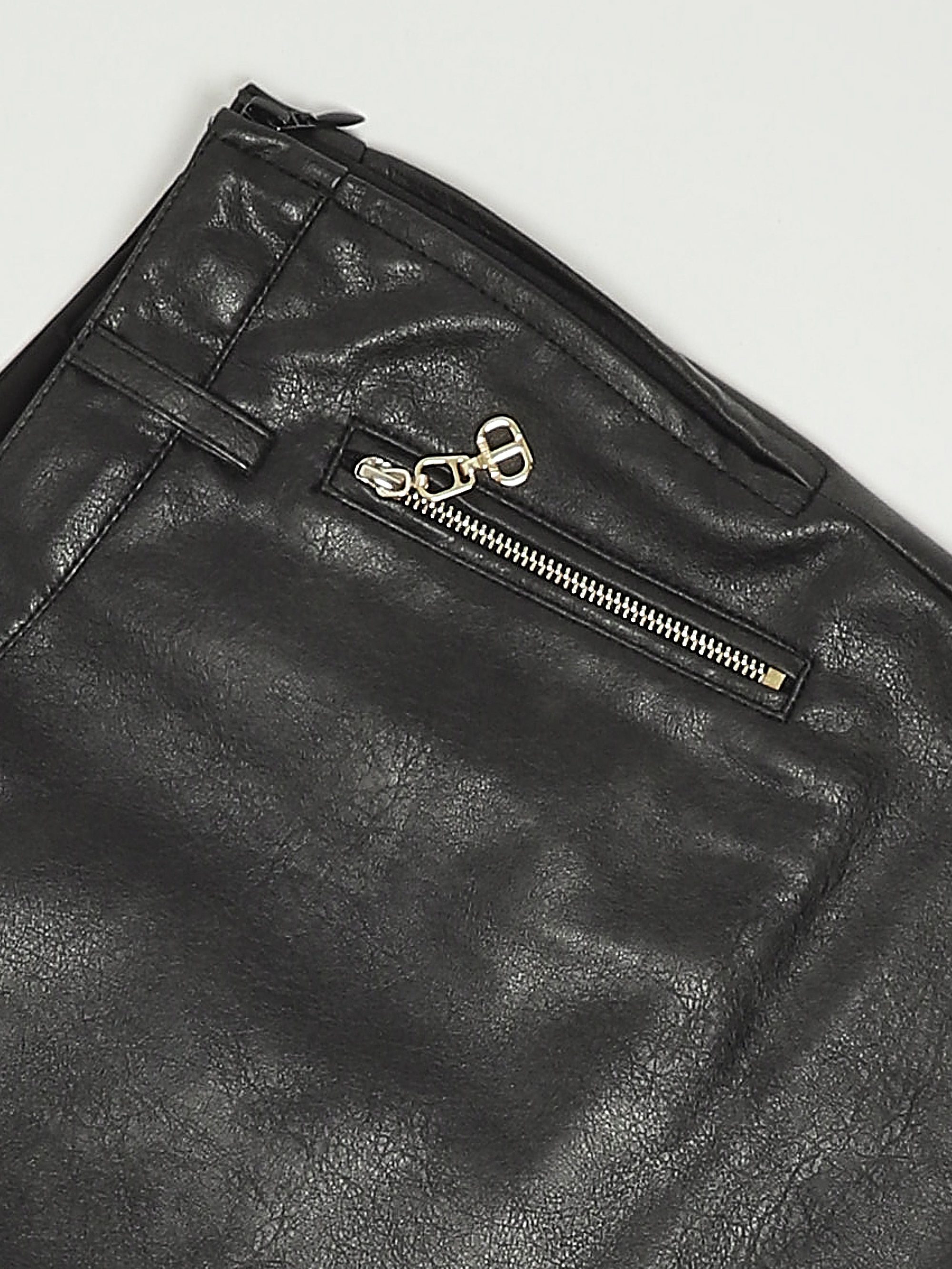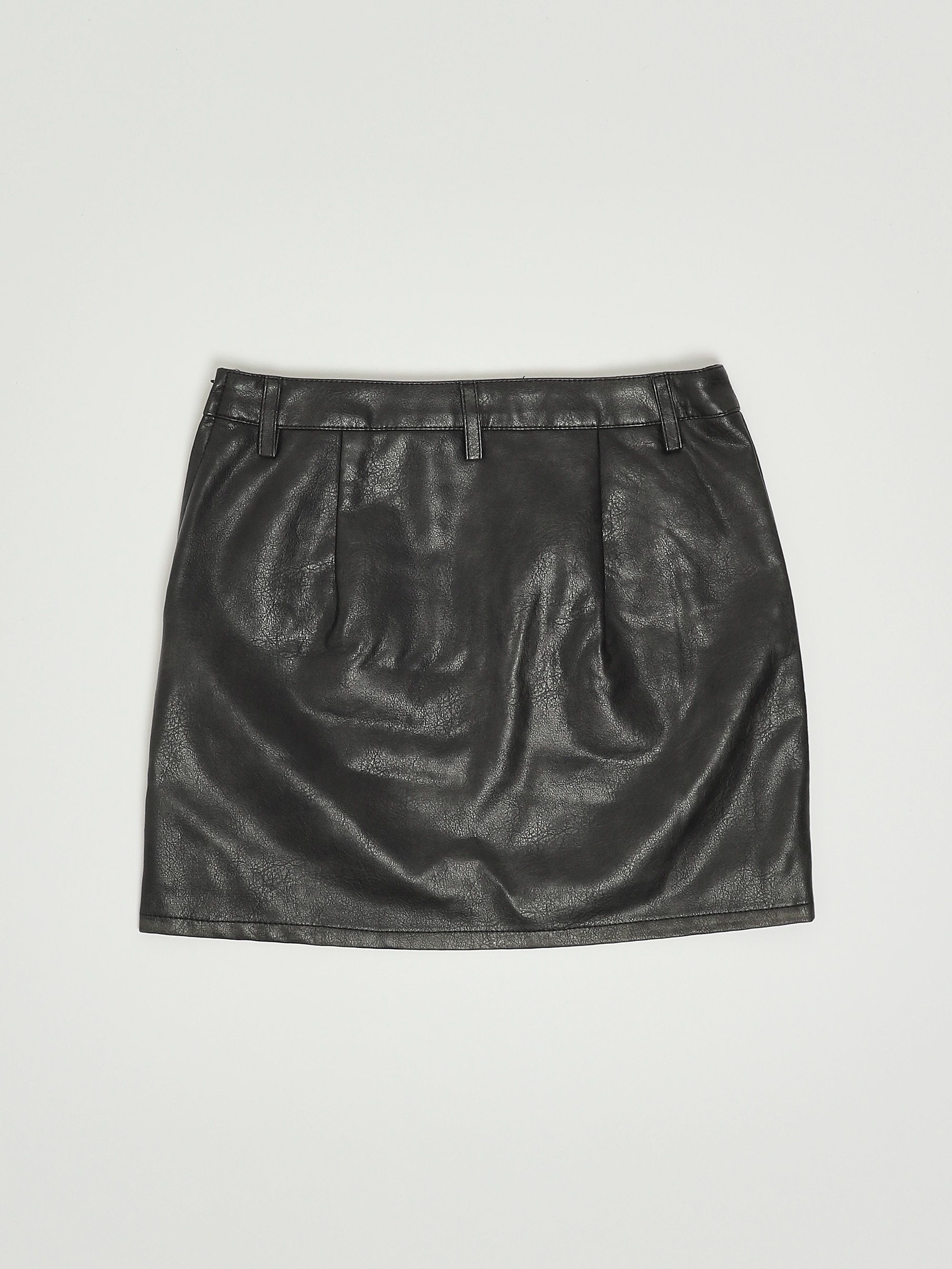 Dieser Rock aus Lederimitat im Vintage-Look hat Gürtelschlaufen an der Taille und zwei schräge Reißverschlusstaschen auf der Vorderseite.
