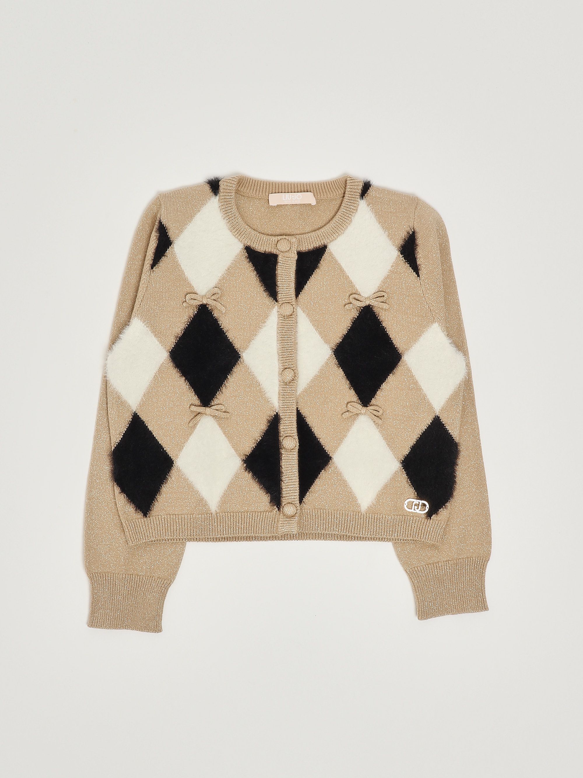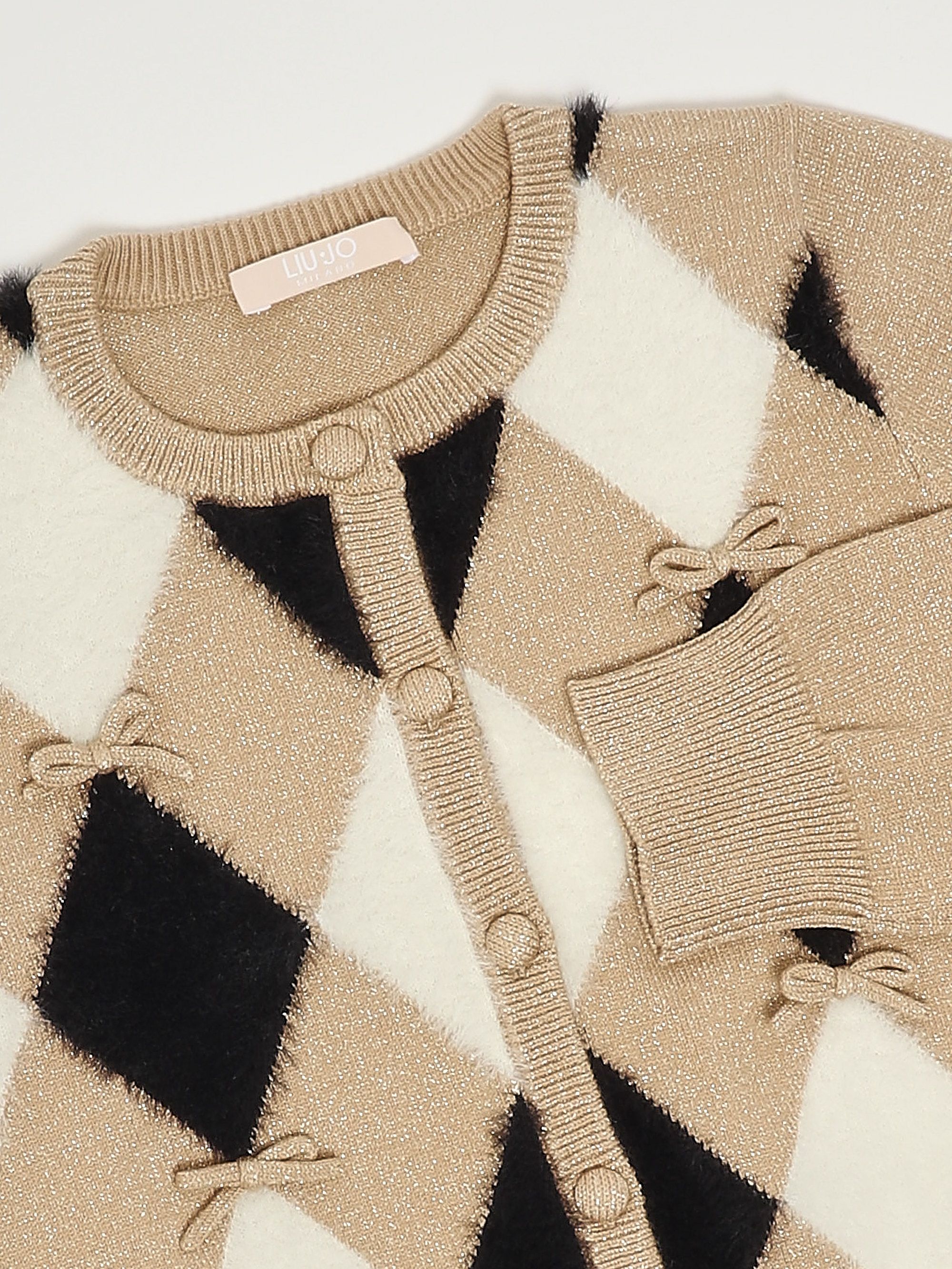 Die Linie Liu Jo Kids zielt darauf ab, die Eigenschaften jedes kleinen Mädchens hervorzuheben und aufzuwerten, von den eklektischsten und rebellischsten bis hin zu den modernsten und romantischsten, und bietet eine reiche Auswahl an bequemen Passepartout-Teilen, die mit besonderen Details angereichert sind. Diese langärmelige Strickjacke mit Rundhalsausschnitt ist aus einer Stretch-Viskosemischung gefertigt und hat einen Lurex-Strick mit geometrischem Rautenmuster, einen Knopfverschluss vorne, Mini-Schleifen auf der Vorderseite sowie einen gerippten Saum und gerippte Bündchen.