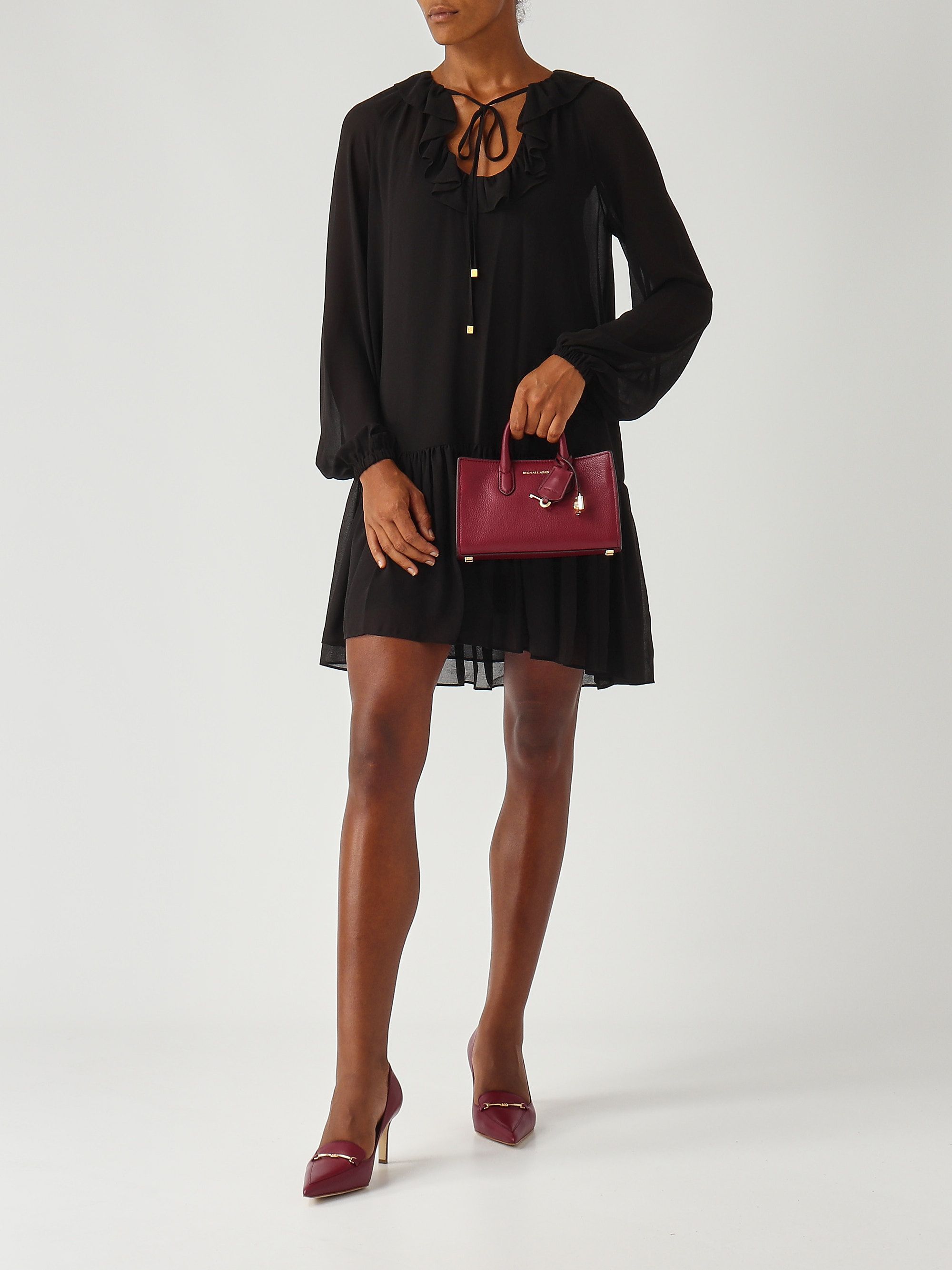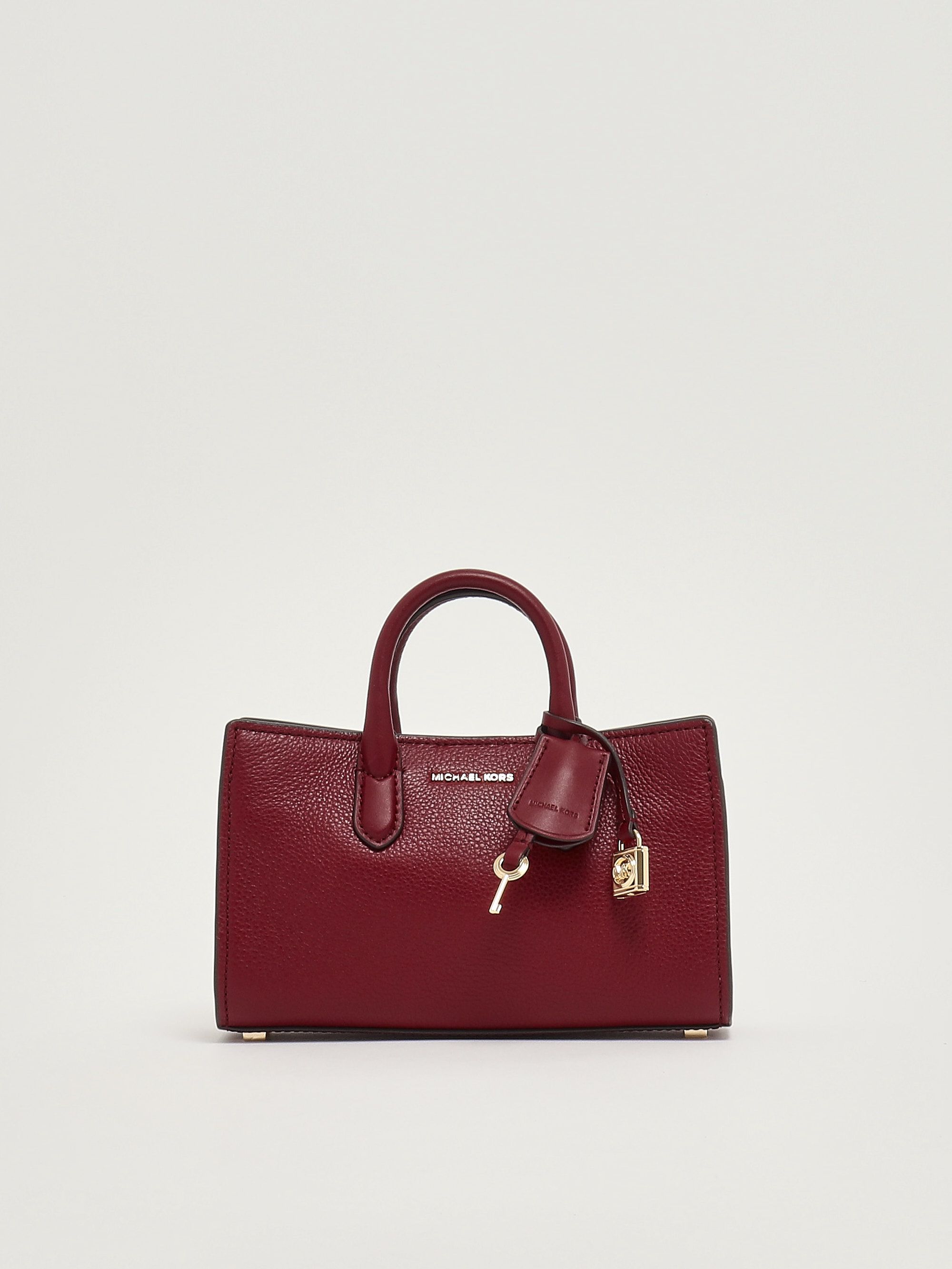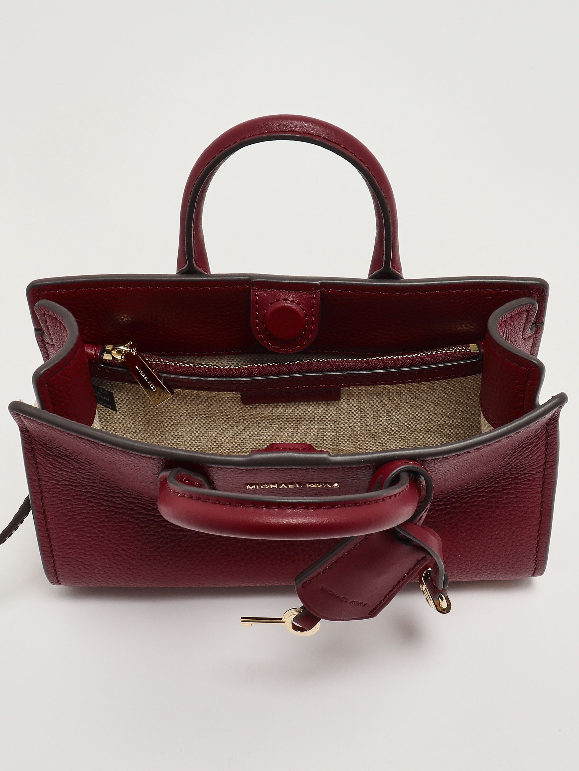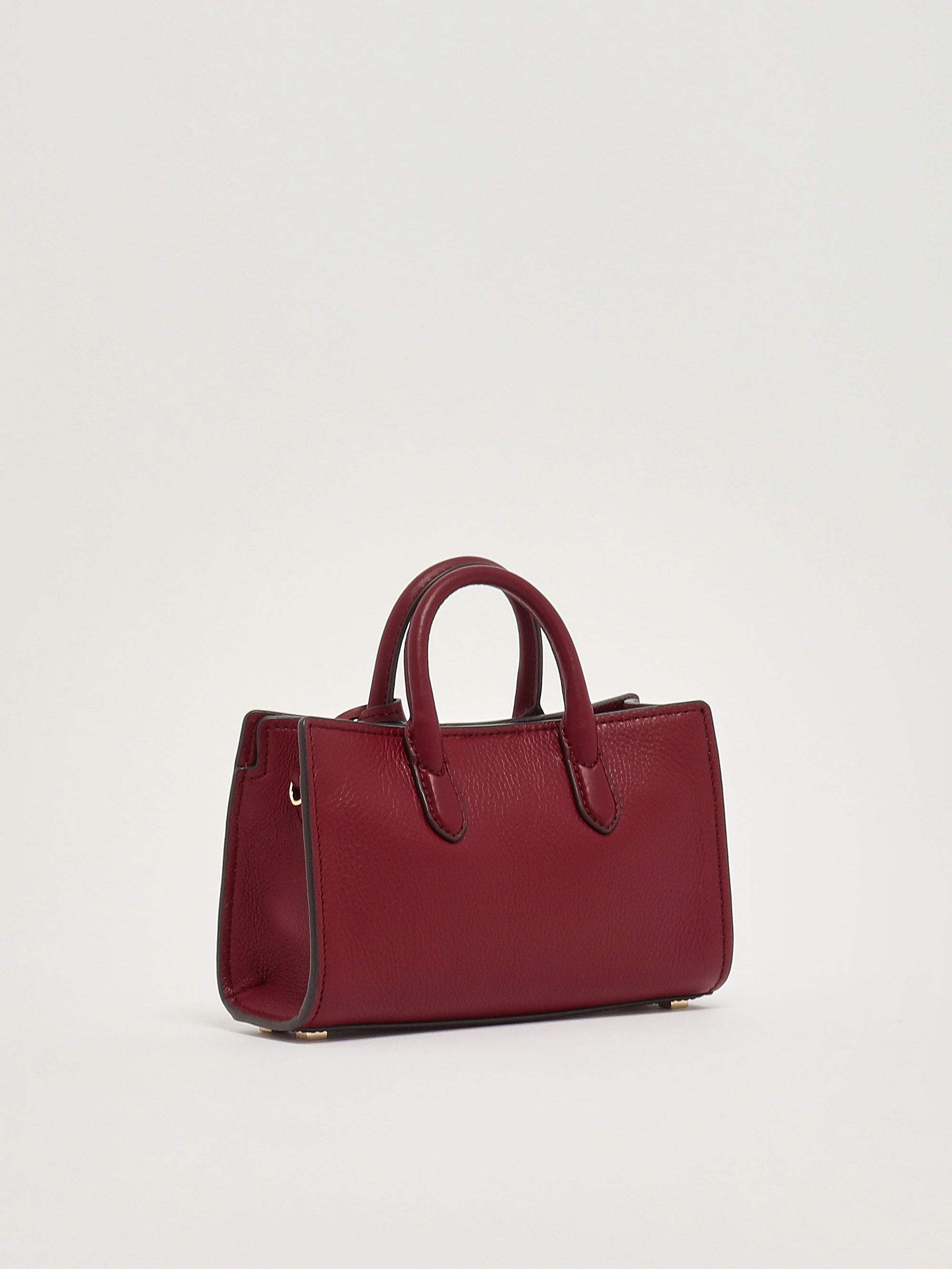 Diese Tasche aus genarbtem Leder hat eine rechteckige Form, zwei Griffe an der Oberseite, einen Magnetknopfverschluss, einen abnehmbaren Schulterriemen und ein Innenfach mit Reißverschluss.
