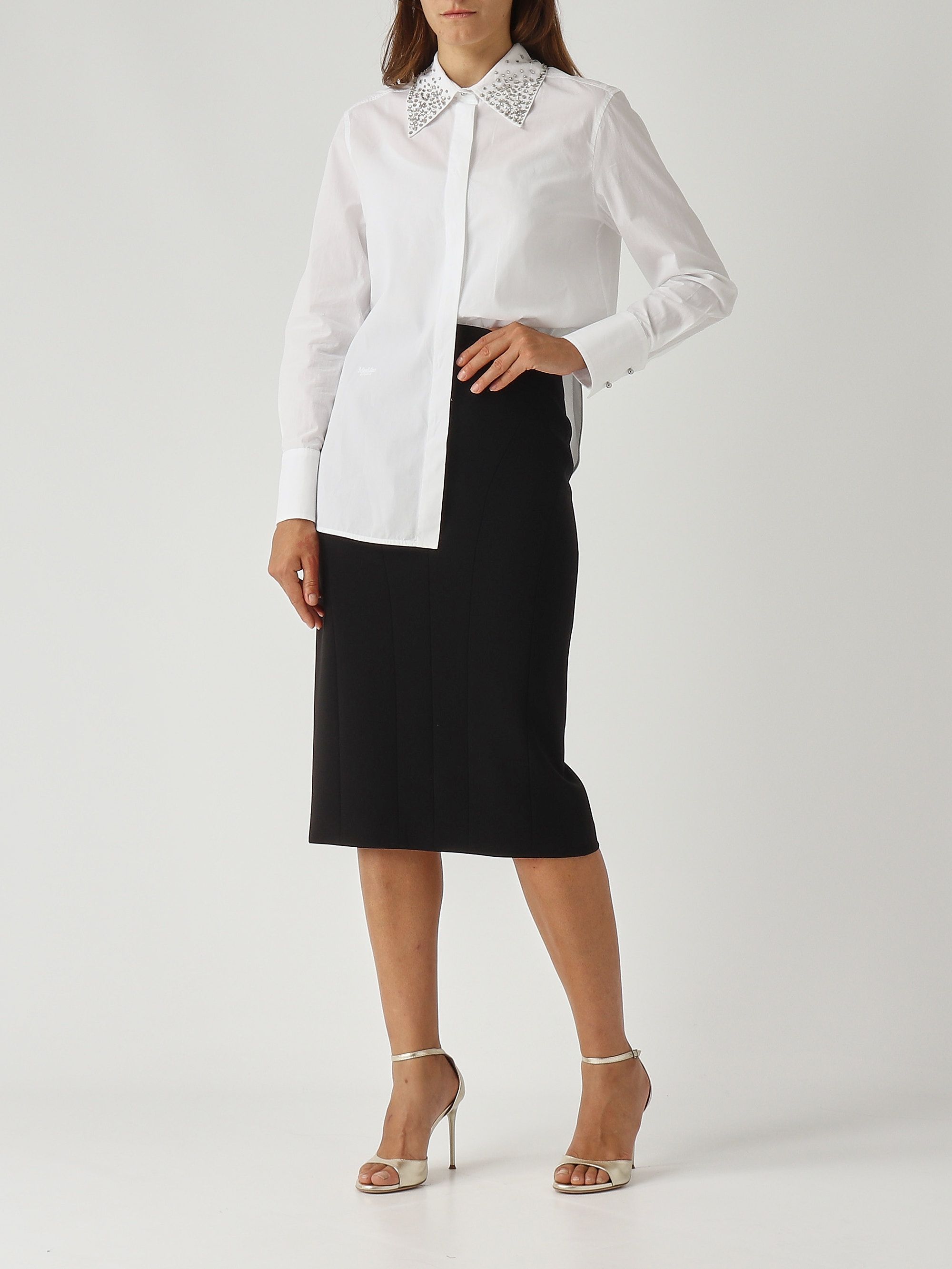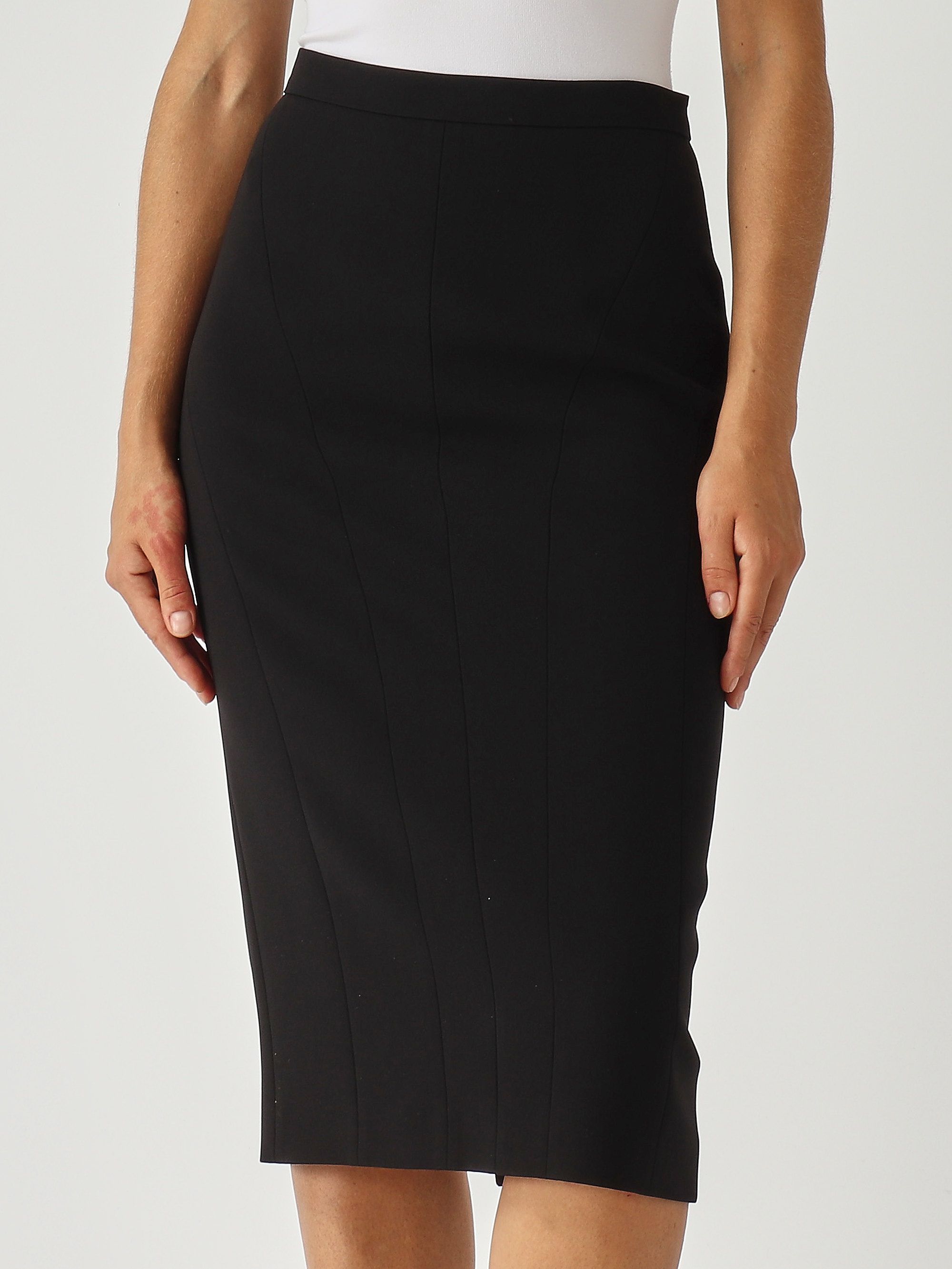 Made from cady, this calf-length skirt features a figure-slimming dart detail that slims the body figure. It also features a zipper closure on the back and a central rear slit.