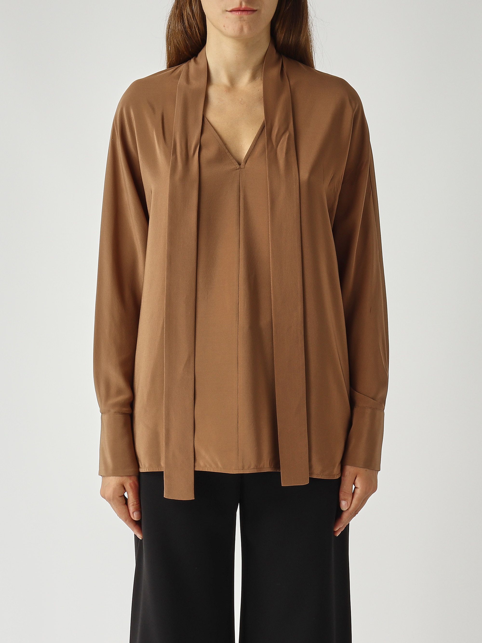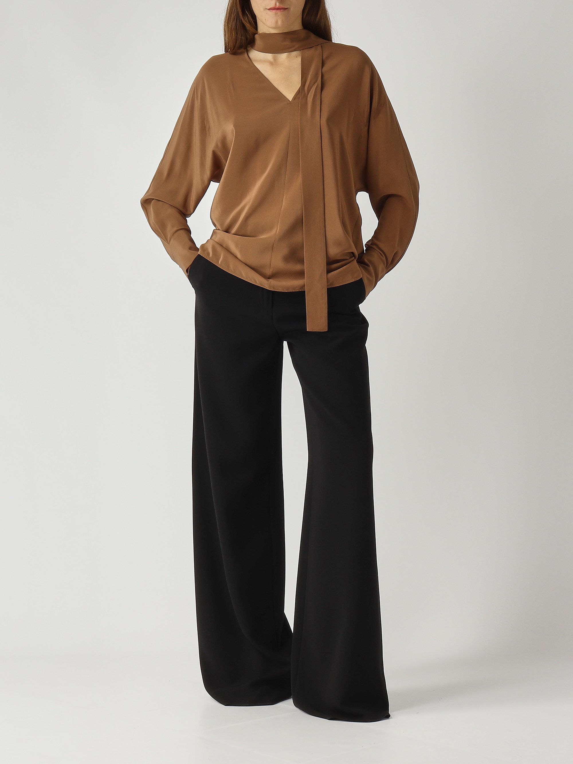 This loose-fitting blouse is made from pure silk crepe de Chine, a light and fluffy, semi-matte fabric with a delicate texture and graceful drape. It features a V-neckline with a tie sash to tie around it, wide kimono-length sleeves, high shirt cuffs with double jeweled buttons, and a rounded hem with side slits.