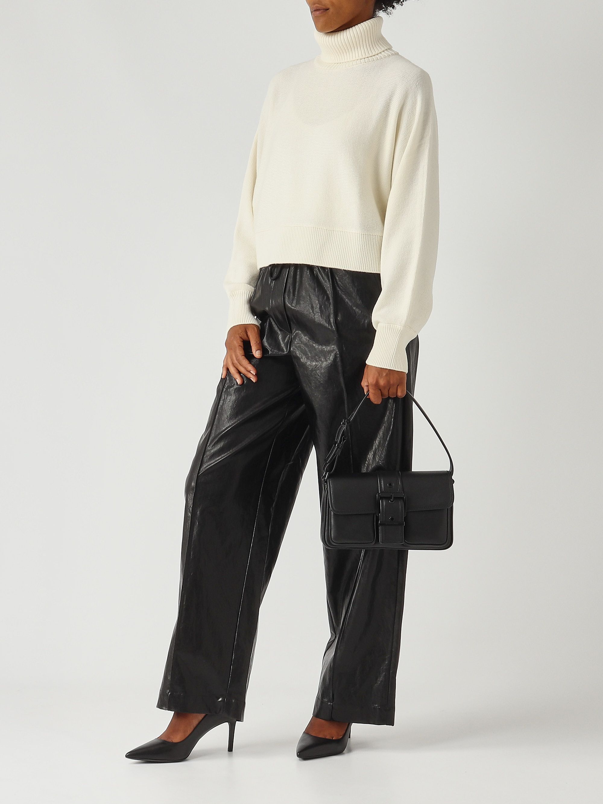 This extra fine merino wool sweater features a wide ribbed turtleneck, wide long sleeves, and ribbed hem and cuffs.