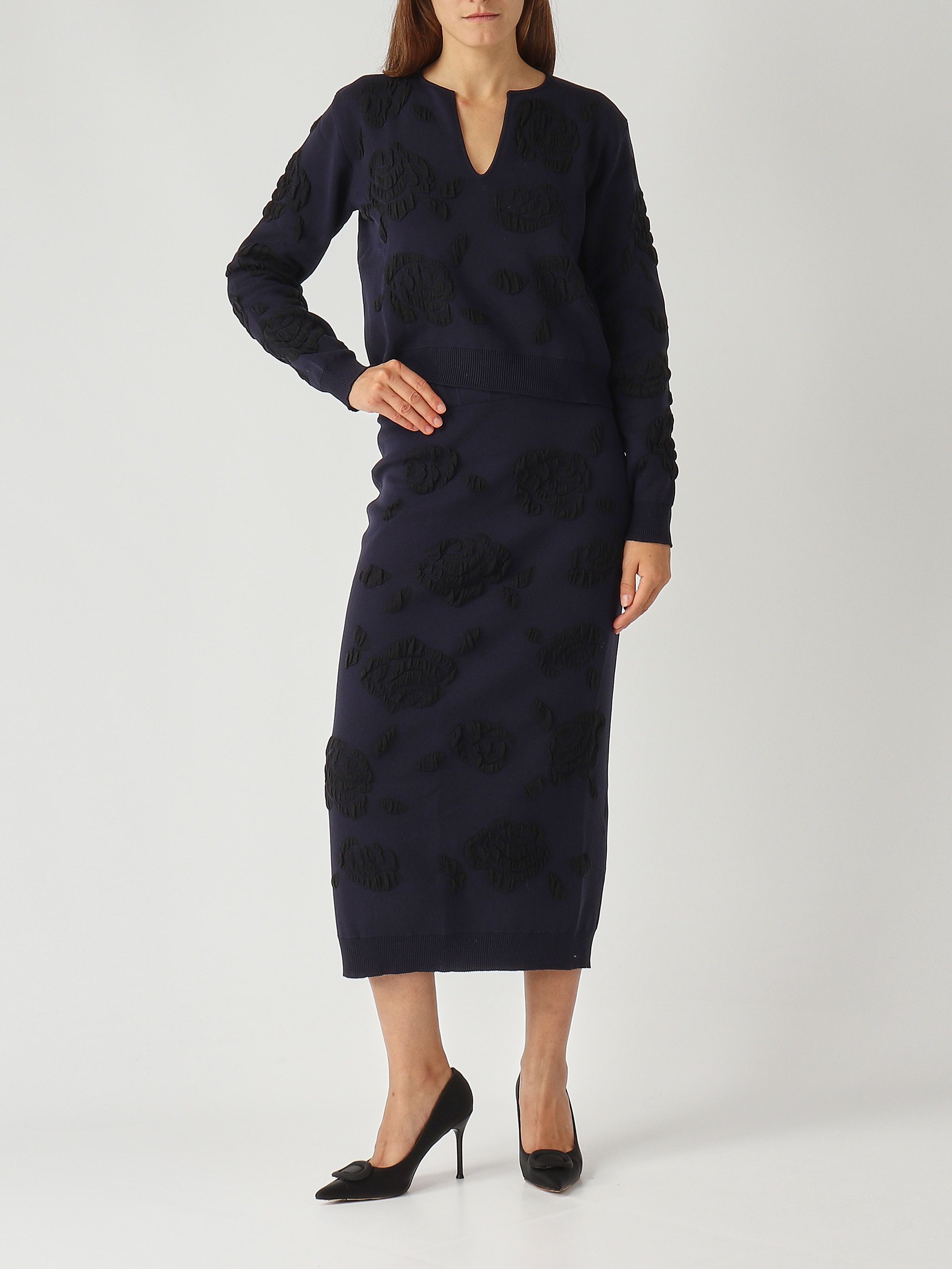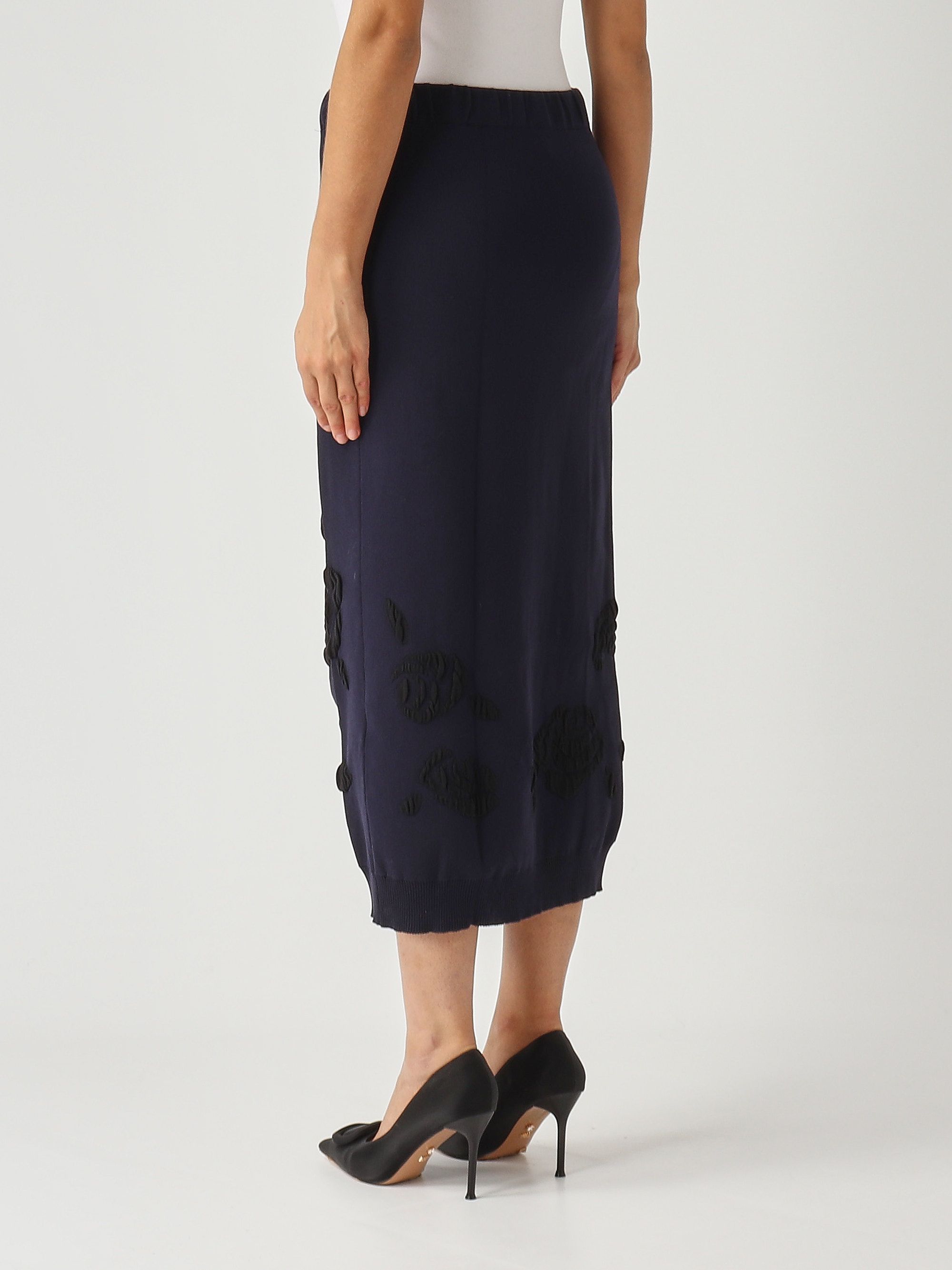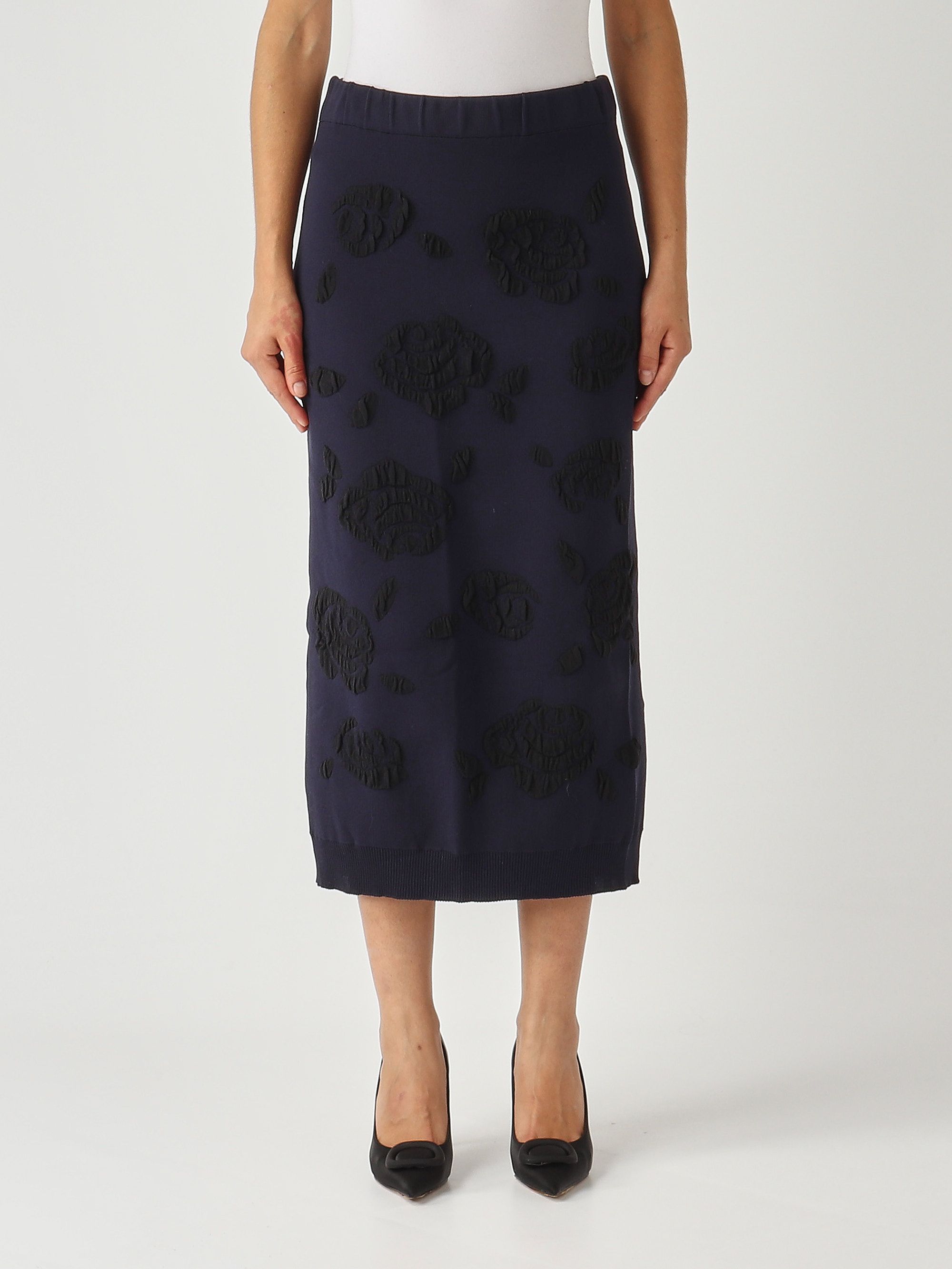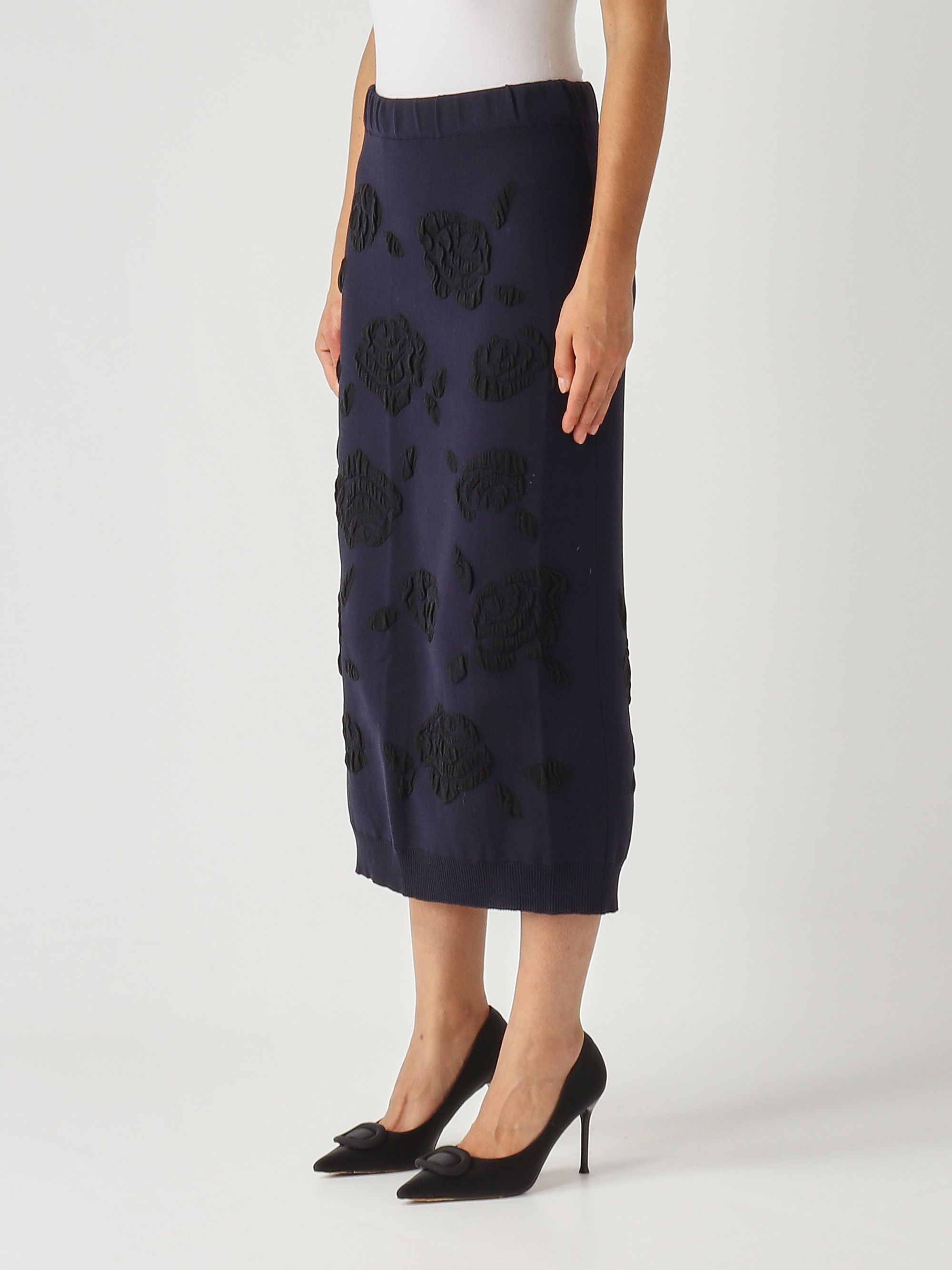 The Hannah skirt in technical fabric by Liviana Conti, features a comfortable elastic waistband, stretch hemline and elegant floral embroidery that make this item unique in its kind, wear it with the matching sweater for a sophisticated look.