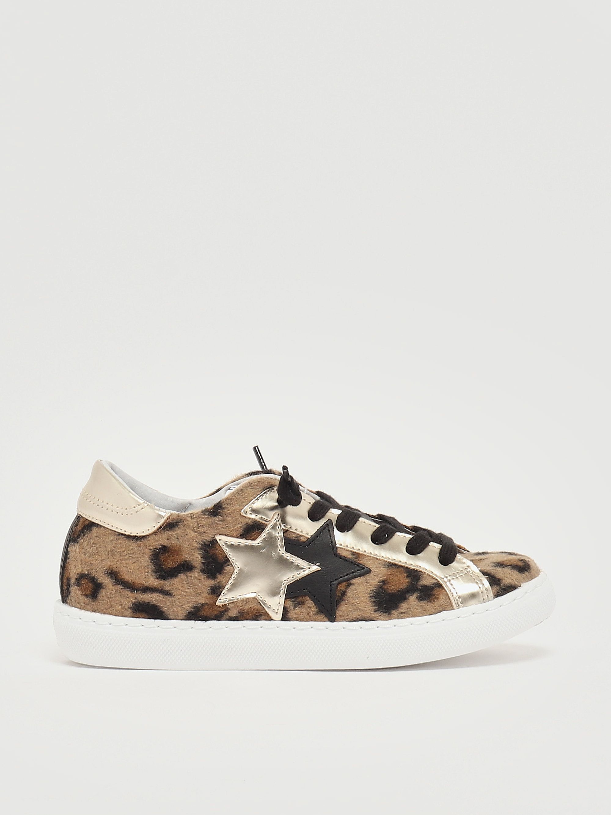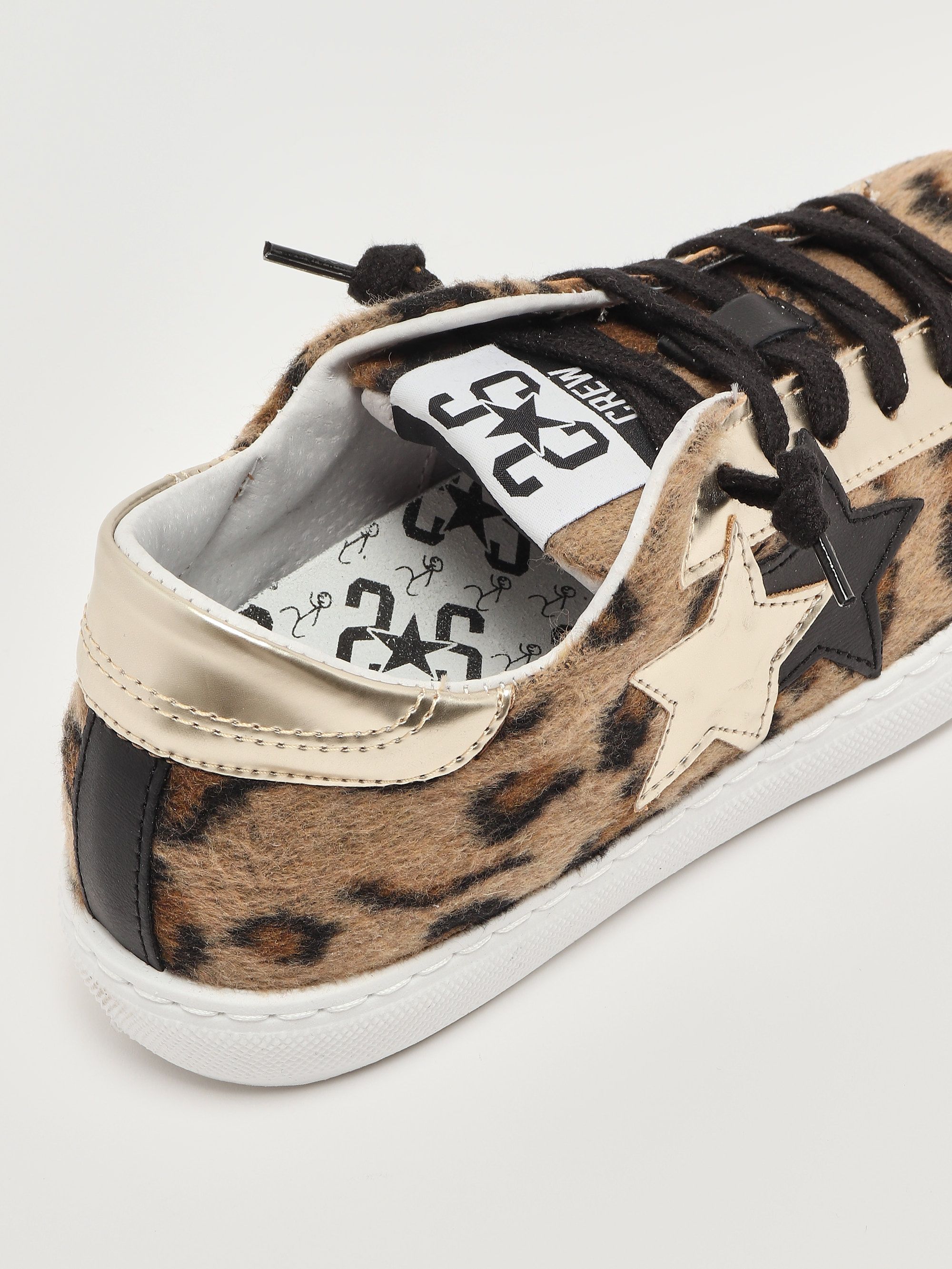 These sneakers boast a plush-inspired leopard print upper for a bold touch, a round toe, black and gold details, and a low but not flat sole.