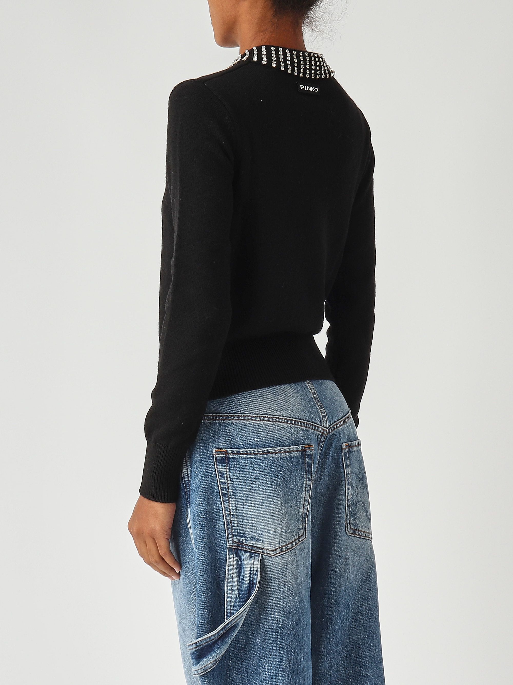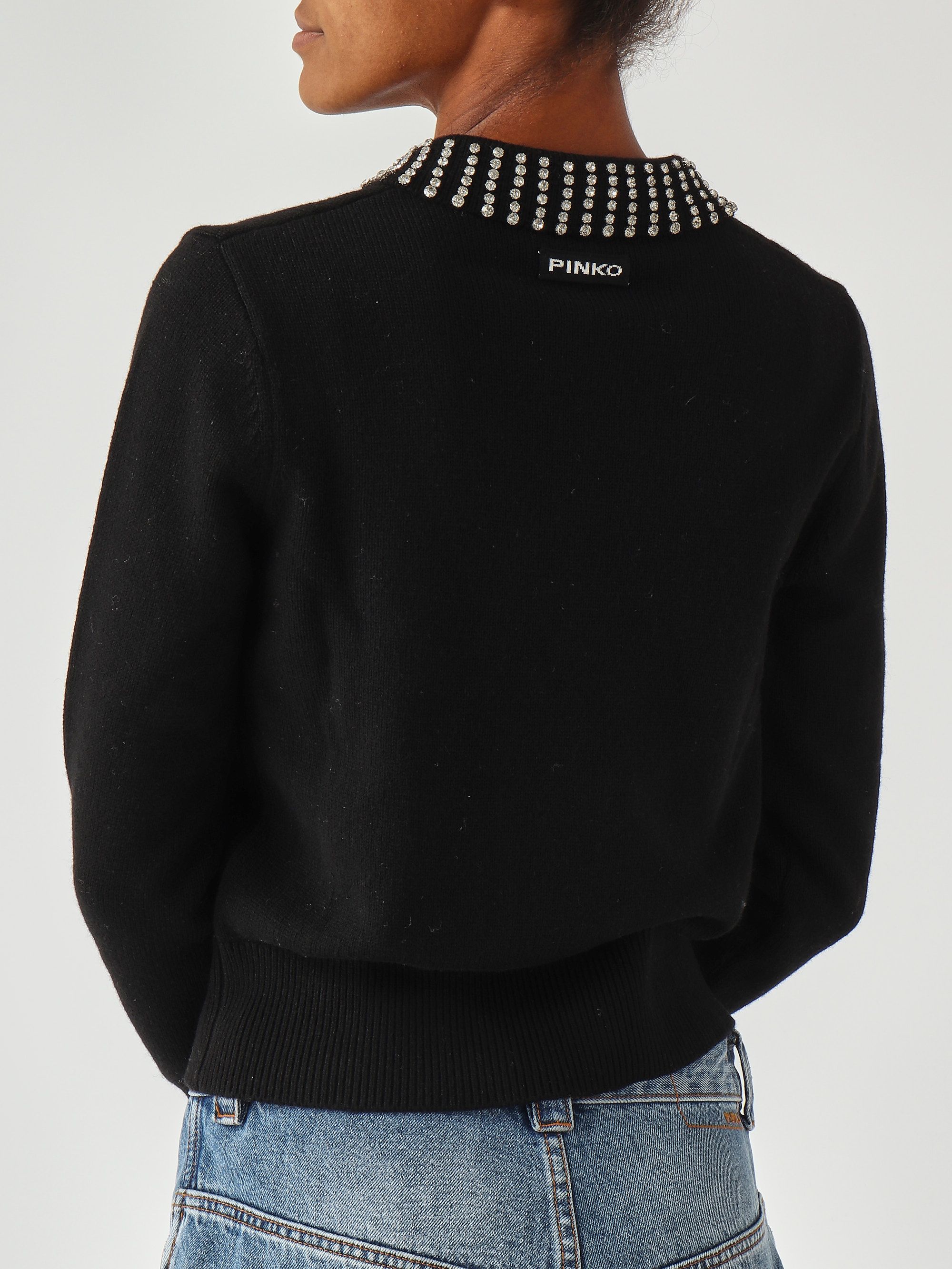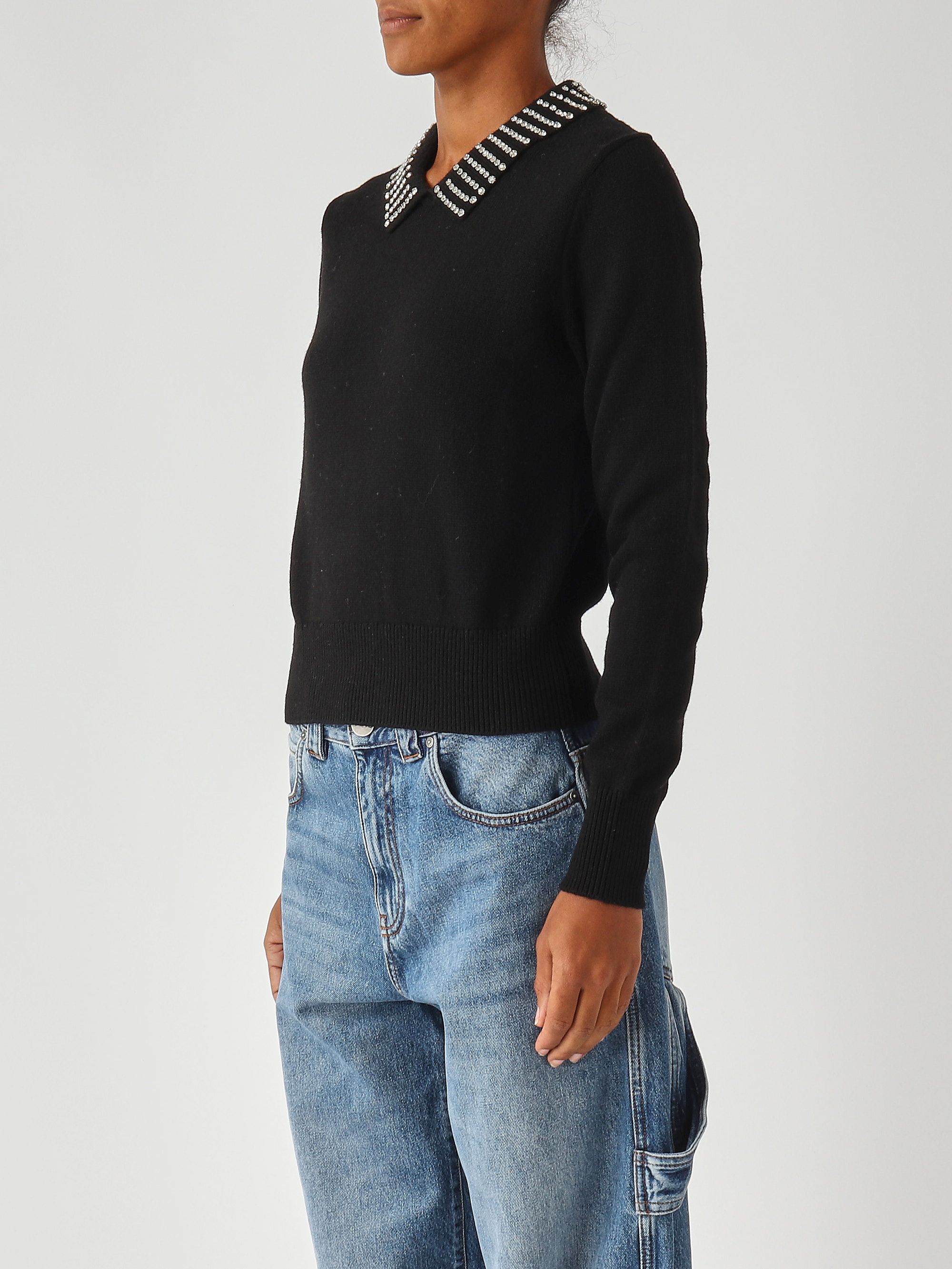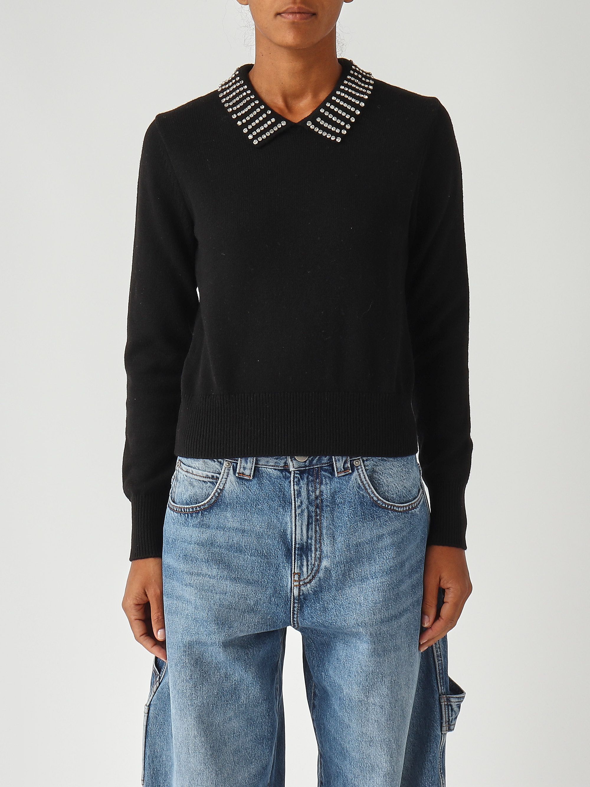 Made from a wool blend, this sweater catches the eye for a particular detail: the shirt collar decorated with mini crystals, which lends an irresistible touch of light and elegance.