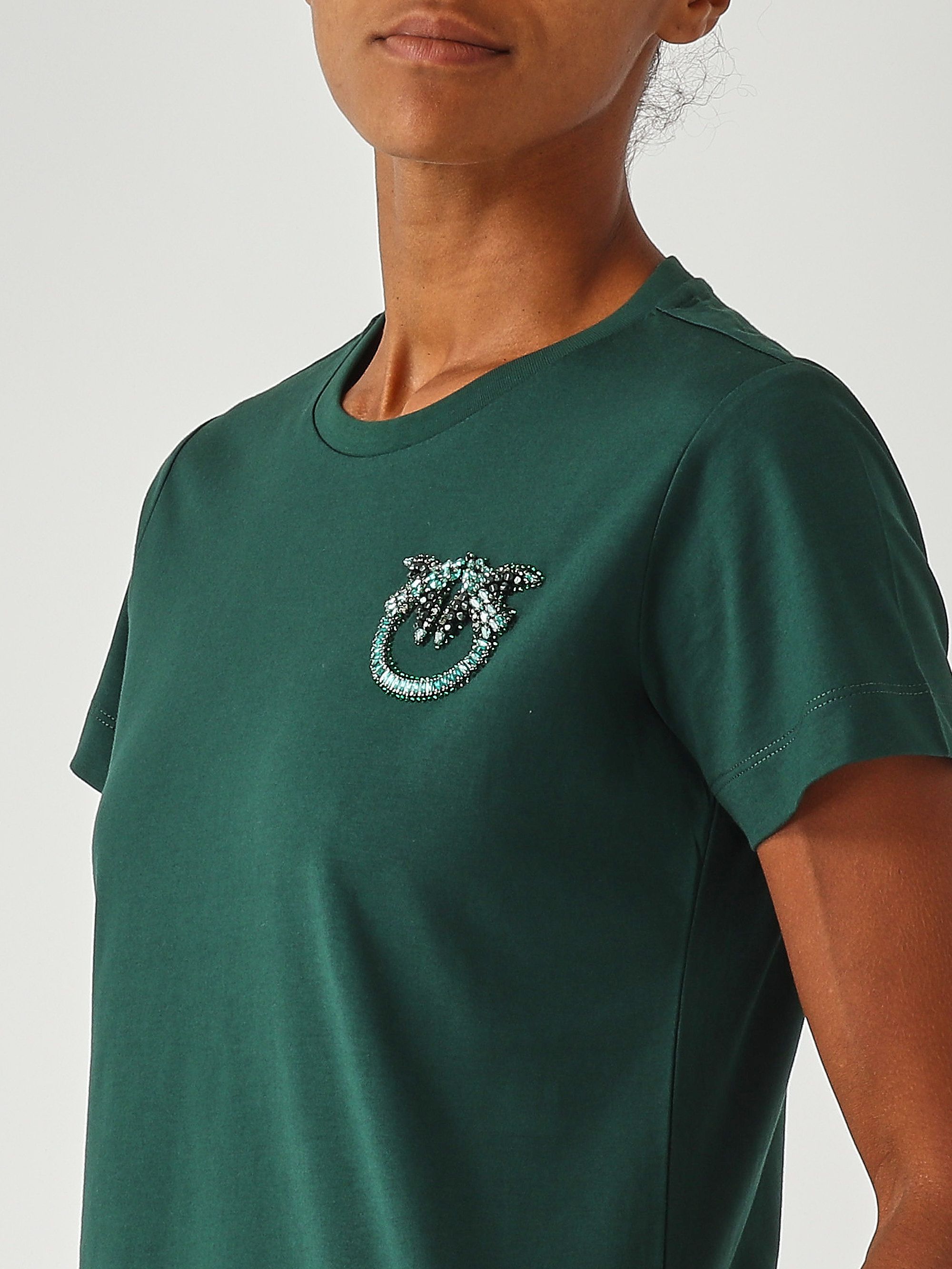 T-shirts are a must have. Seemingly basic, the hand-embroidered Love Birds logo patch with beads and crystals will elevate your casual outfits.