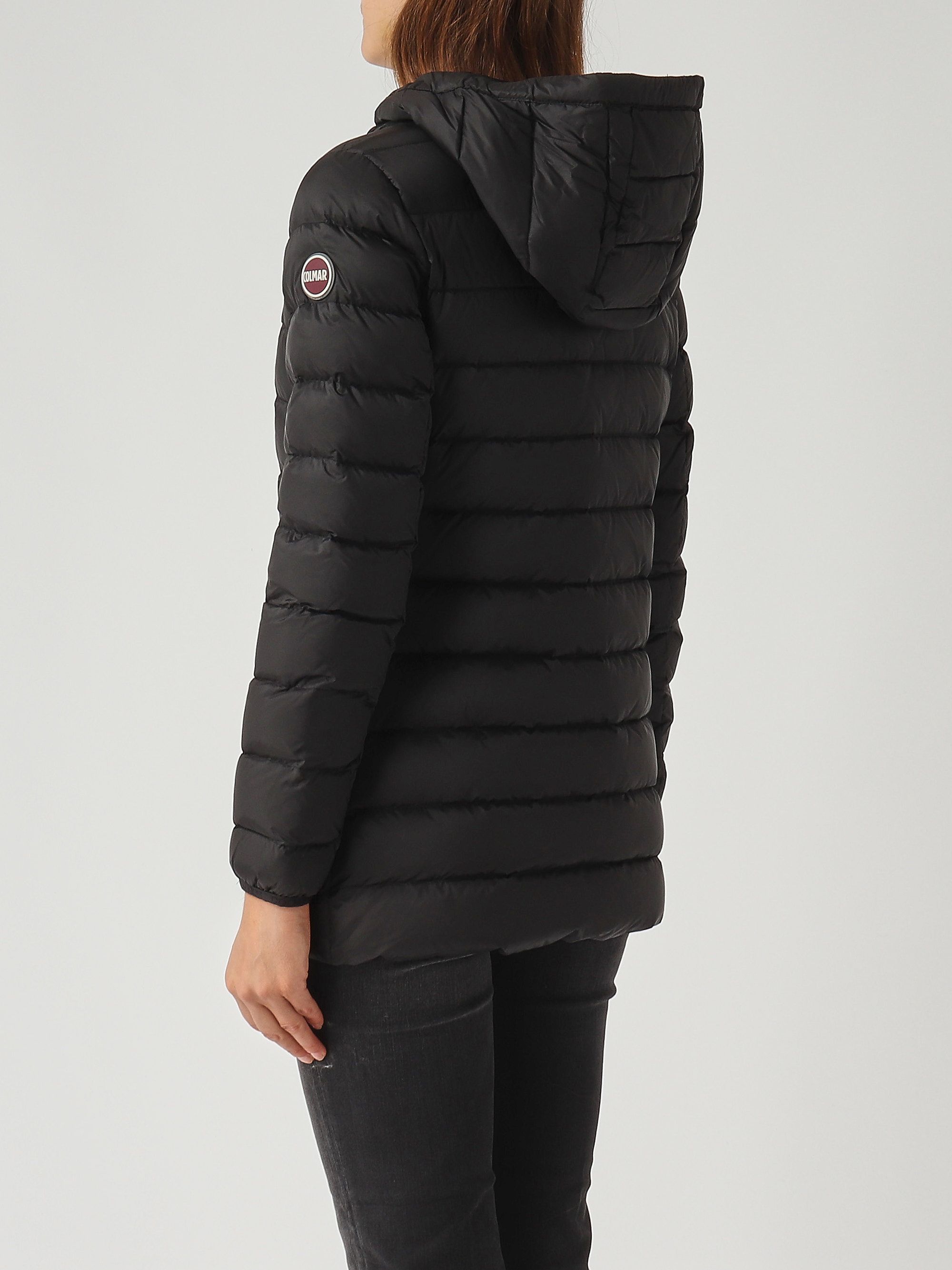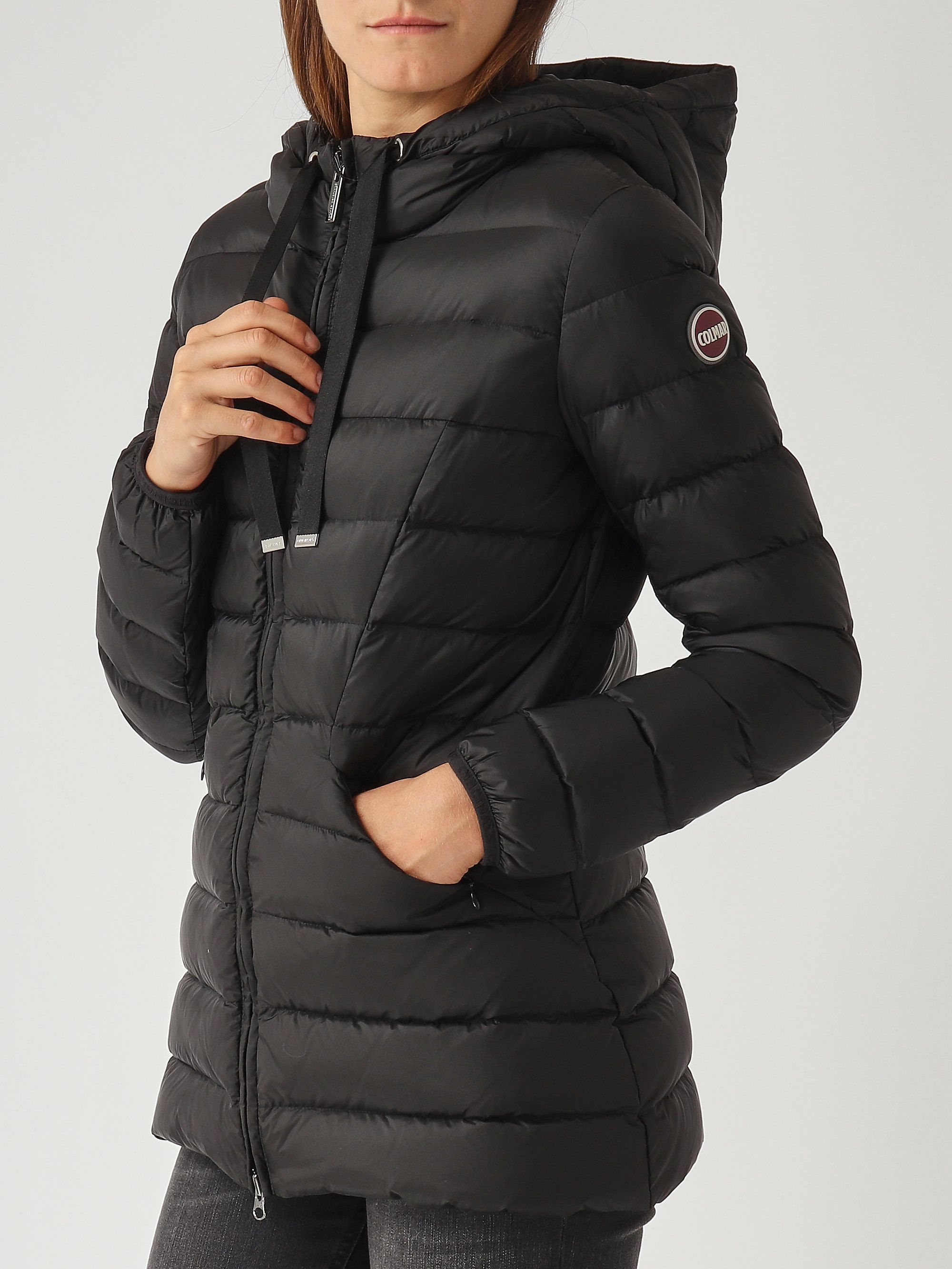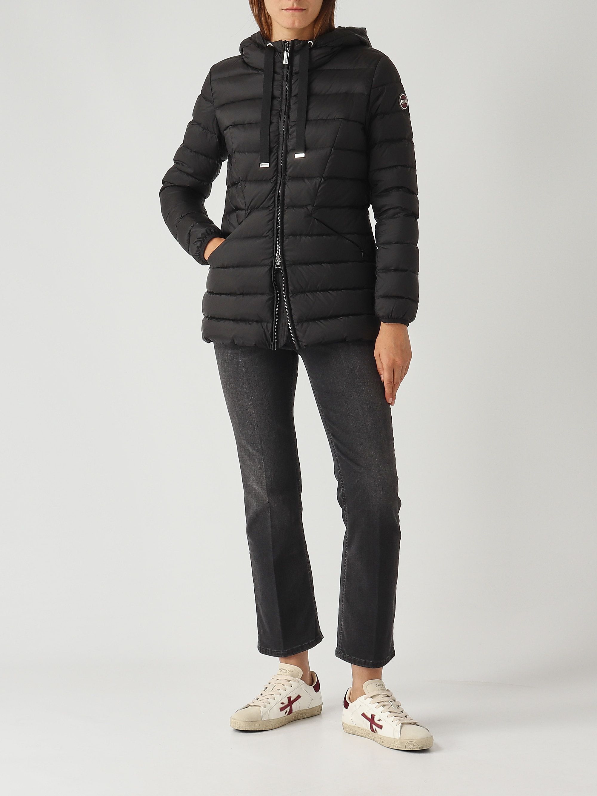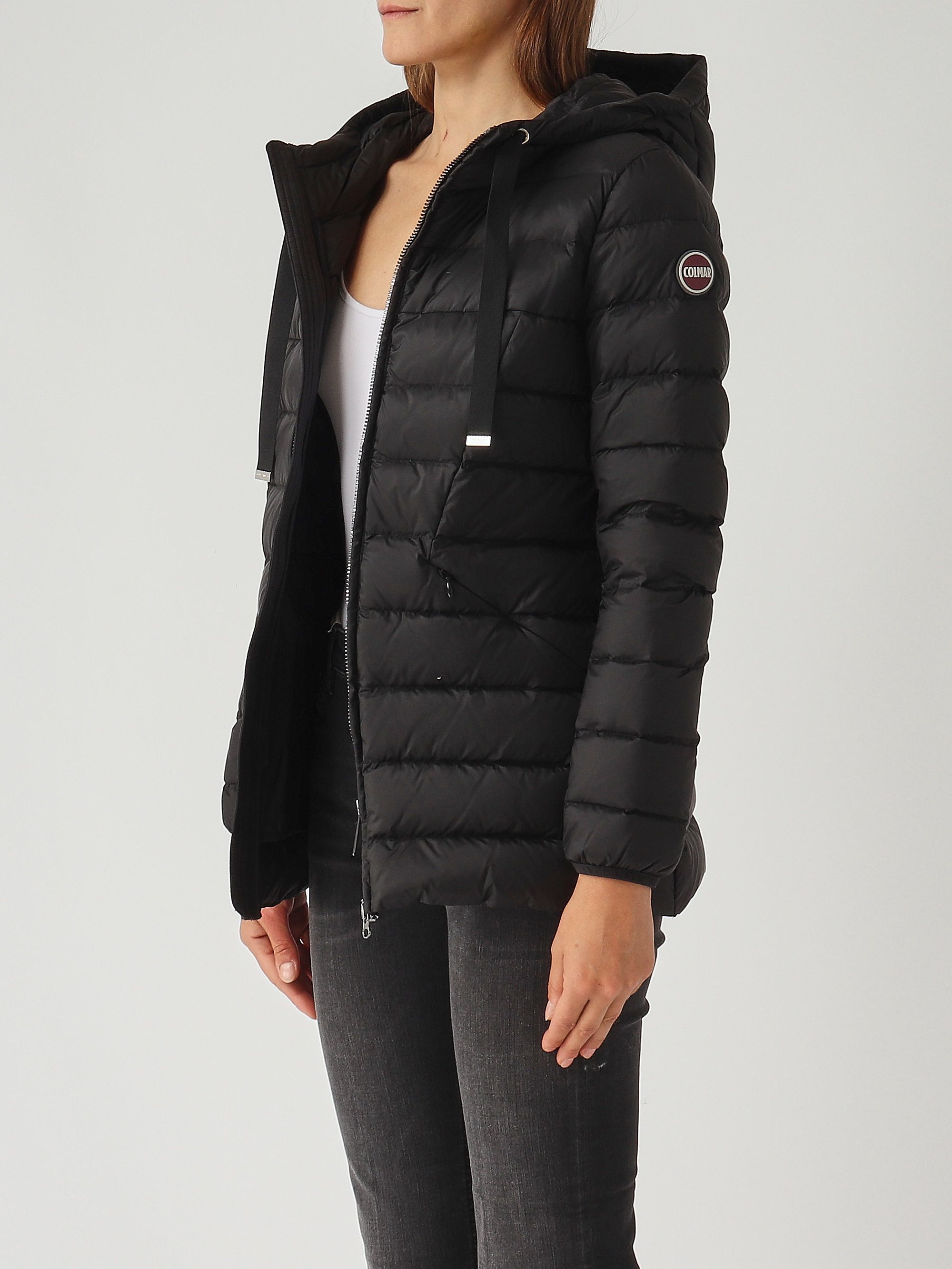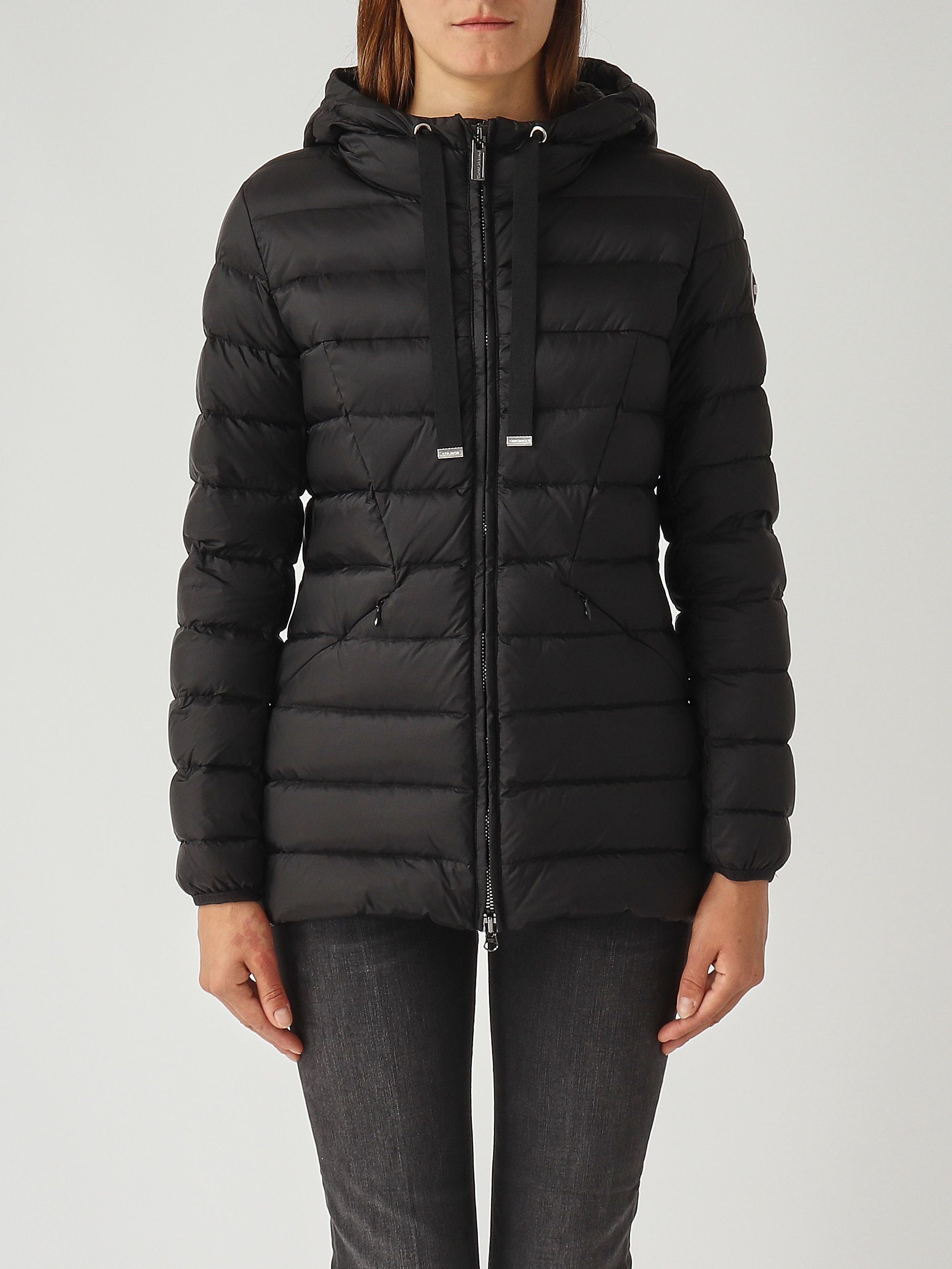 Graced with a tapered silhouette that accentuates the waist, this nylon down jacket combines design and functionality to face the cold in style. It features an adjustable hood with drawstring and a double tone-on-tone ribbon for a feminine and elegant touch, side pockets with zip, and a front closure with zip.