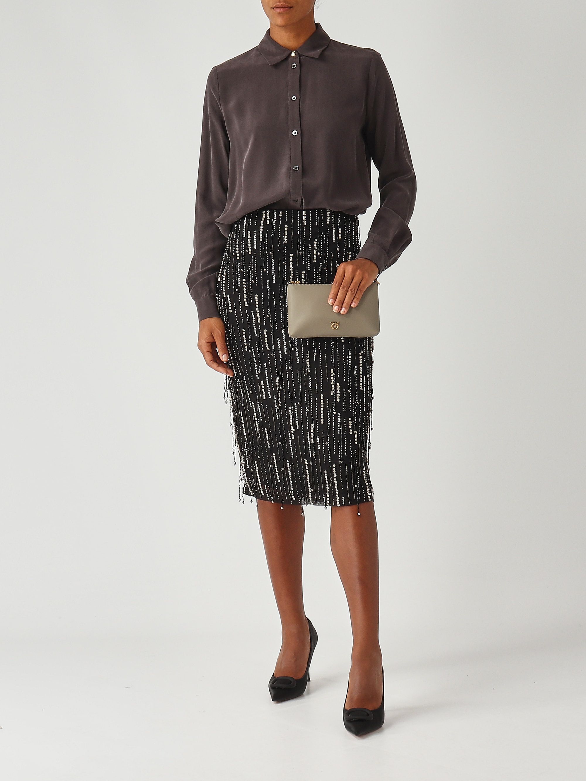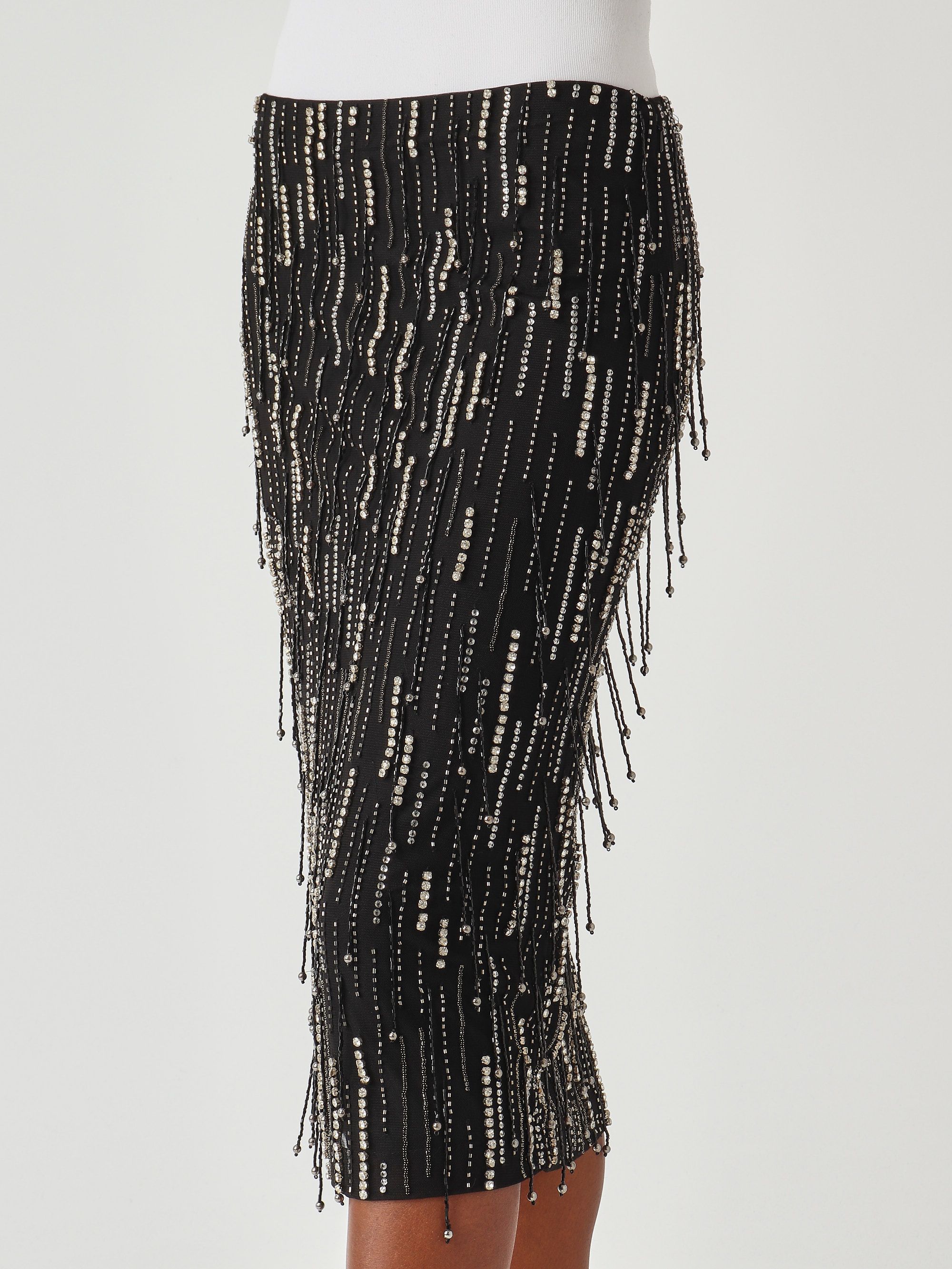 Main character piece to match with minimal tops and heels, this tulle skirt will steal the scene on the most glamorous occasions as it features a cascade of sparkling fringes, silver sequins, and beads.