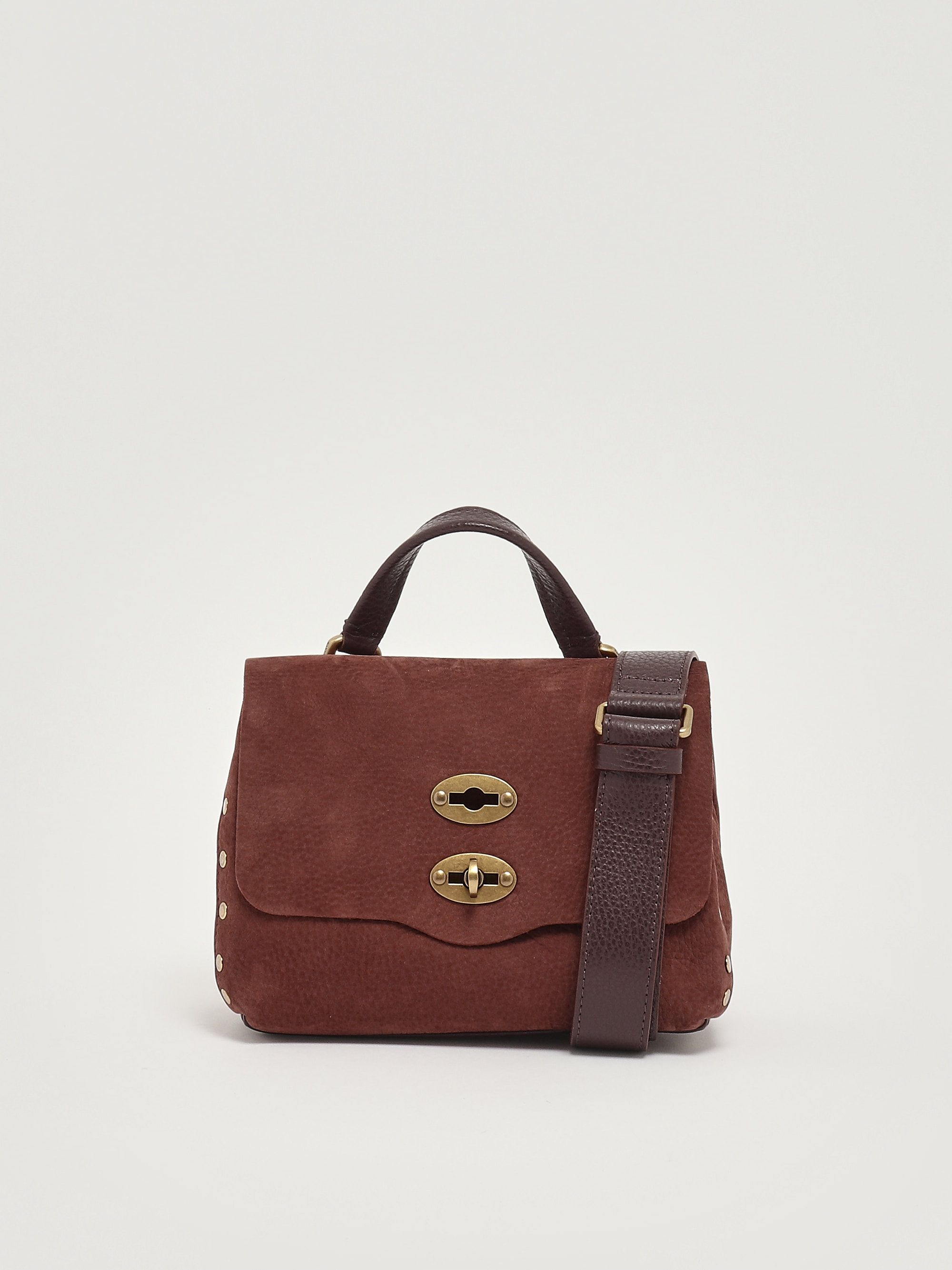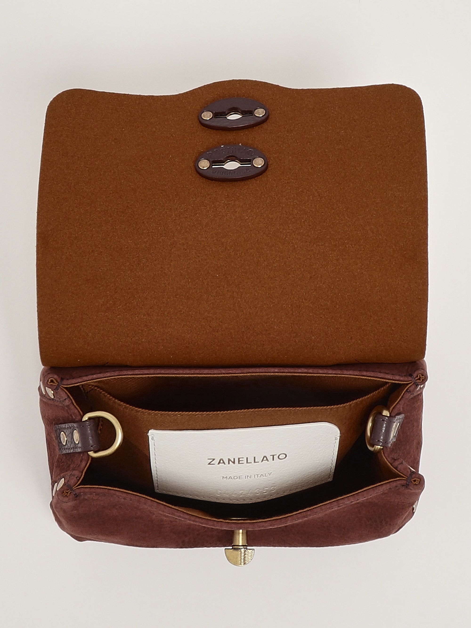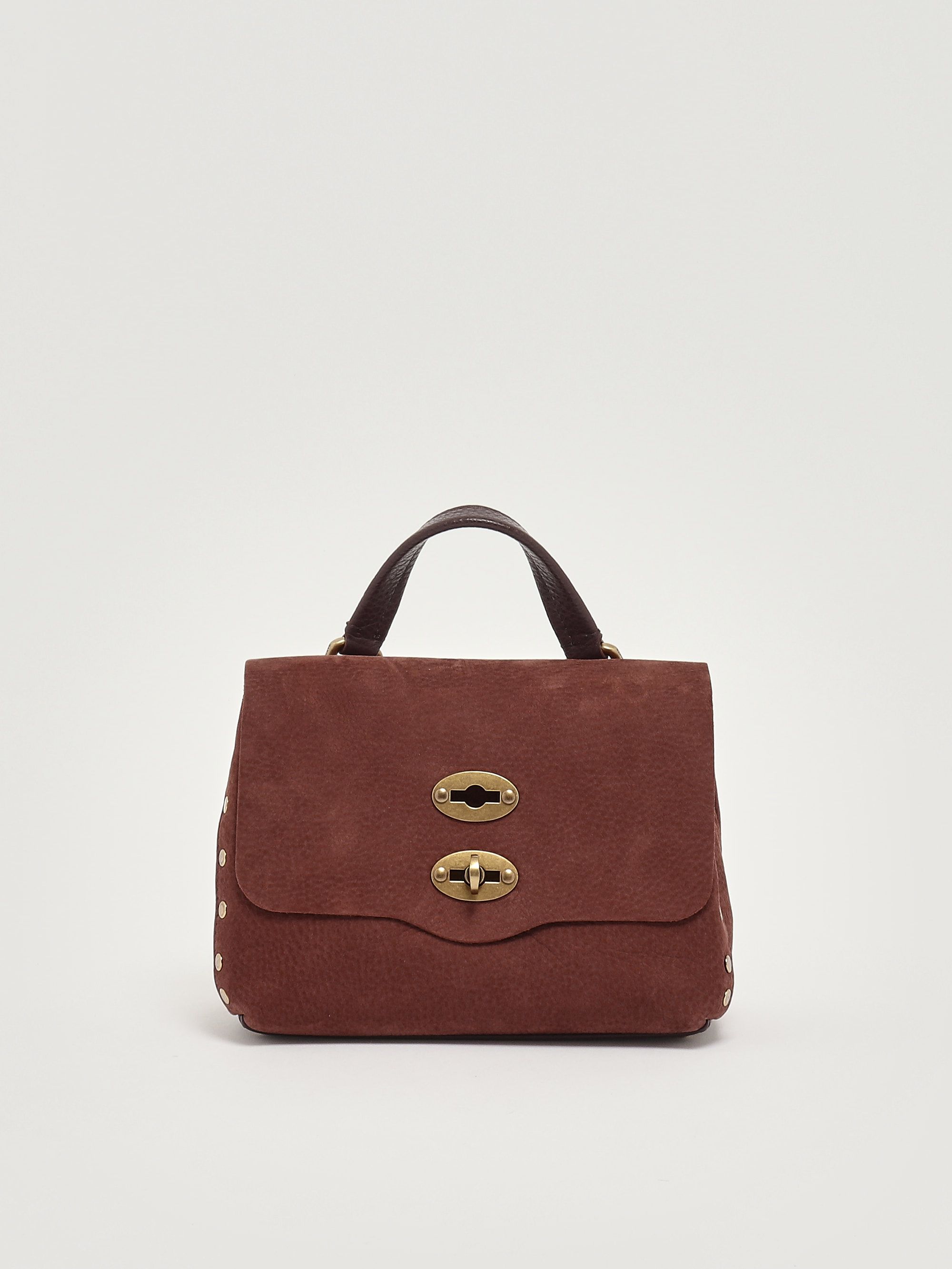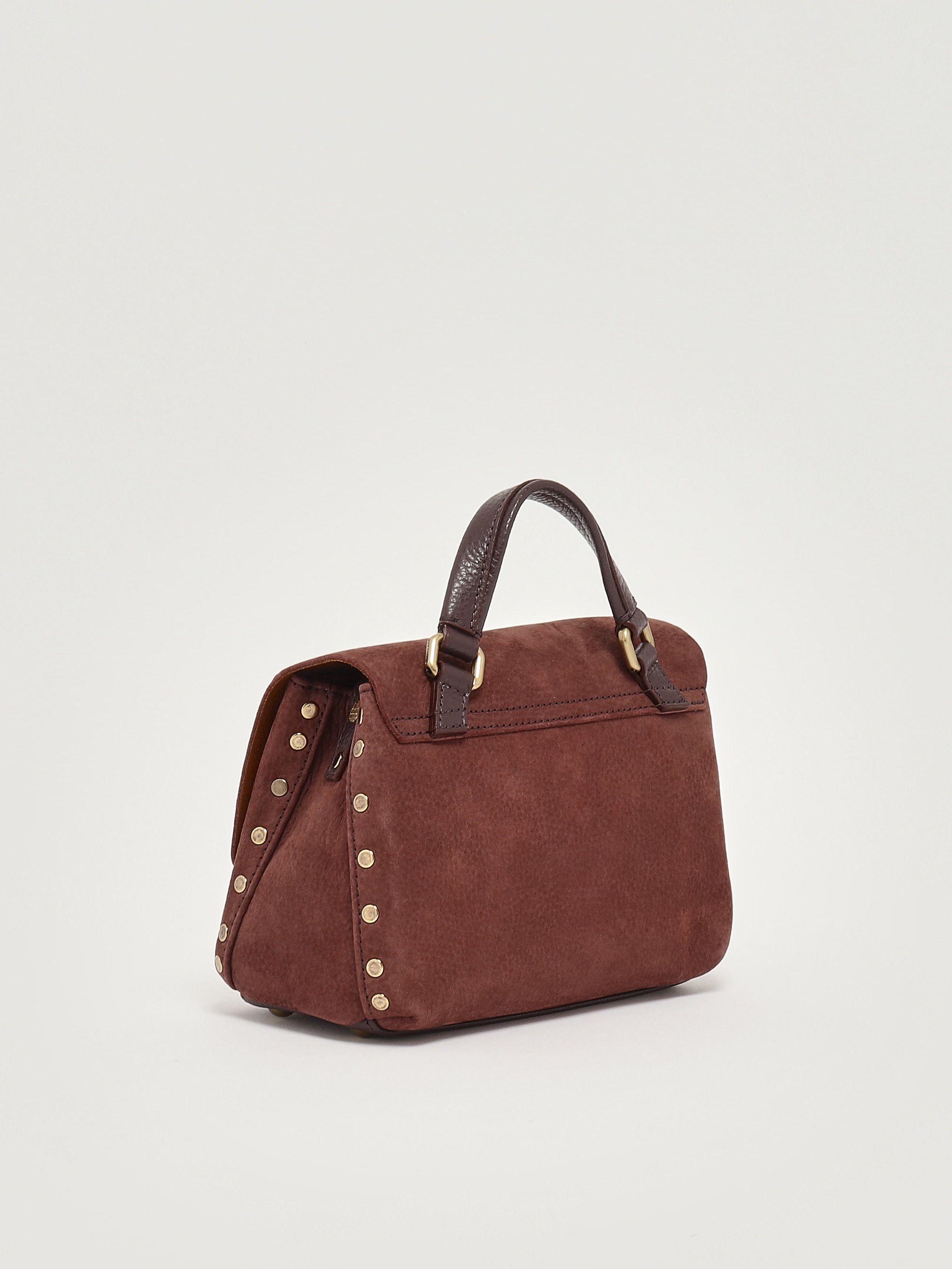 Each Zanellato bag encapsulates craftsmanship with small but precious details. The iconic Postina bag, with a rectangular or slightly trapezoidal shape, is conceived using unique and extremely soft leather. Made from grained suede leather, the Postina Jones Baby features studs decorating the profiles, a flap and hook closure in an off-gold hue, a top handle, a removable shoulder strap, and a practical pocket on the inside.