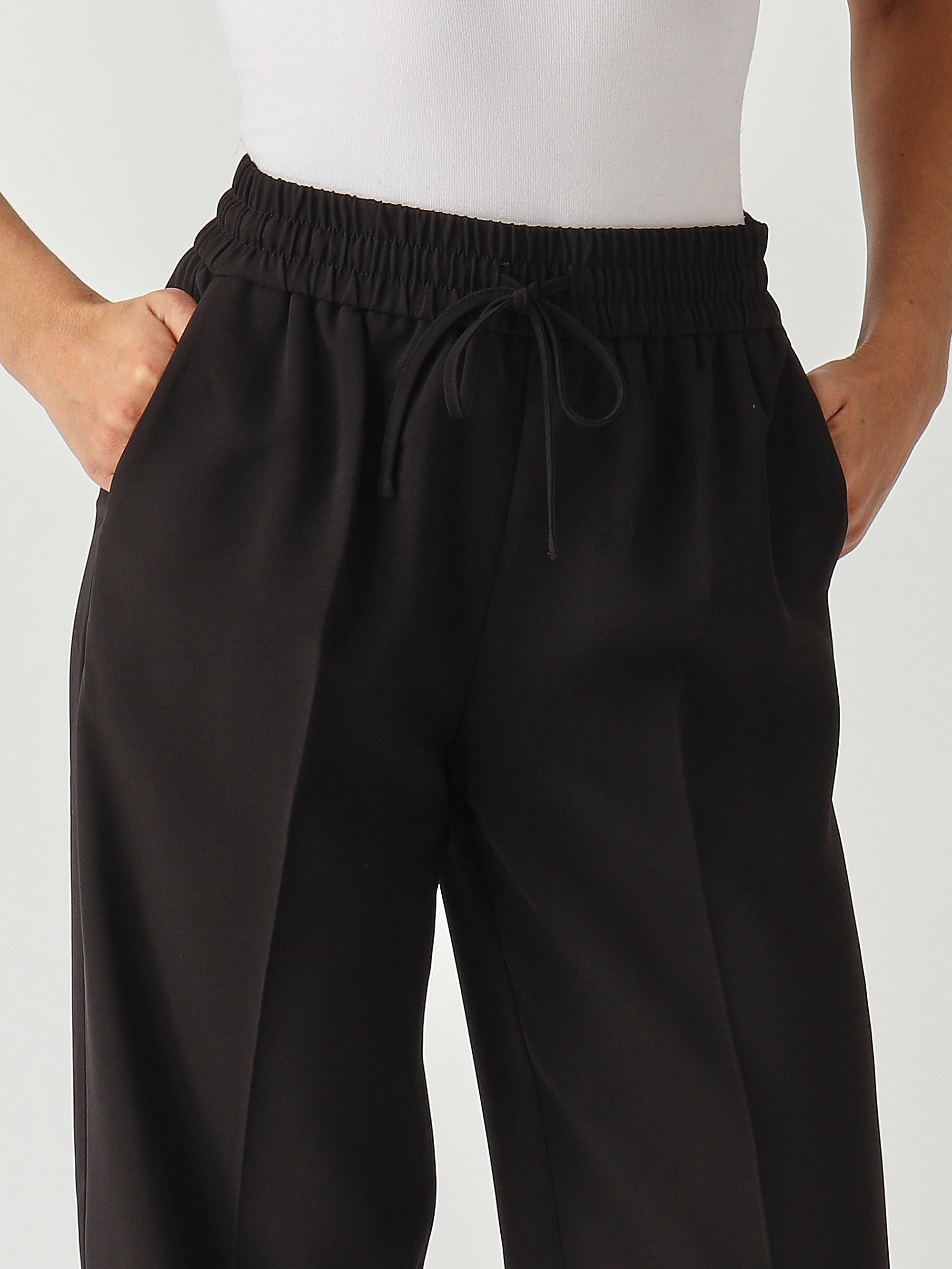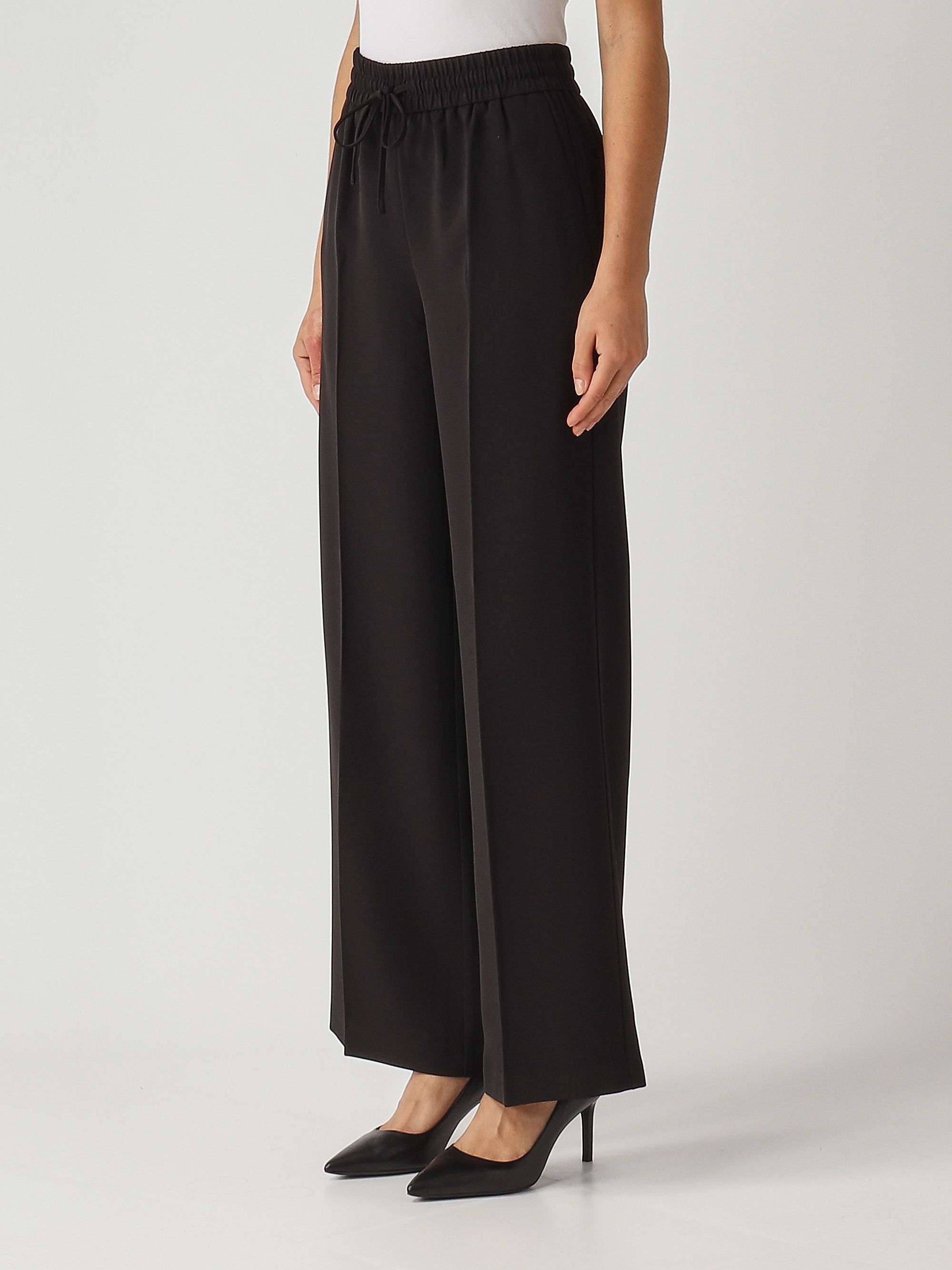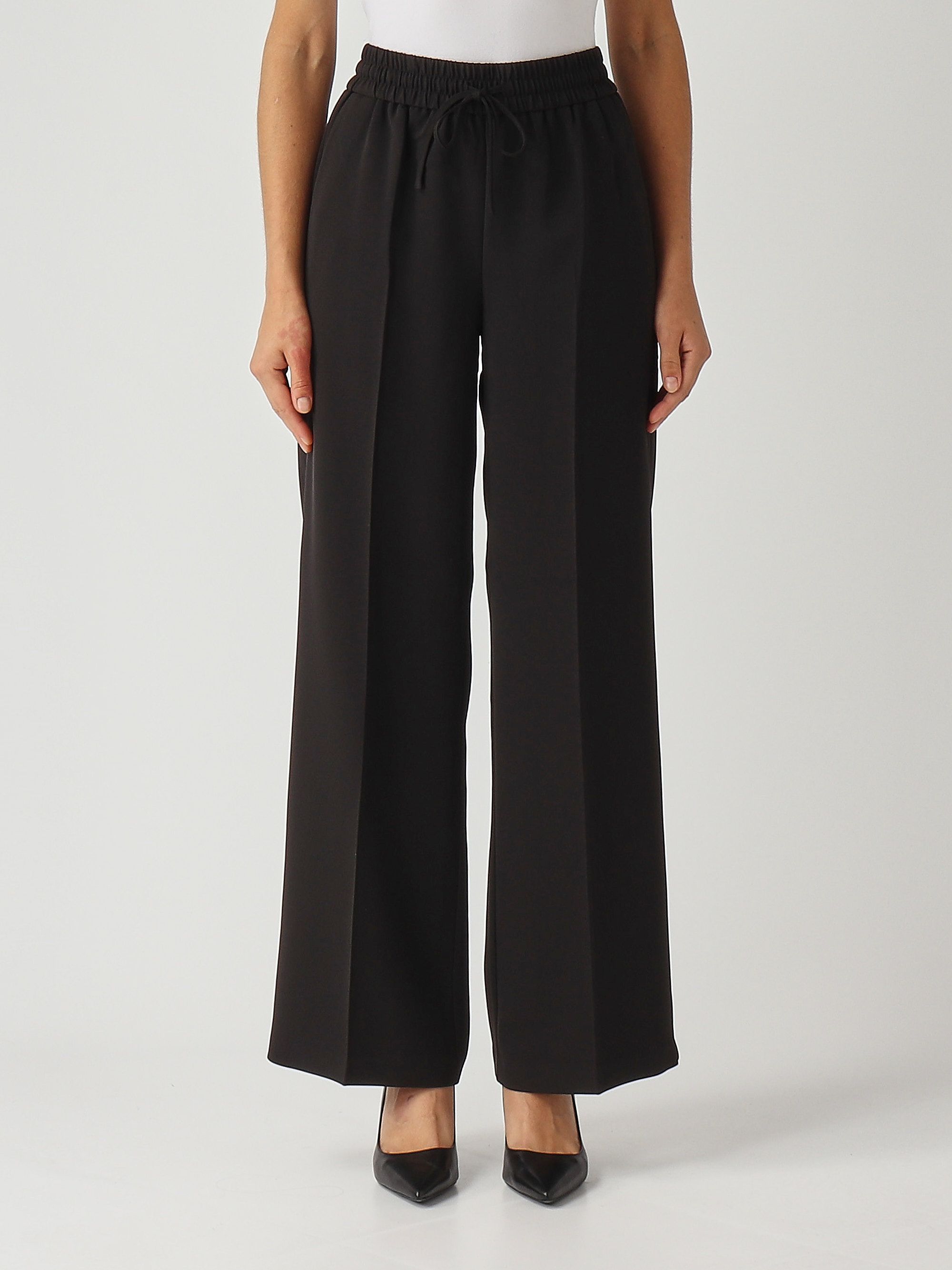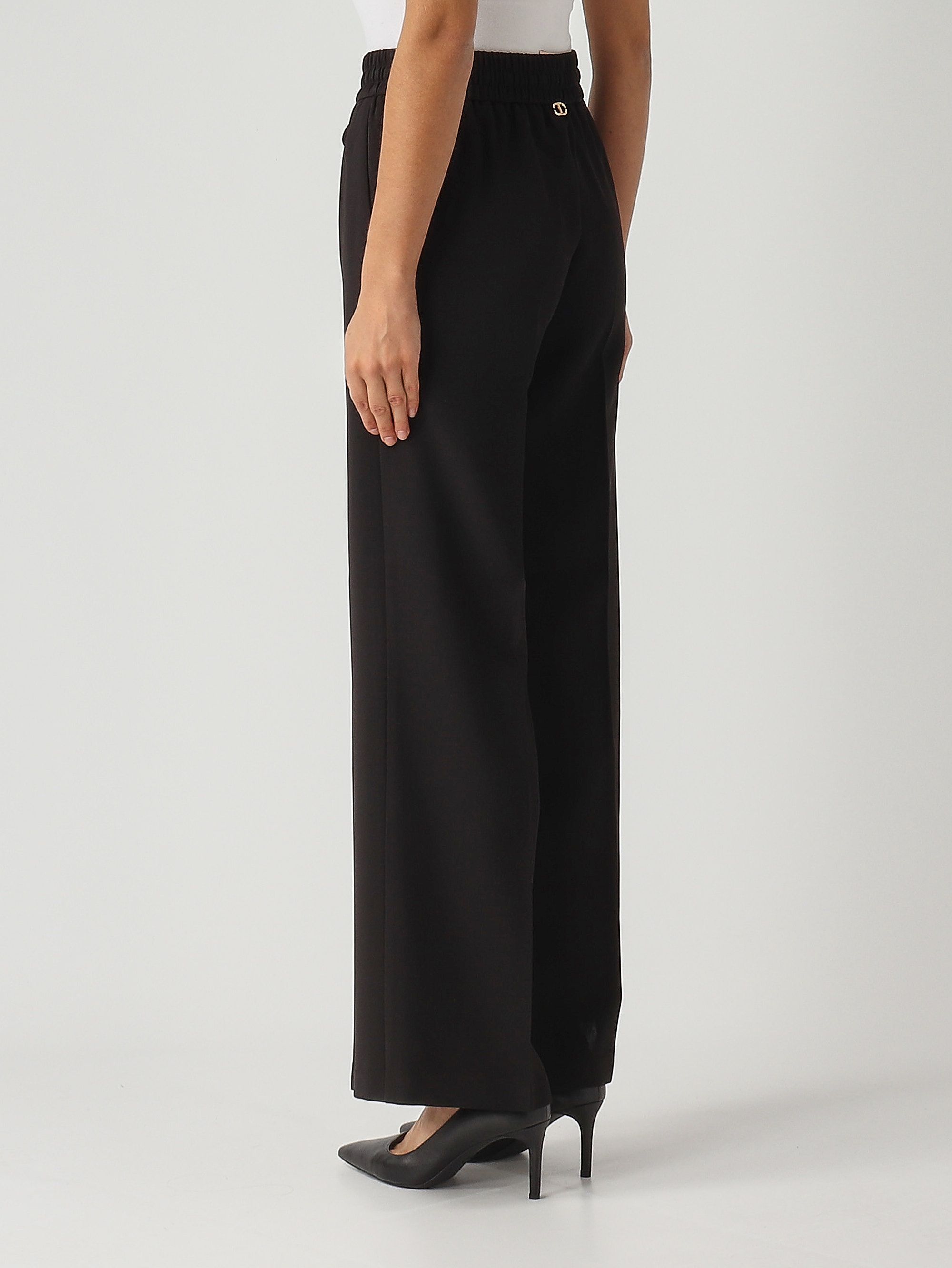 Everyday elegance with the Twinset crepe trousers, featuring a wide leg with a pressed crease, an adjustable drawstring at the waist, slash pockets, and the Oval T logo applied at the back.