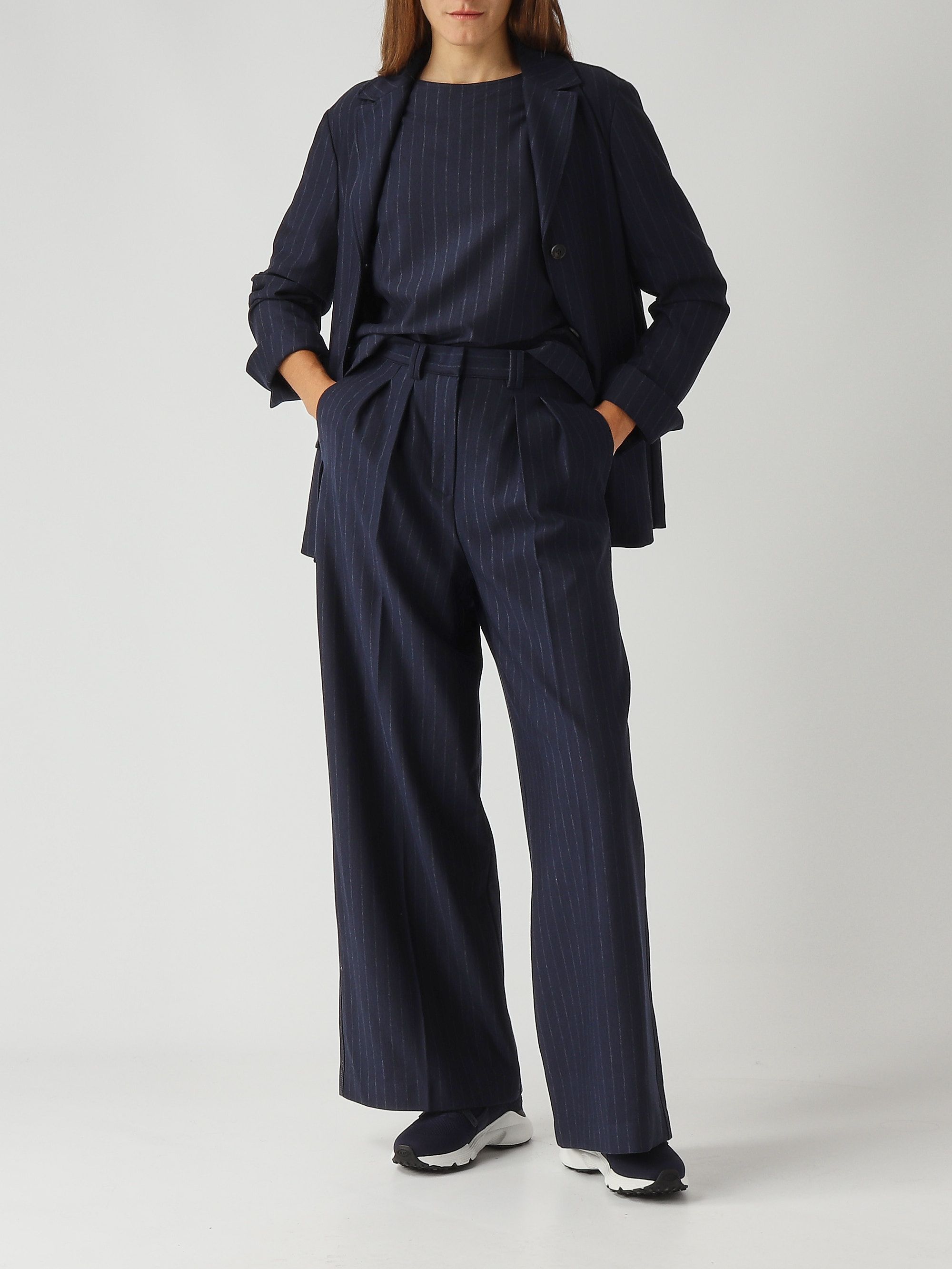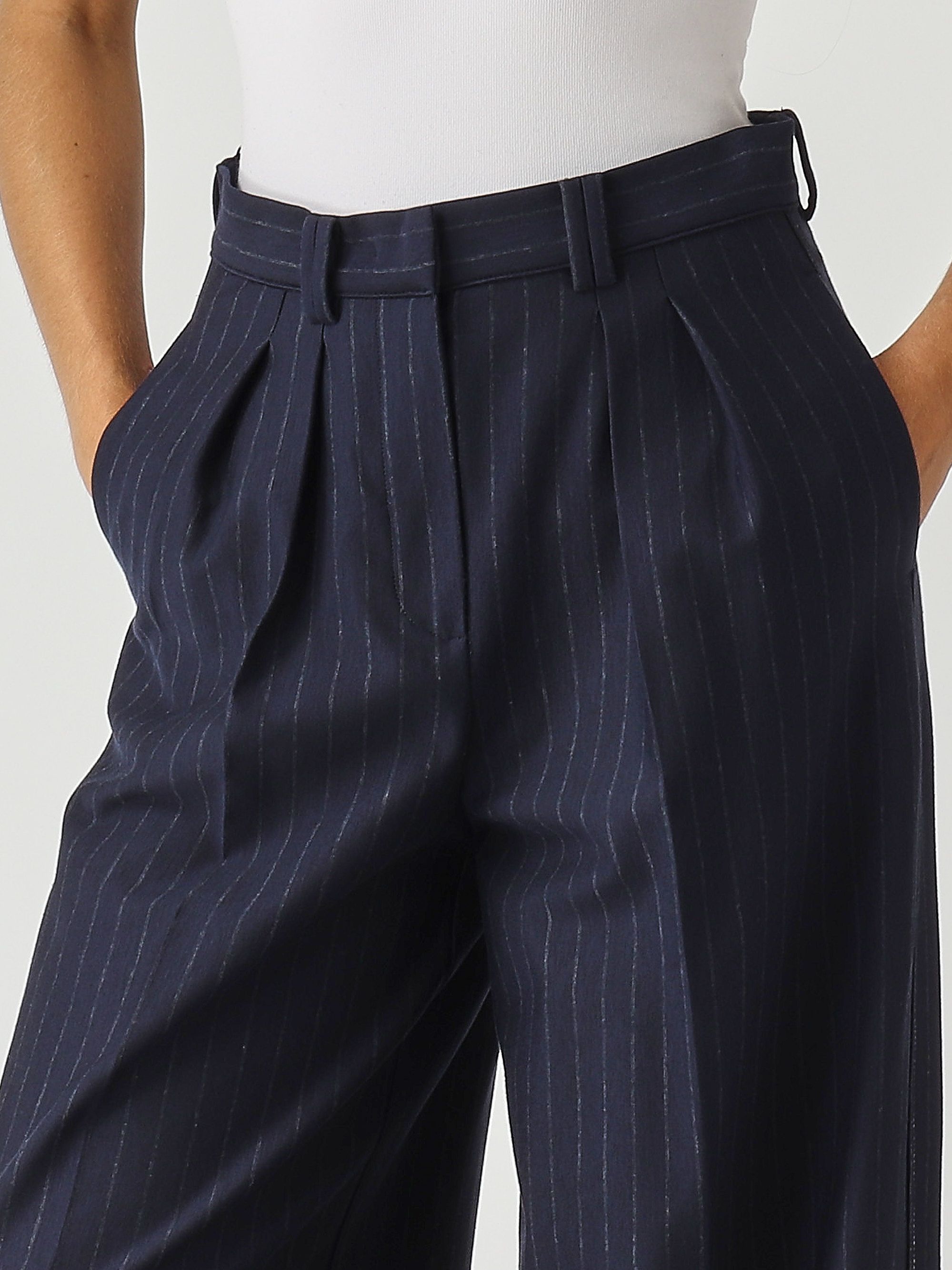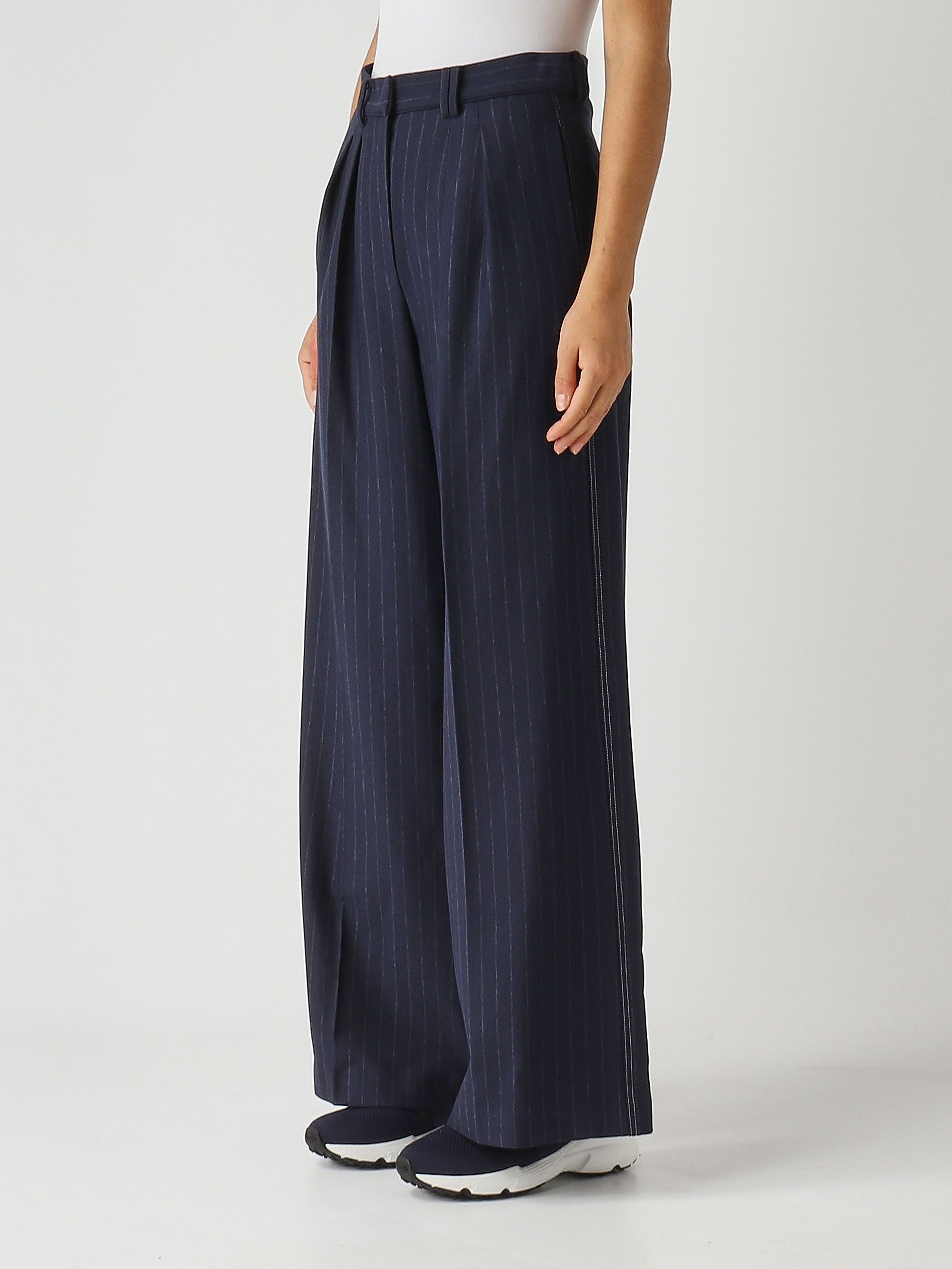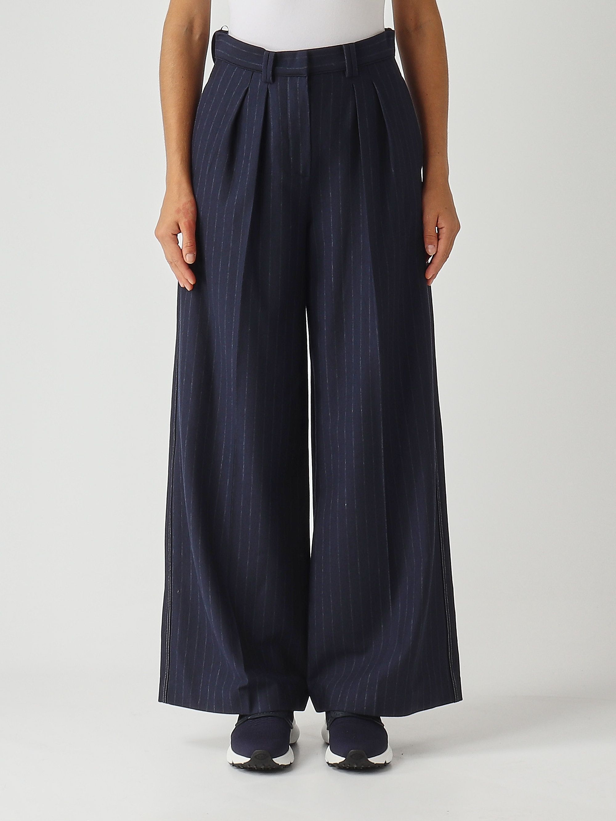 Characterized by a wide leg fit emphasized by pleats at the waist, they feature a button and zip closure, belt loops, front and back seam pockets.