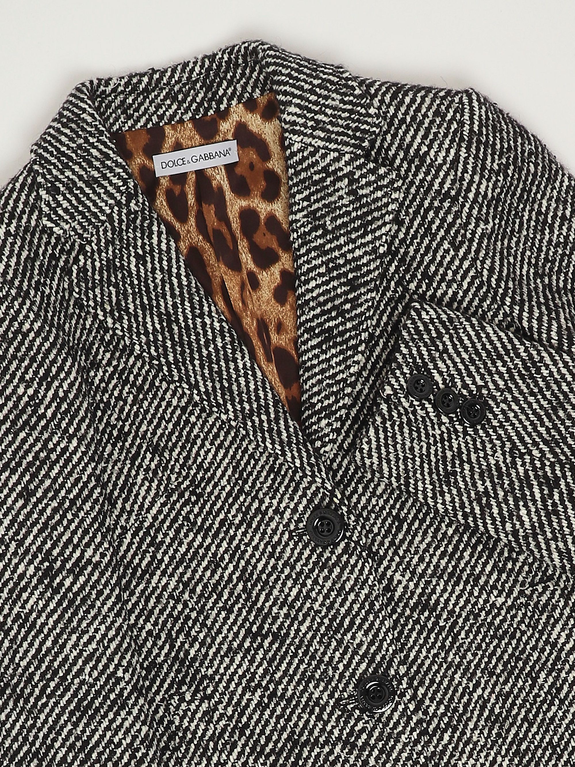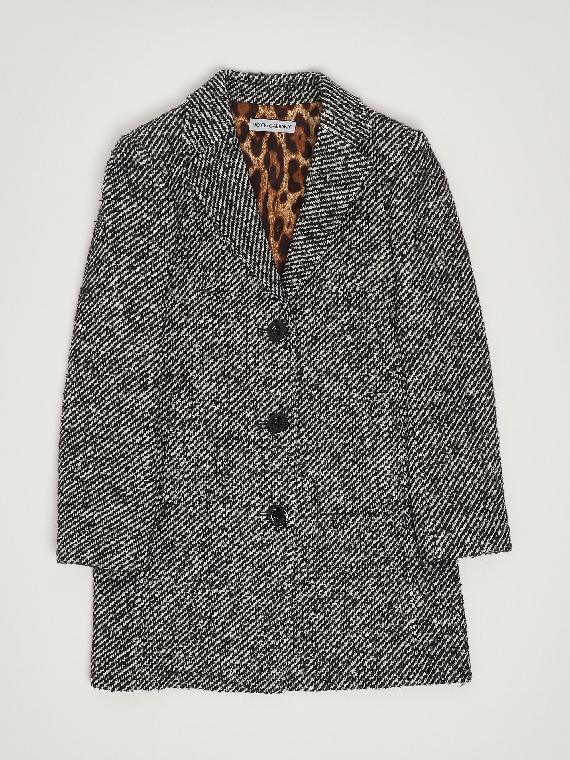 This wool-silk blend coat features a single-breasted three-button closure, a classic lapel collar, and a spotted lined interior.
