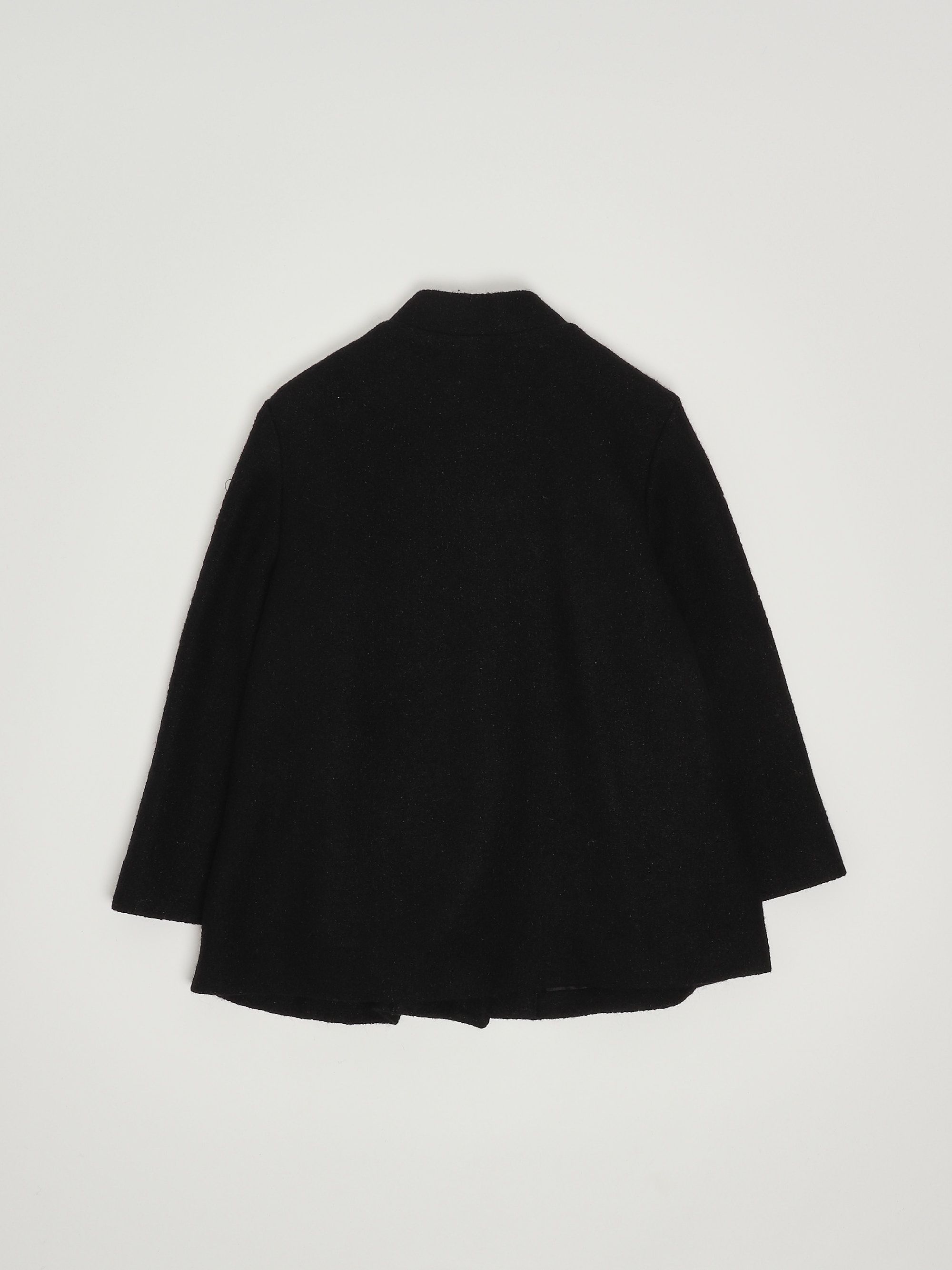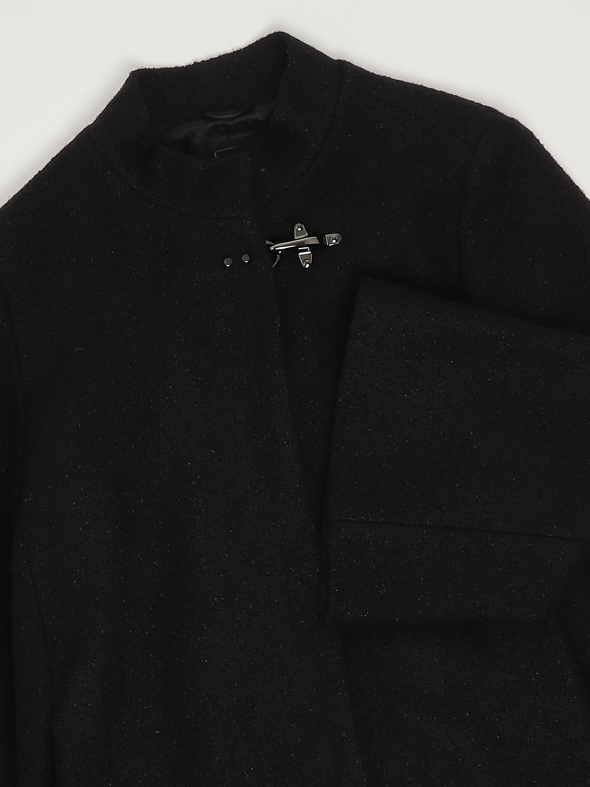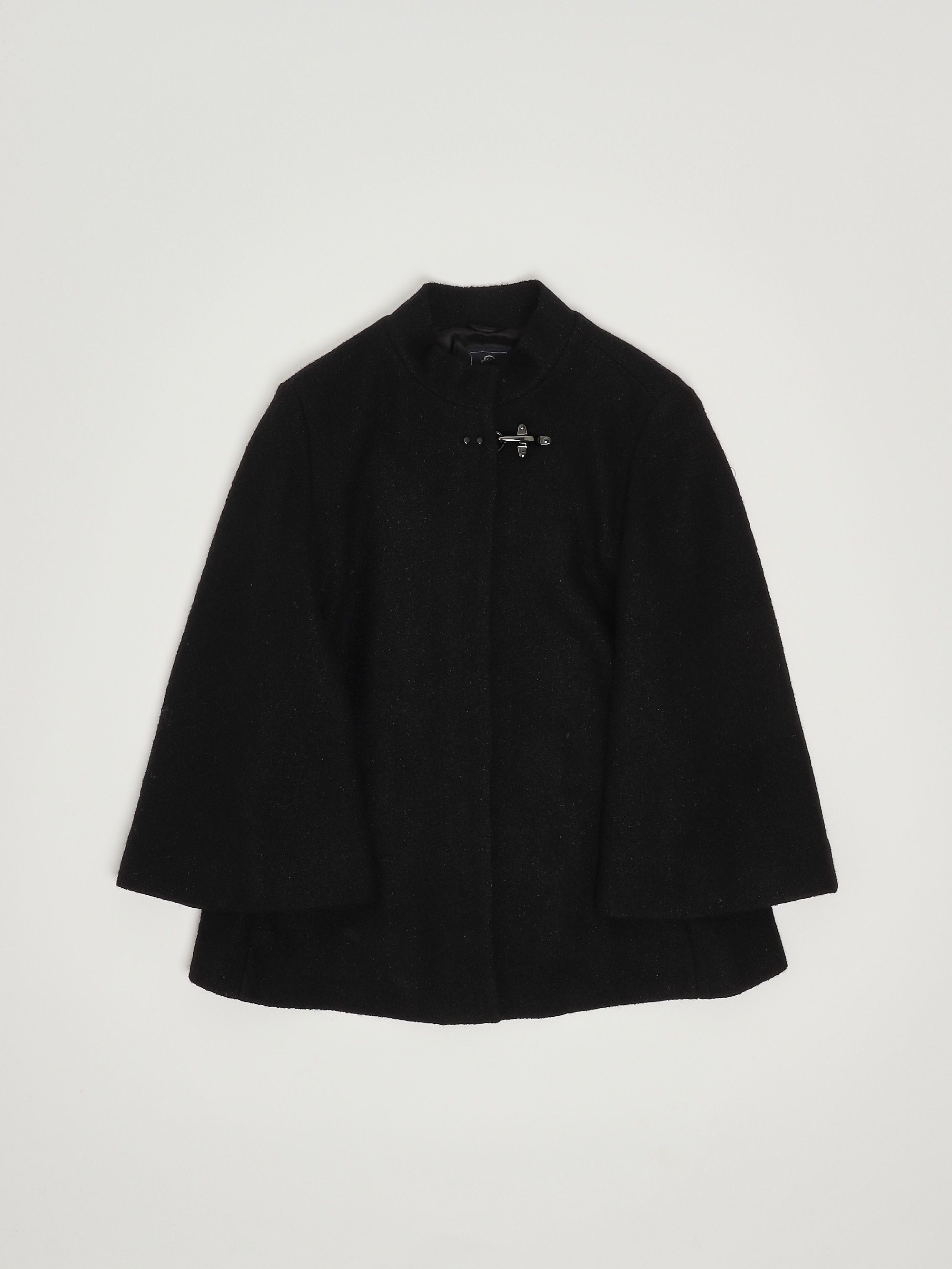 Made from a wool blend, this cape features a front closure with iconic hook and eye and snap buttons, a mandarin collar, 3/4 bell sleeves, and two side slit pockets.