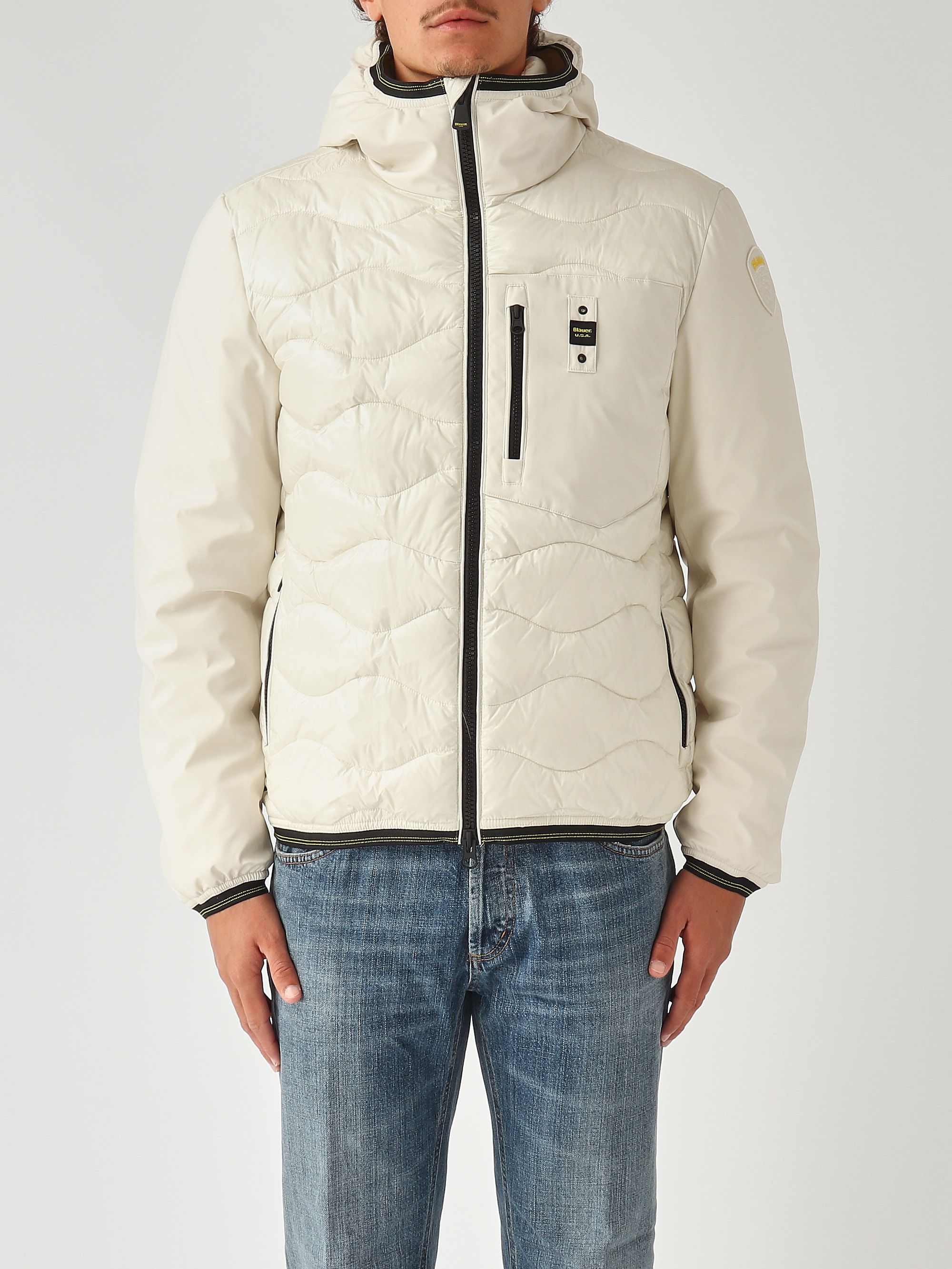 La doudoune Albert se démarque par son design en néoprène léger et lisse sur les manches et en nylon brillant piqué à ondes sur le reste du corps. Elle dispose également d'un rembourrage mixte conçu pour garder au chaud même dans des conditions météorologiques défavorables. Elle est dotée d'une capuche fixe, d'une fermeture éclair, de poches latérales zippées, dont une verticale sur la poitrine gauche et d'un élastique rayé sur le contour de la capuche, du poignet et du bas.