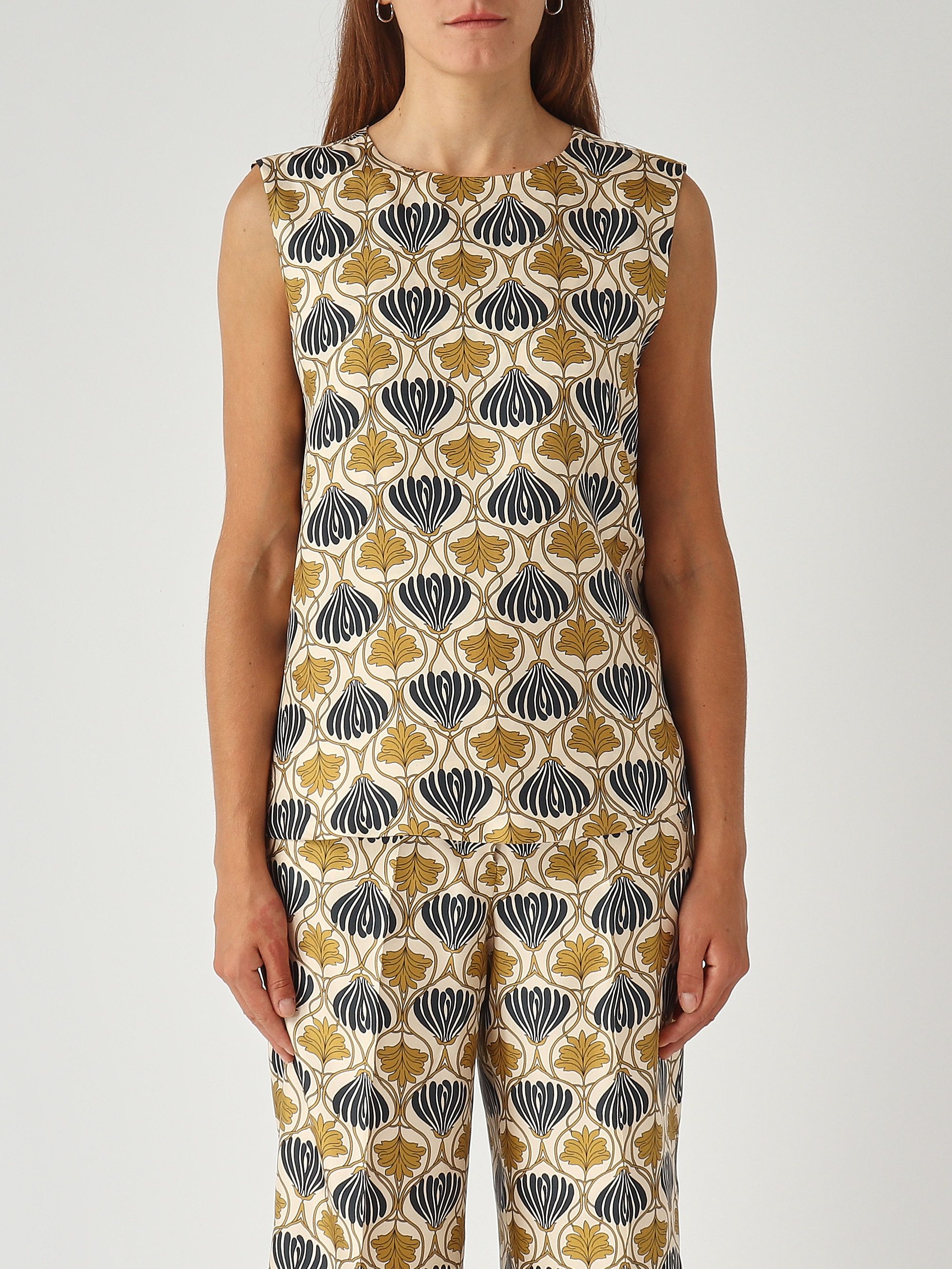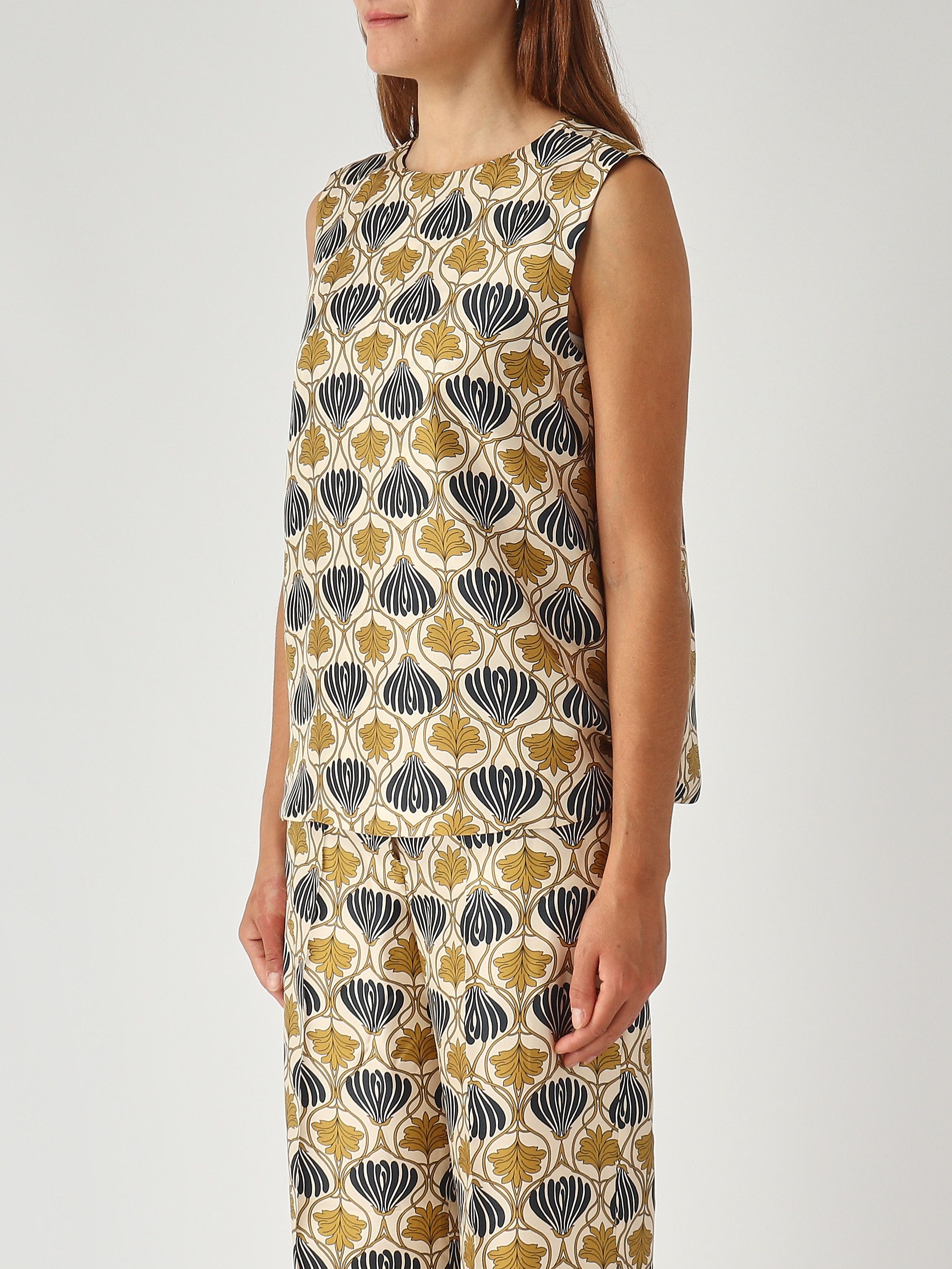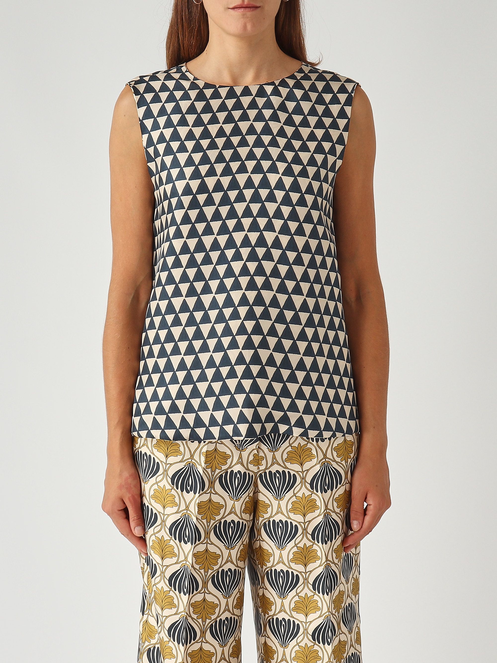 Sophistiqué et polyvalent, ce haut se démarque par son design réversible qui révèle un motif floral d'un côté et un motif géométrique de l'autre. Confectionné en twill de pur soie, il présente une ligne droite, un col rond avec une petite coupe en V à l'arrière et de petites fentes latérales au bas.