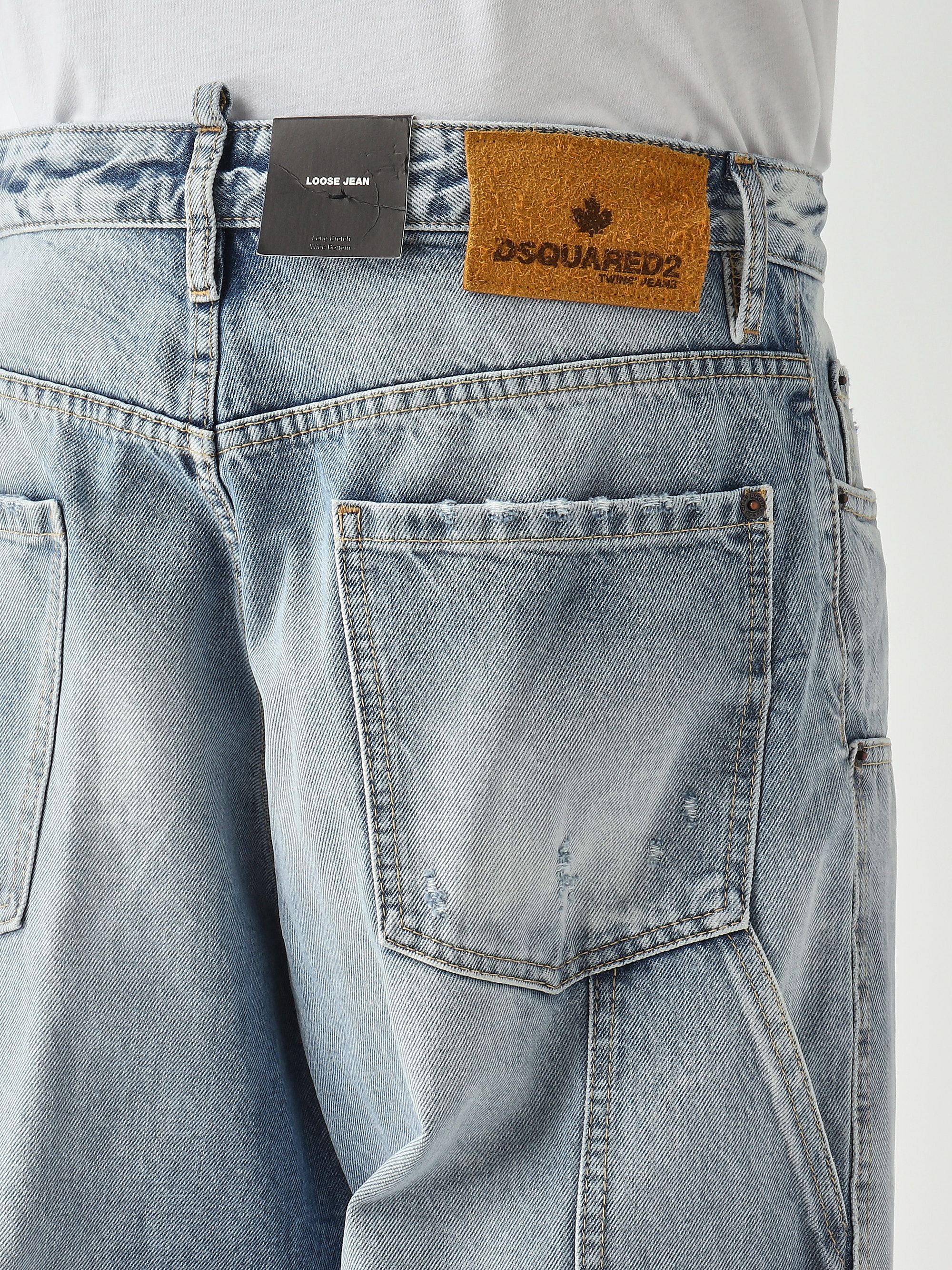 Ce jean en coton ample et ample présente un traitement vieilli avec une usure localisée et des moustaches pour un effet usé, une fermeture à glissière et à bouton, cinq poches, des patchs cousus sur le devant de la jambe et des passants de ceinture.
