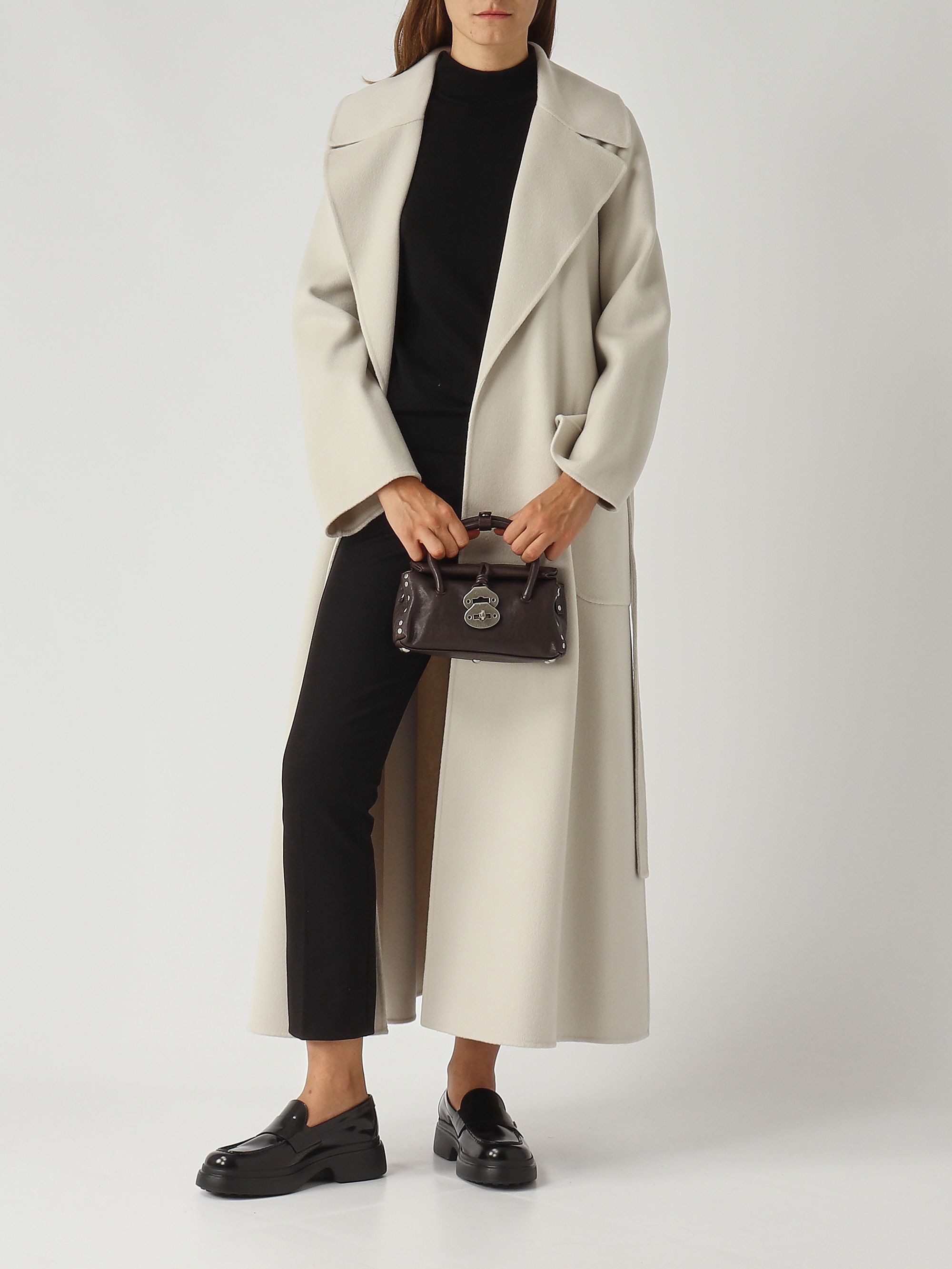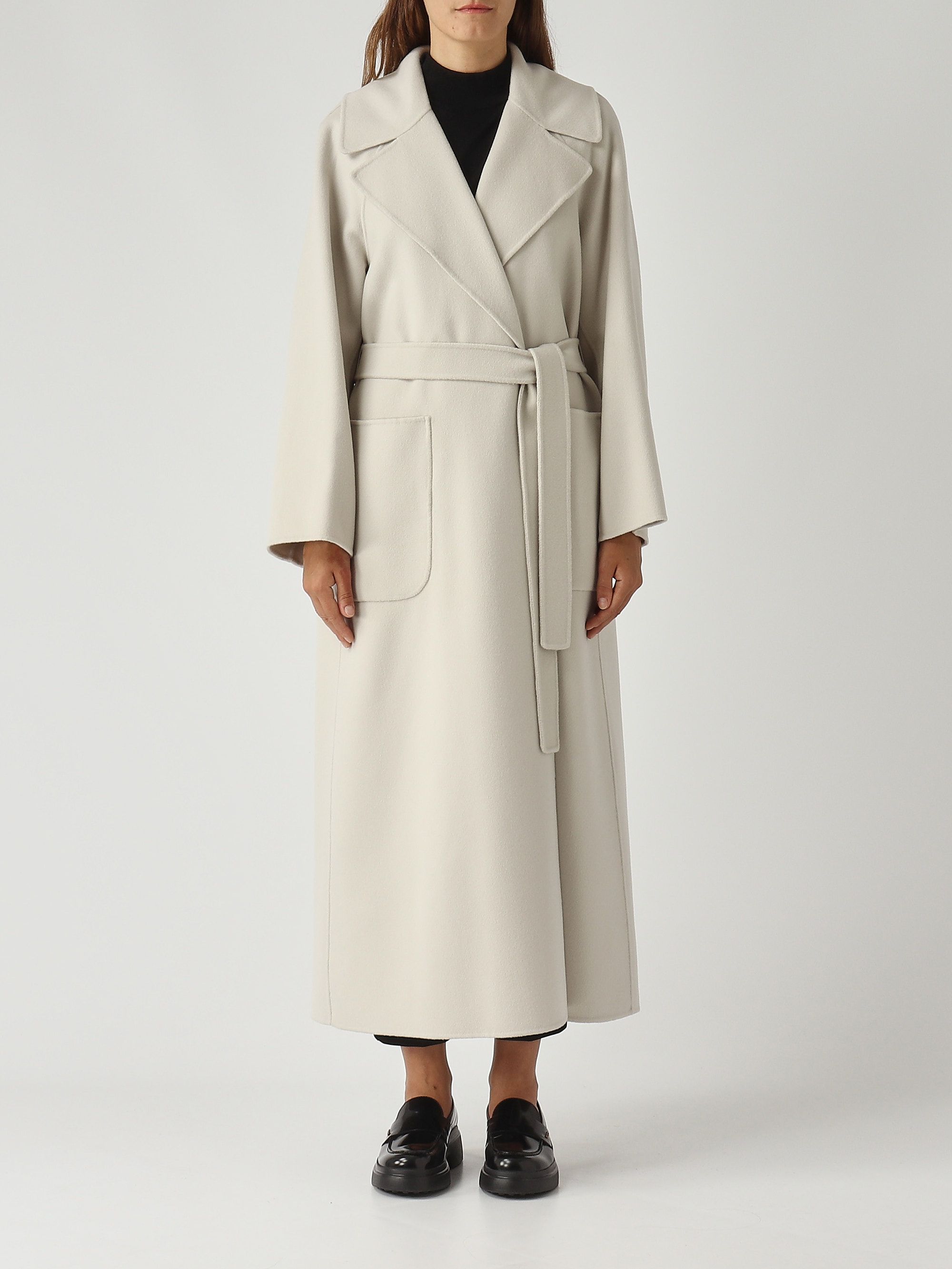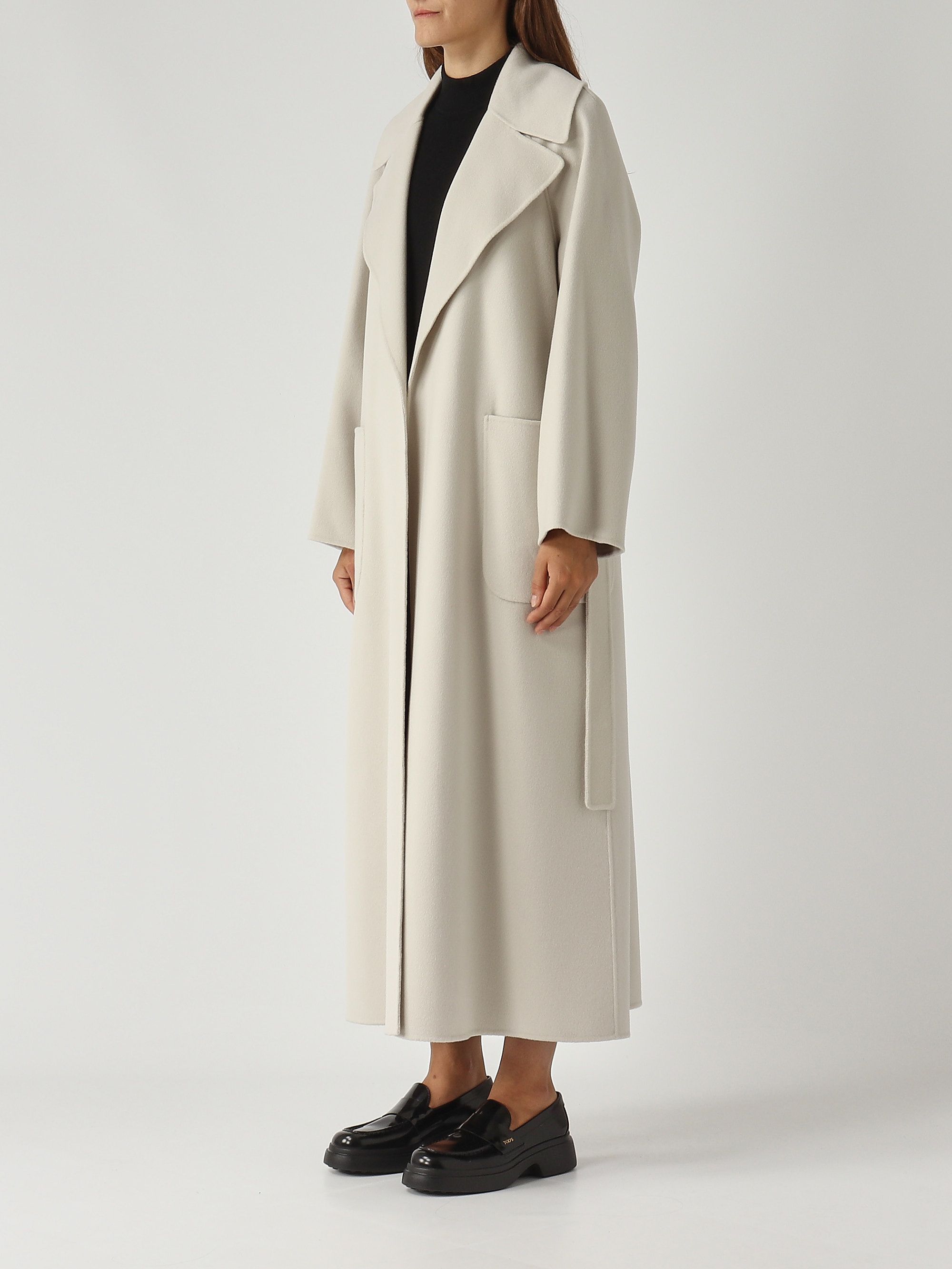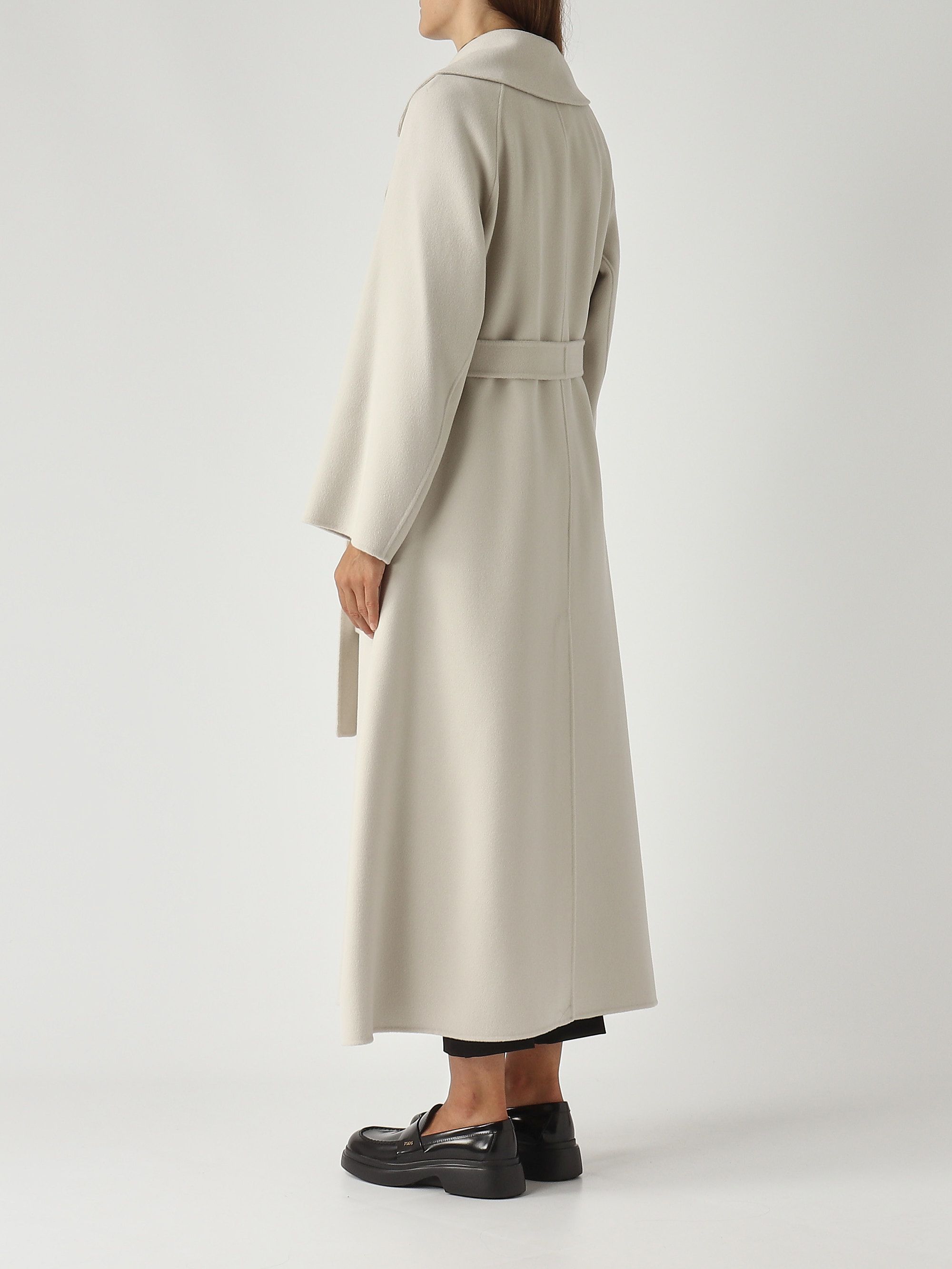 Ce manteau long se démarque par sa silhouette enveloppante inspirée d'une robe de chambre. Confectionné en double tissu de pure laine, il est entièrement cousu à la main. Il présente un large col à revers, de longues manches raglan, une fermeture par ceinture assortie, des poches plaquées sur le devant et une fente centrale au dos.