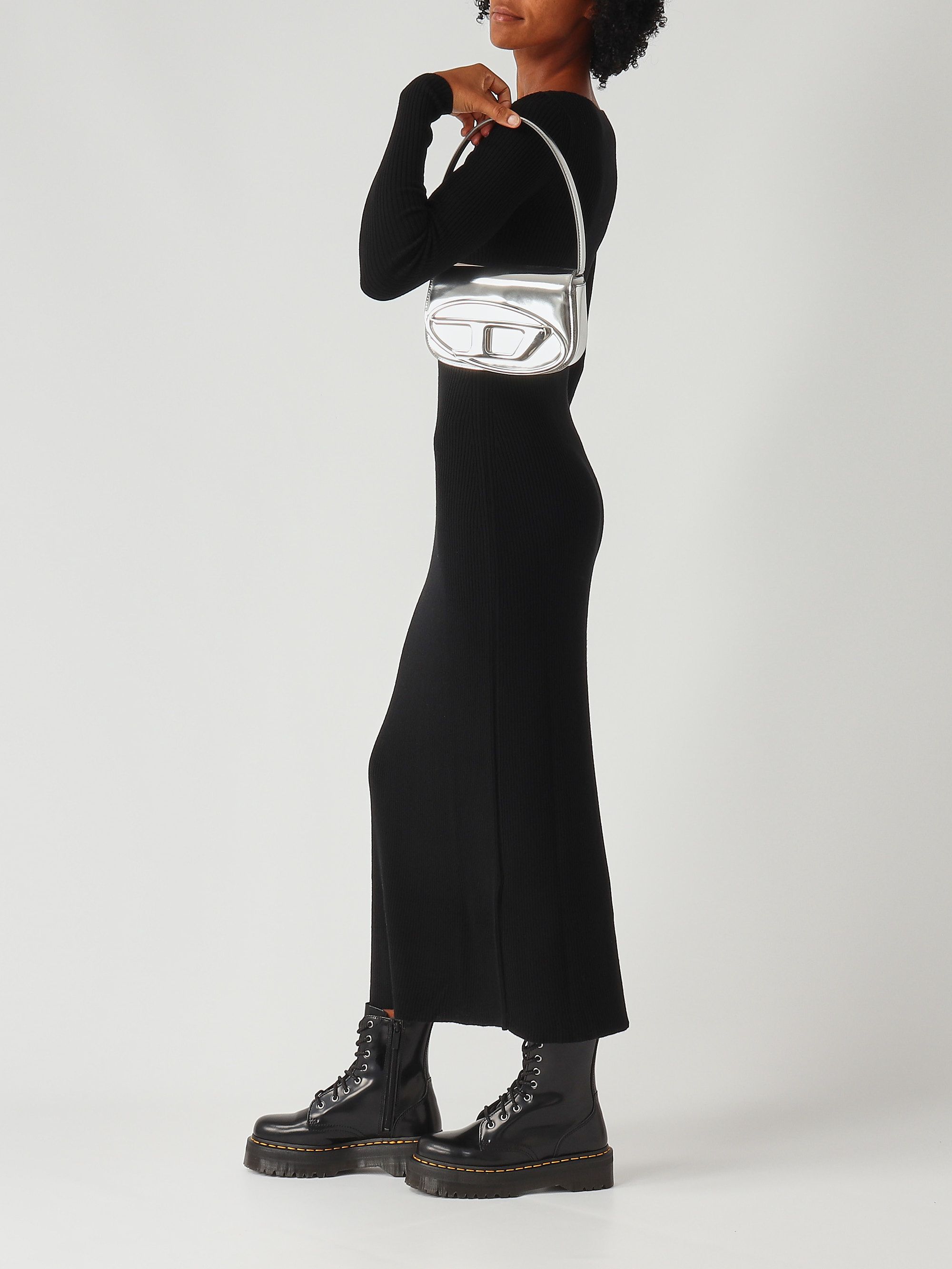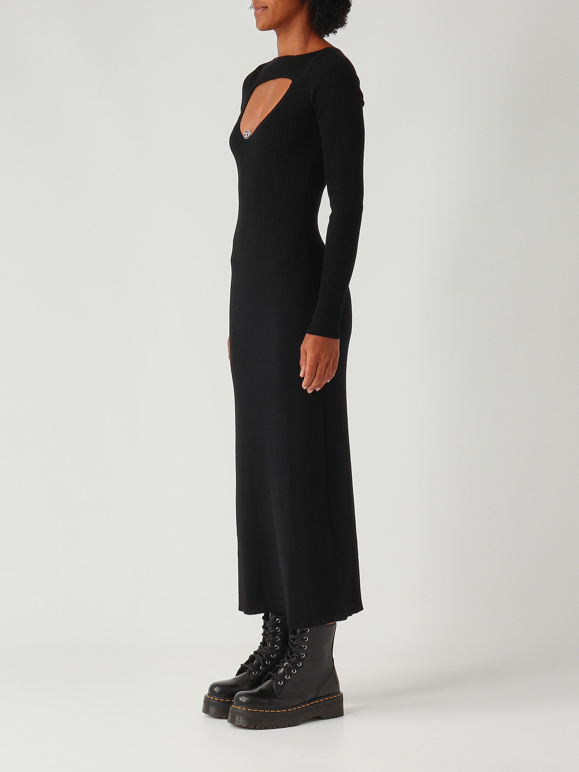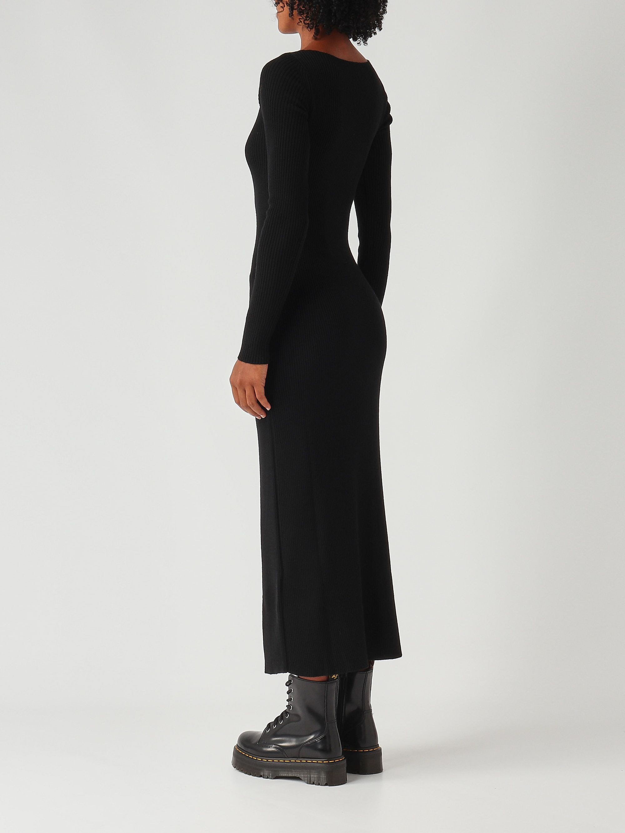 Cette robe midi en laine à manches longues, à la coupe régulière et à la silhouette ajustée, est confectionnée en tissu côtelé et présente une incrustation triangulaire sur l'encolure, avec le logo Oval D dans le coin inférieur de la découpe.