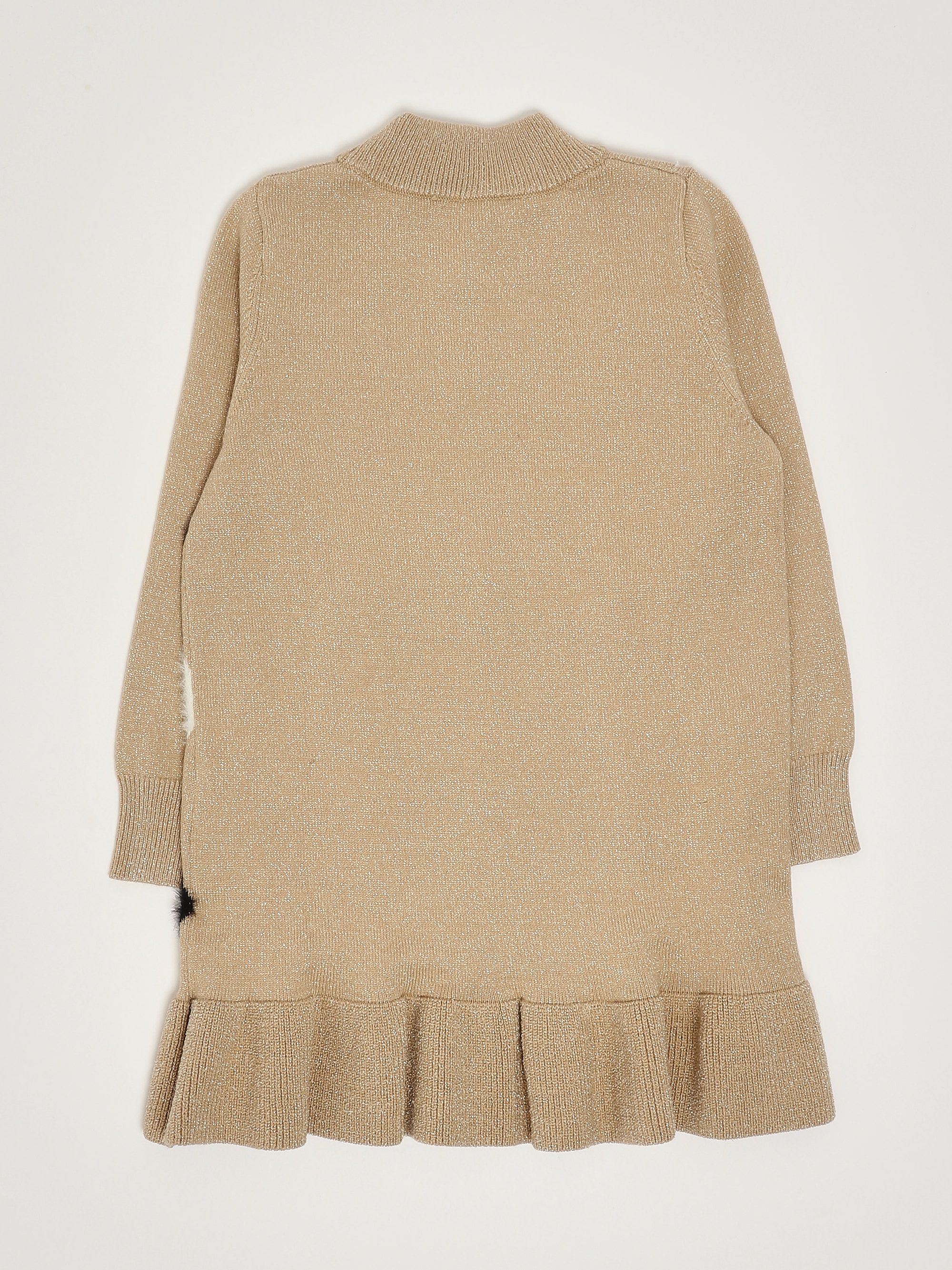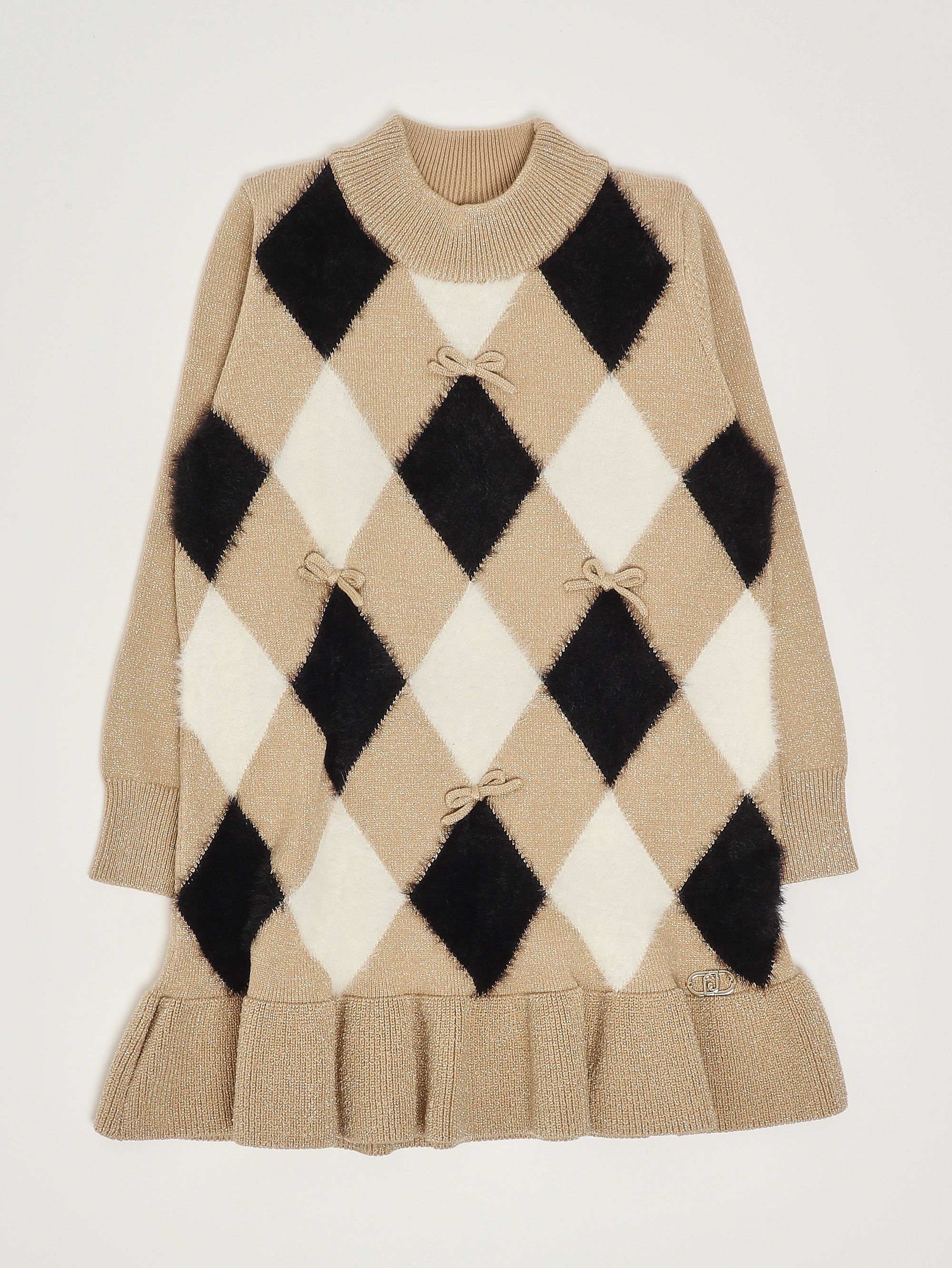 Realizzato in misto viscosa stretch, questo abito a maniche lunghe vanta una lavorazione in maglia lurex con motivo geometrico romboidale e un design con orlo ondulato, mini fiocchi applicati sul davanti, collo a lupetto e orlo e polsi a costine.