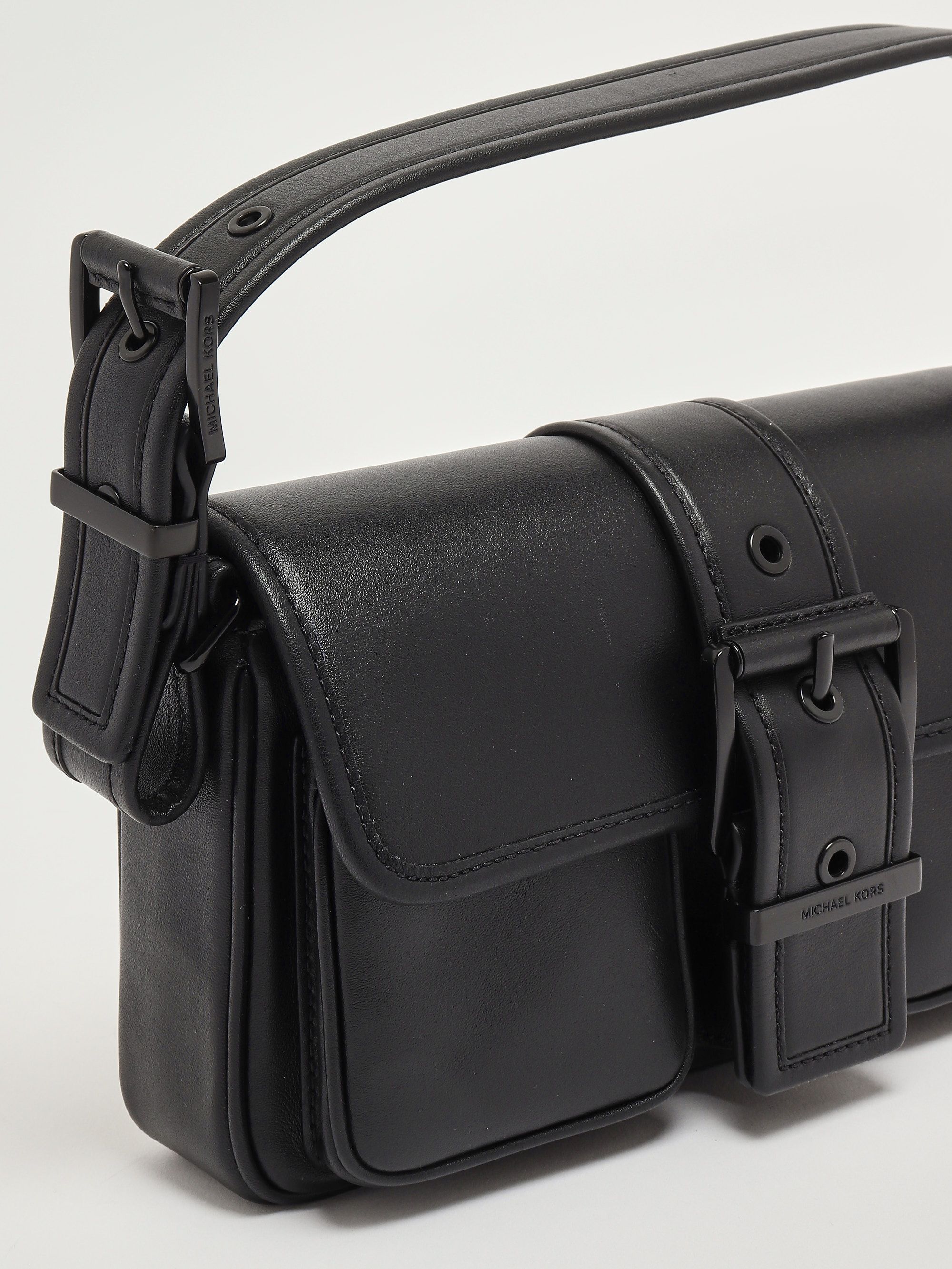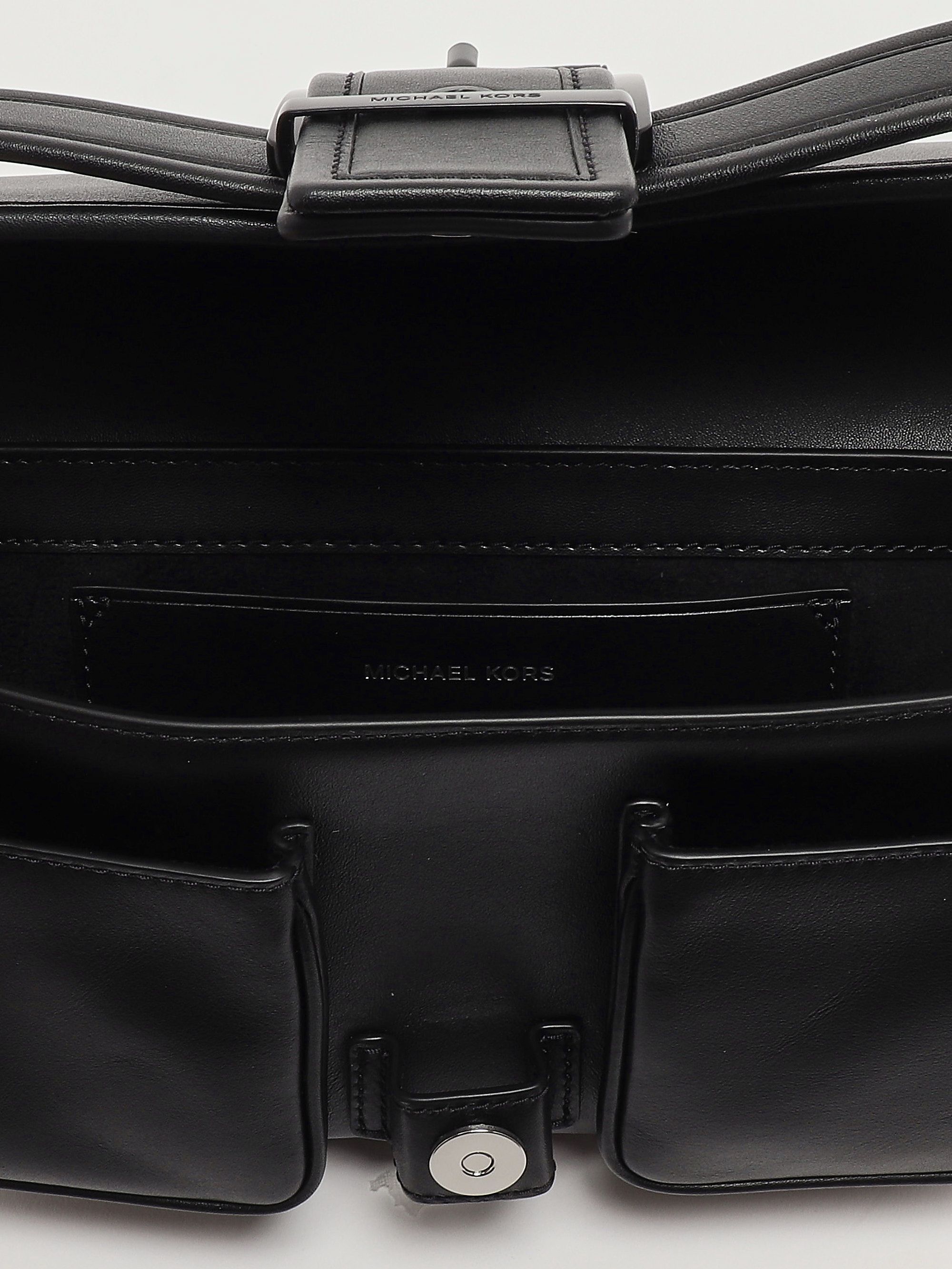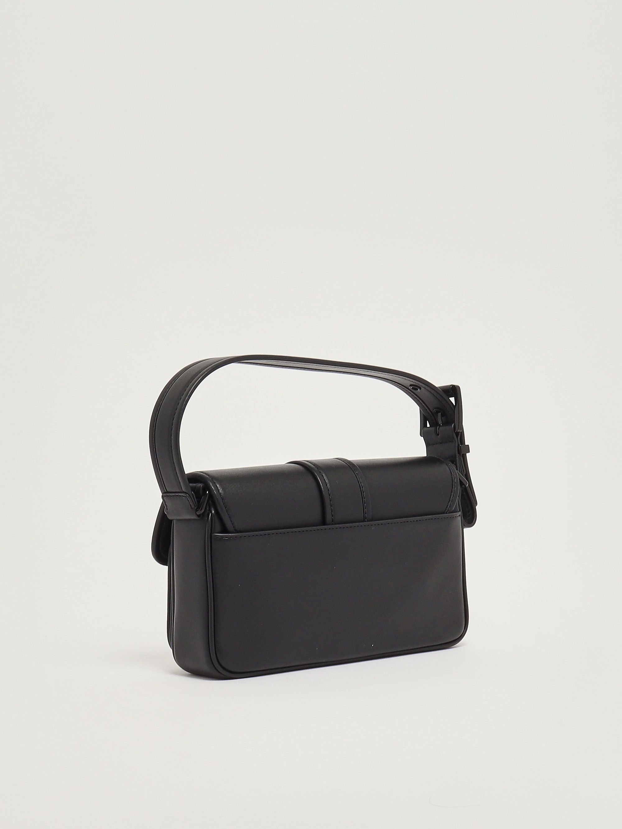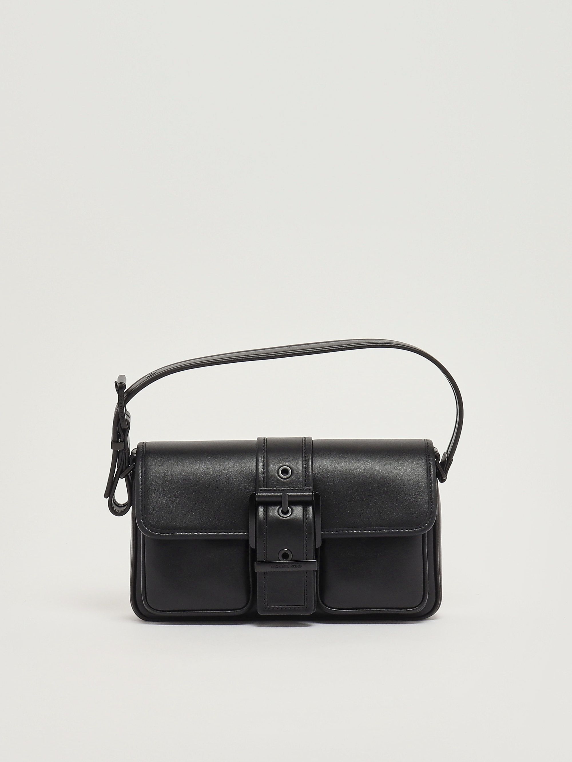 Realizzata in pelle, questa borsa presenta un'elegante silhouette rettangolare con un dettaglio composto da cinturino e fibbia, un manico superiore regolabile, una chiusura con patta e bottone magnetico e una tasca interna con cerniera.