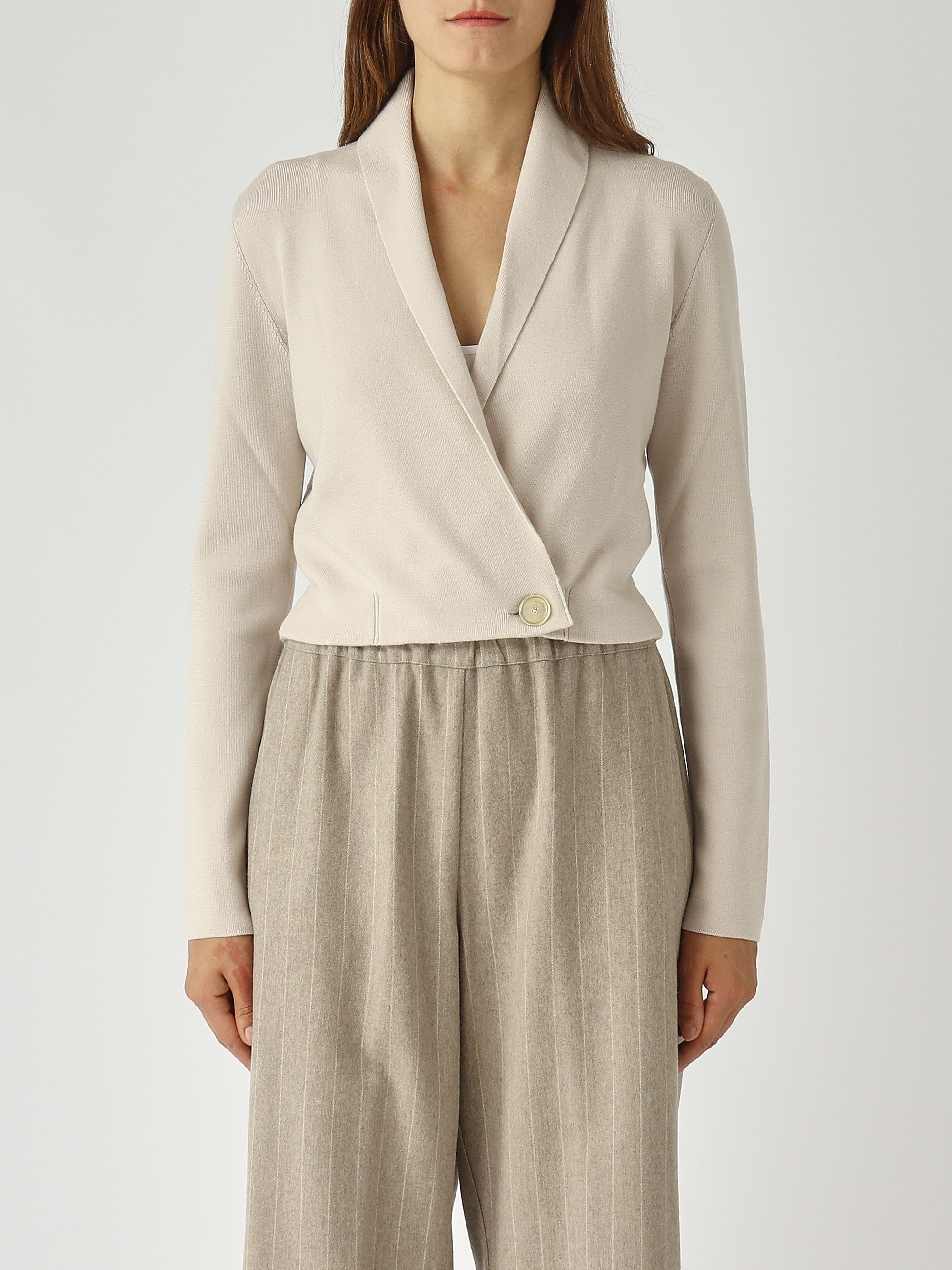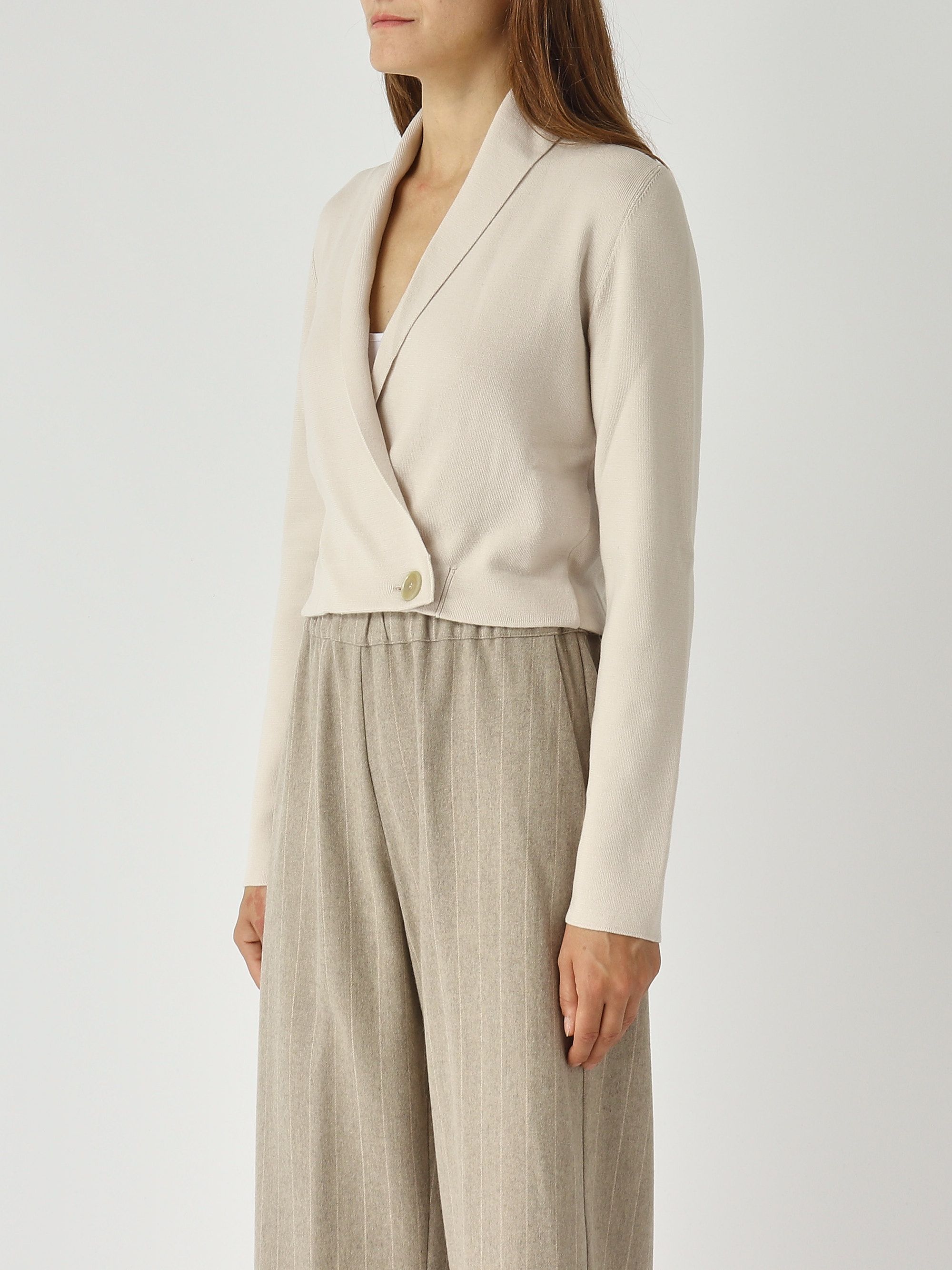 Liviana Conti propone un capo passpartout per l'inverno, il cardigan Lauren in misto cashmere, ha una chiusura doppiopetto con mono bottone, scollo con revers a scialle e presenta un design cropped ideale da indossare con pantaloni a vita alta.