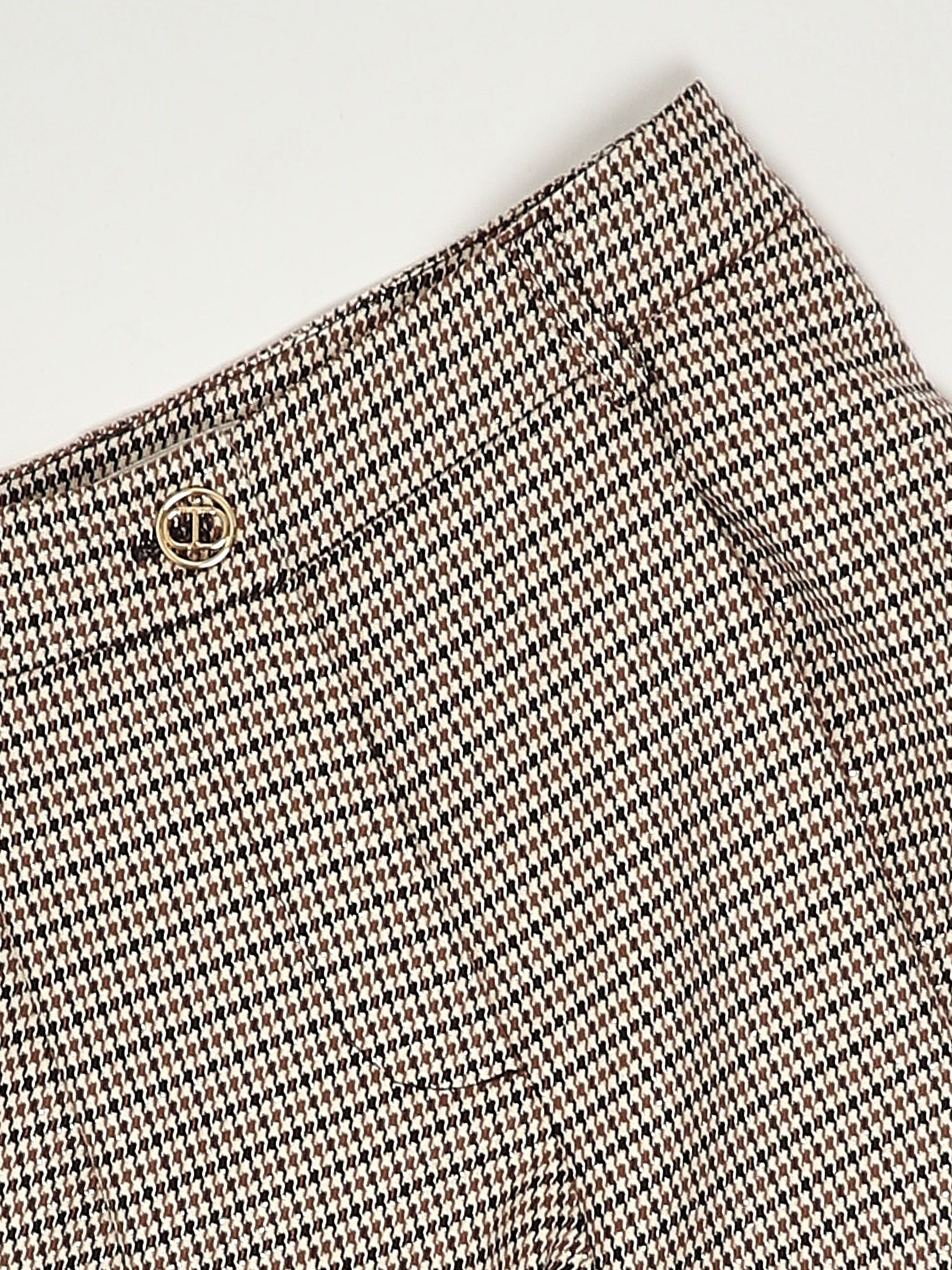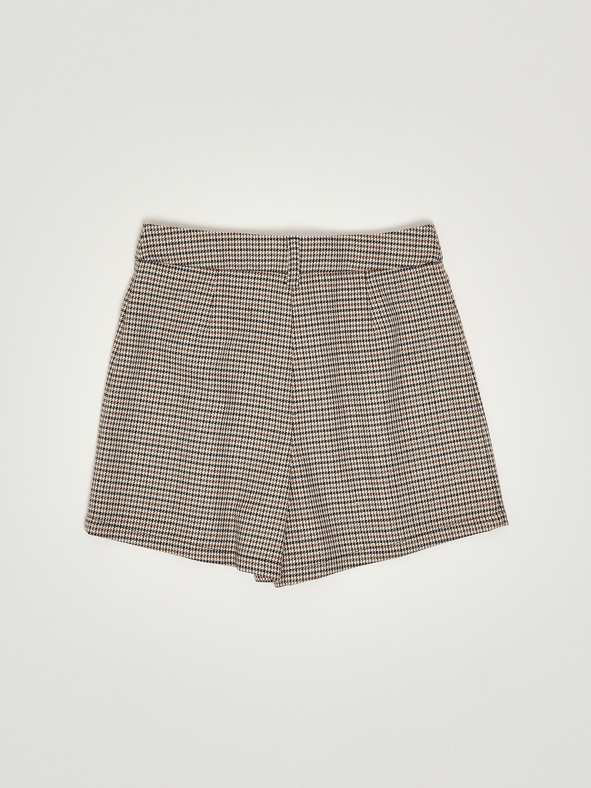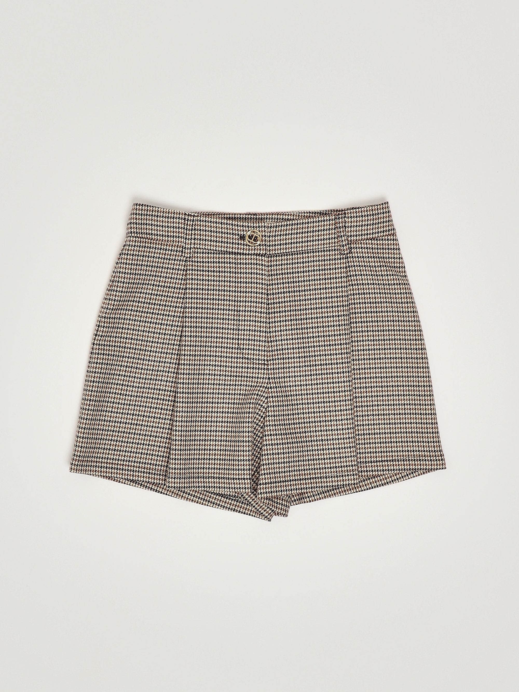 Realizzati in viscosa stretch, questi pantaloncini si presentano con una fantasia pied de poule, una vita definita da chiusura con cerniera e bottone logato e passanti per cintura e pinces anteriori.