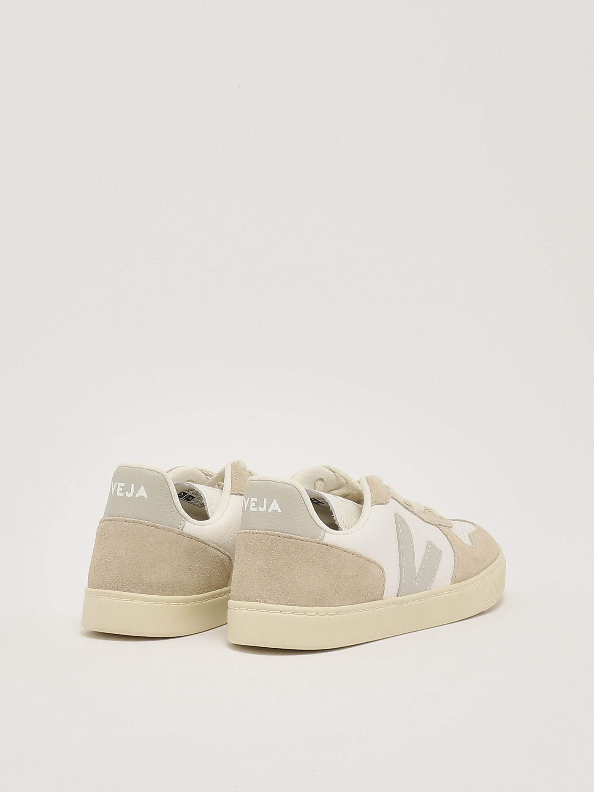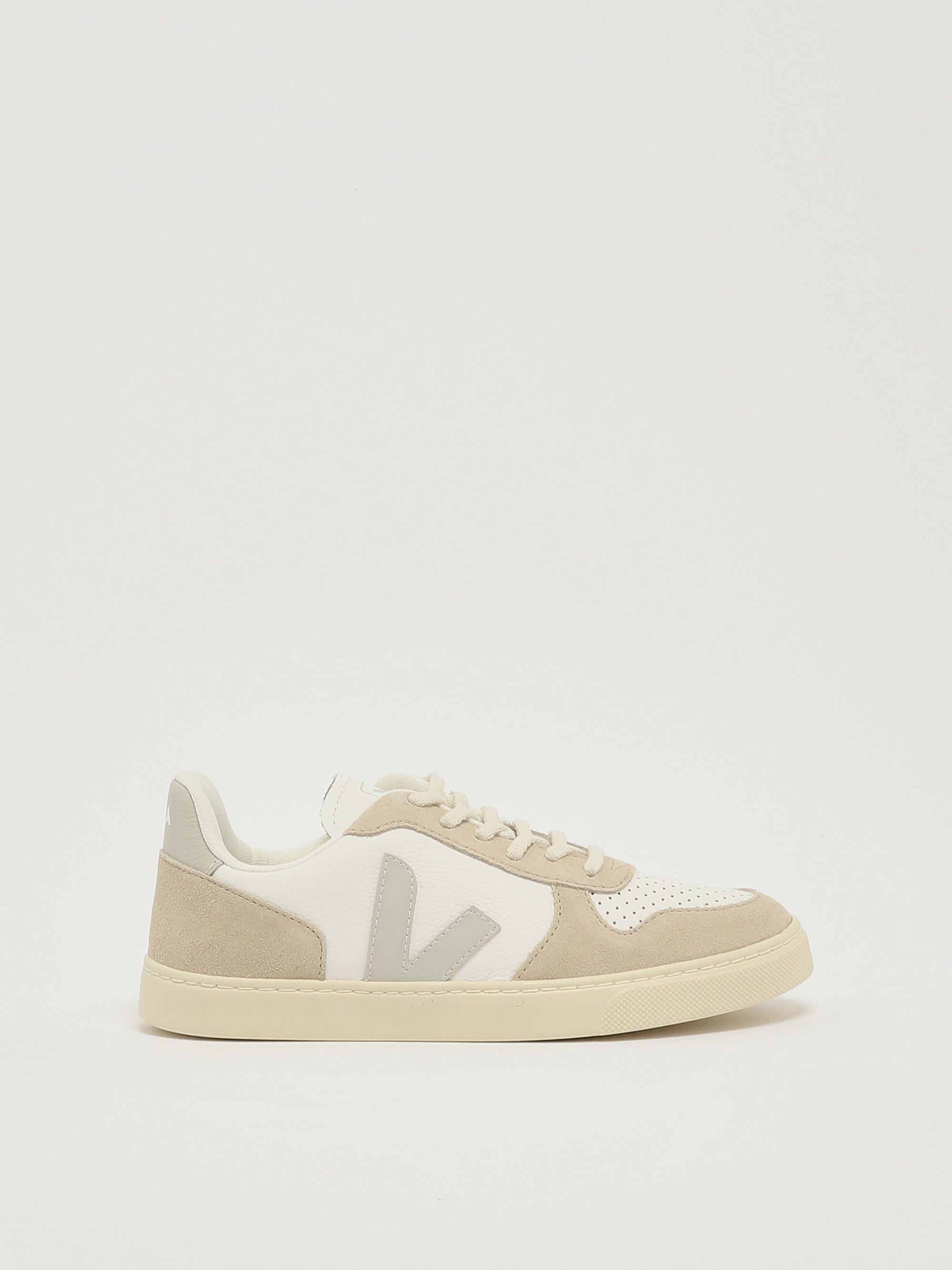 Iconiche e rispettose dell'ambiente, le sneakers Veja coniugano progetti sociali e materiali ecologici. Realizzate in una combinazione di pelle senza cromo e suede, il modello Small V-10 si presenta con una tomaia multicolor, una punta tonda traforata, una chiusura frontale con lacci e una suola bassa ma non piatta.
